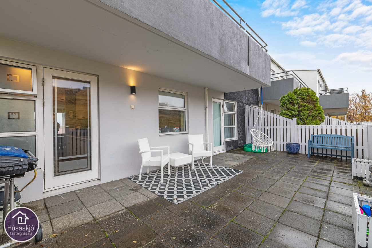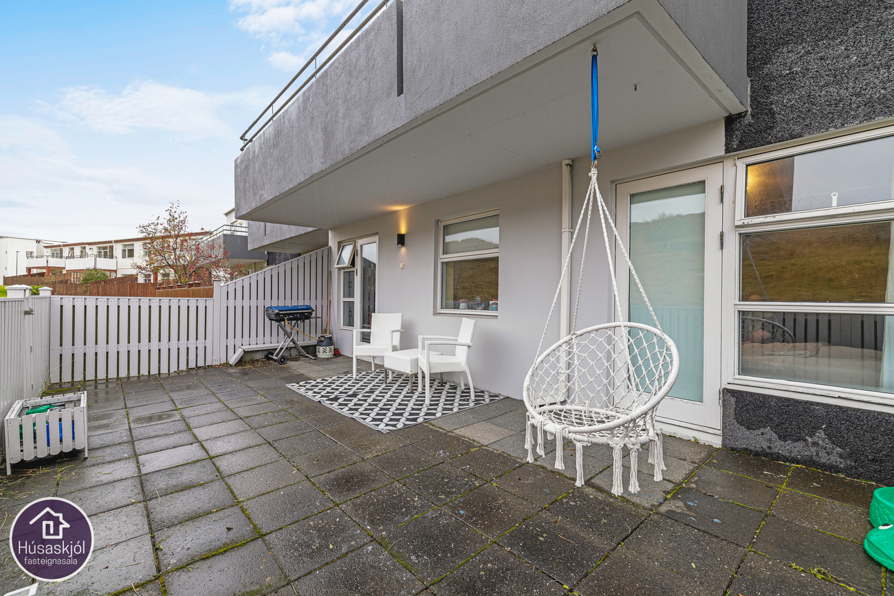 Eldhús er með innréttingu á 2 veggjum og þaðan er gengið út á mjög stóra hellulagða verönd. Veröndin snýr að óbyggðri brekku sem er friðuð að sögn seljenda. Mikið næði á veröndinni.