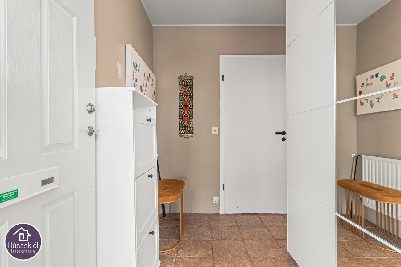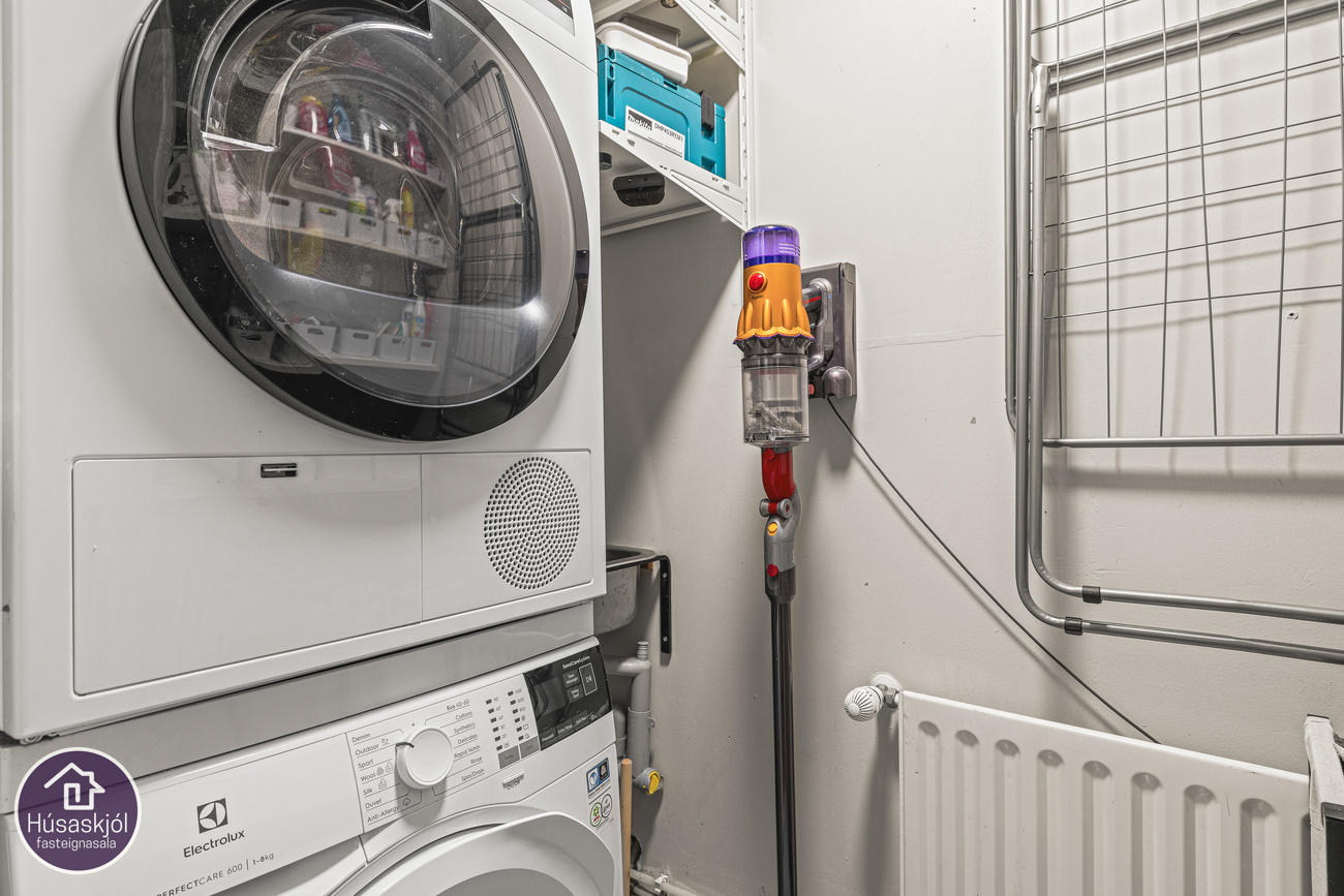 Gengið er inn um sérinngang í flísalagða forstofu með skáp. Úr forstofu er gengið í þvottahús með hillum.