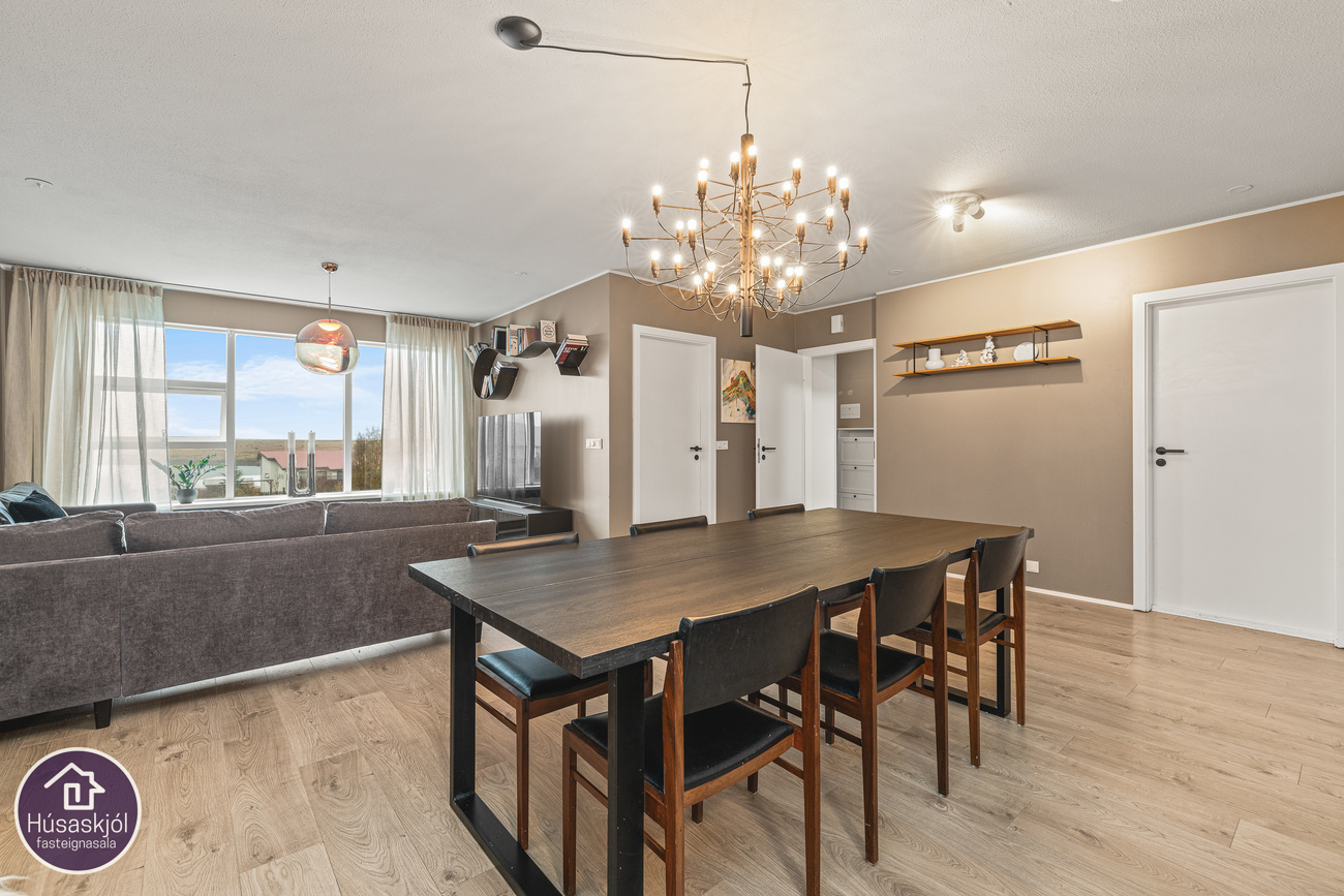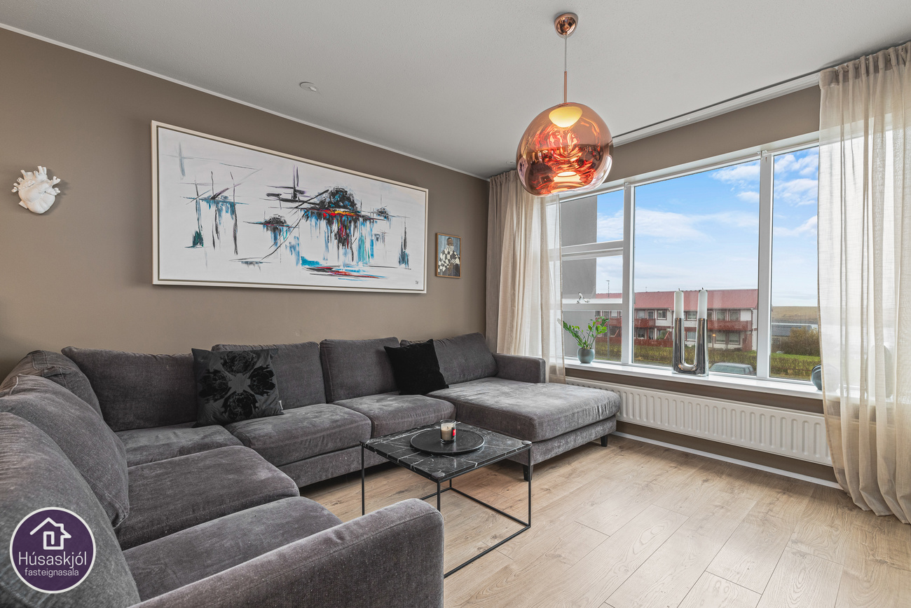 Alrýmið er hjartað í íbúðinni. Mjög rúmgóð stofa með sjávarútsýni. Harðparket á gólfum.