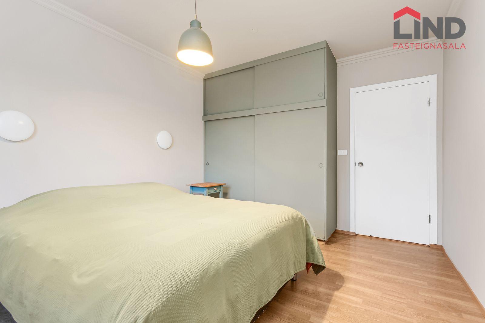 Svefnherbergið er með fataskáp og parketi á gólfi.
