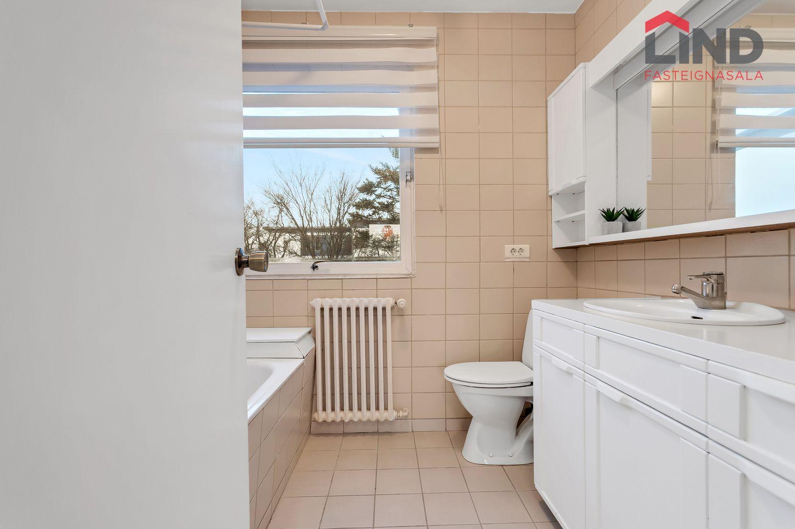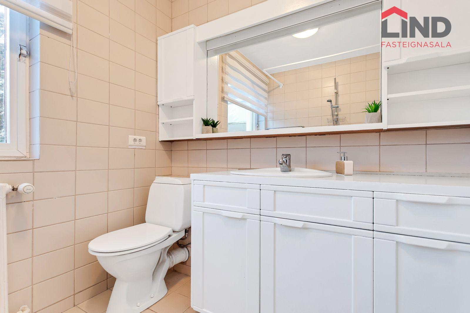Baðherbergið er með innréttingu undir og við handlaug, baðkari, salerni, ofni, opnanlegum glugga og flísum á gólfi og veggjum.