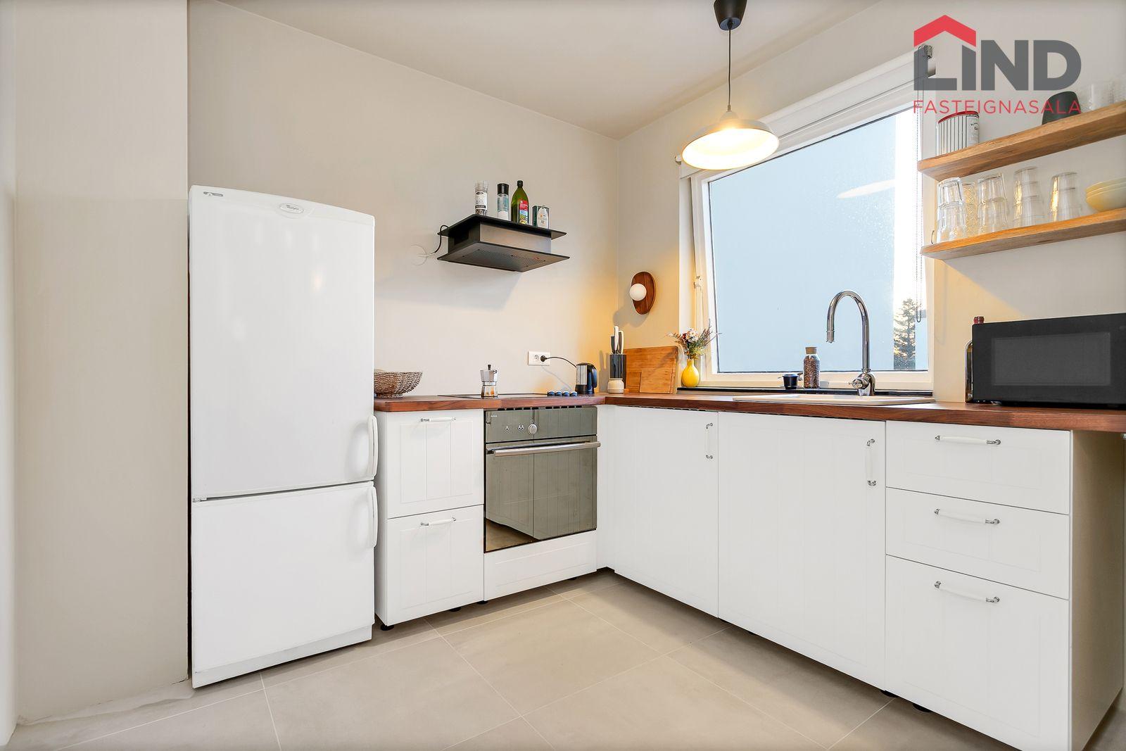 Eldhús með nýrri hvítri innréttingu með neðri skápum, Innréttingin var sett upp í nóvember á þessu ári. Bakaraoofn og helluborð. Ljósar flísar á gólfi, nettur borðkrókur og opnanlegur gluggi.