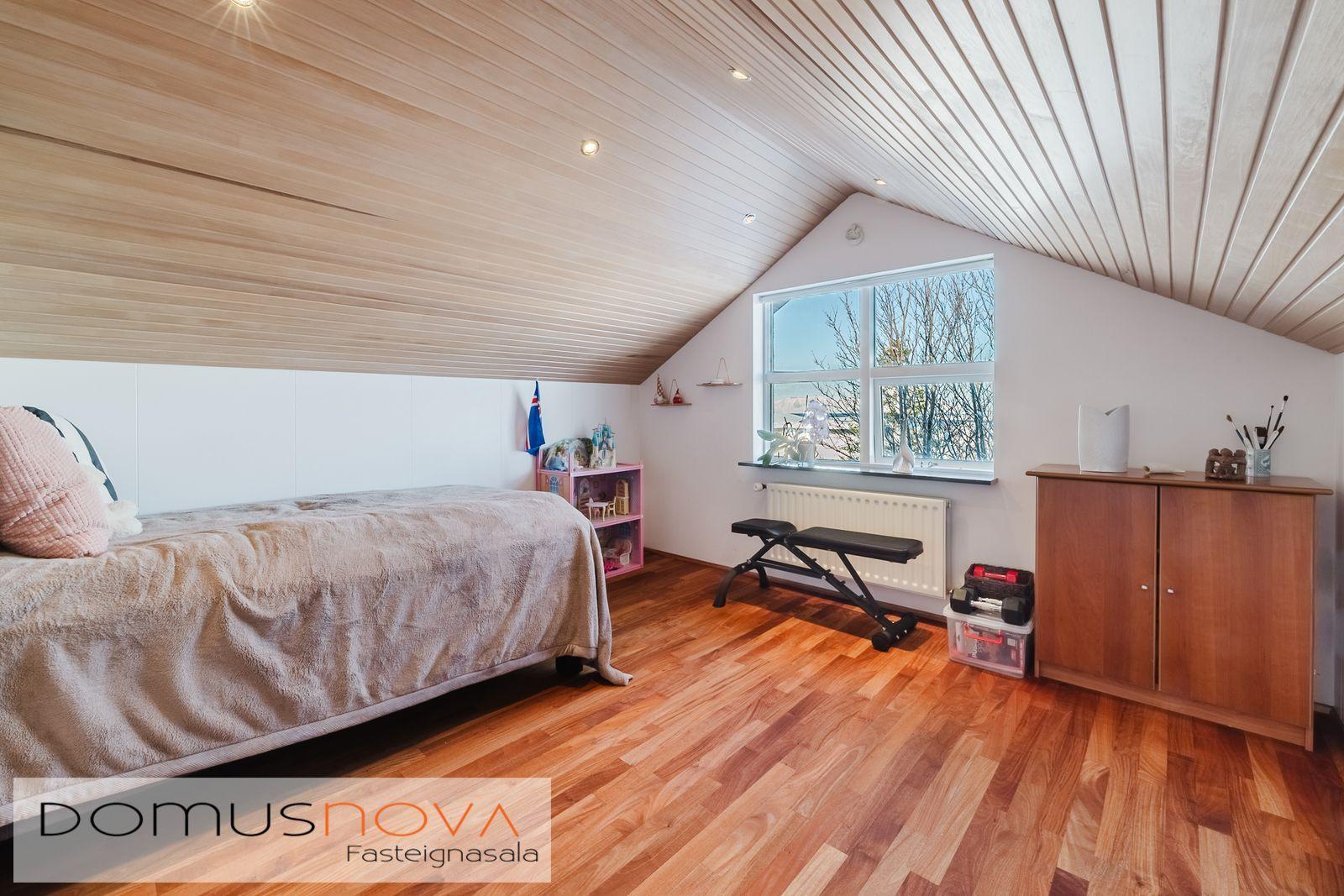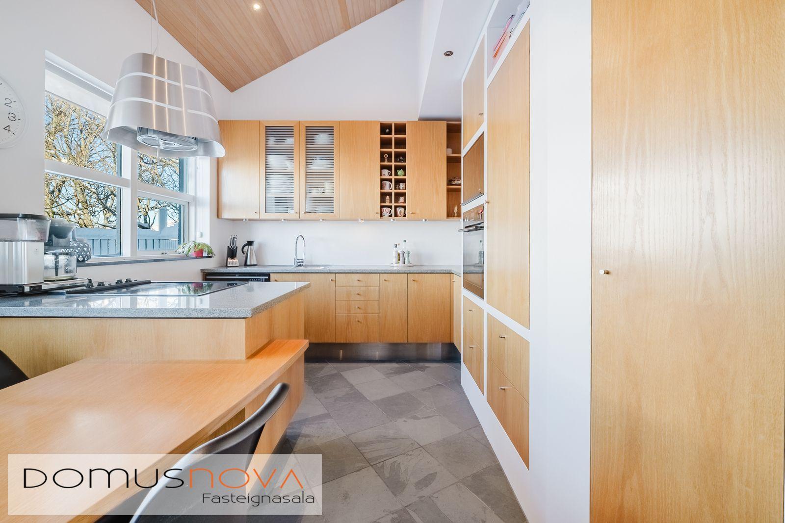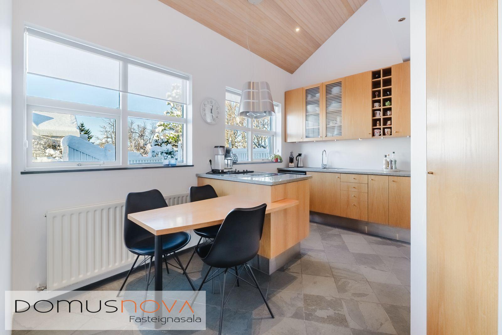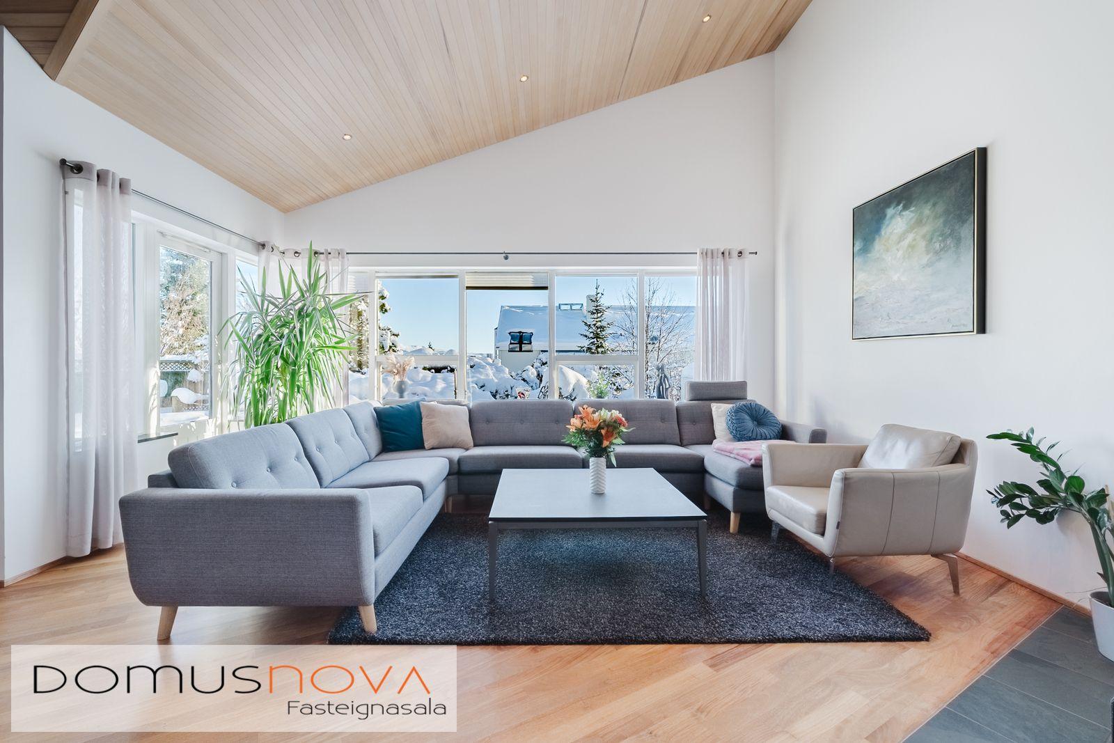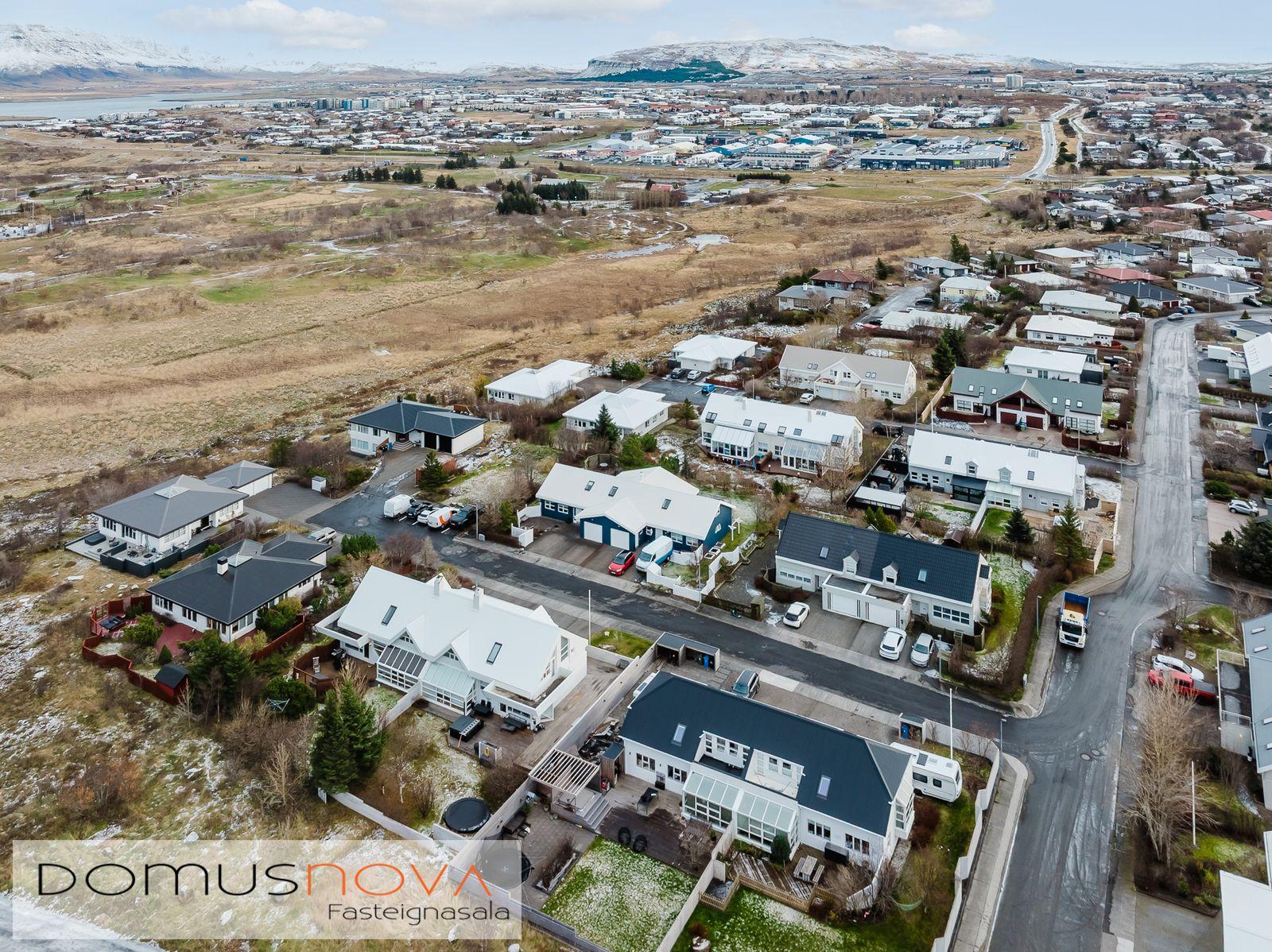 Lýsing eignar: Aðkoma:Húsið er innarlega í rólegum botnlanga. Fyrir framan húsið má með góðu móti leggja þremur bílum. Einnig rúmgott svæði fyrir setuaðstöðu fyrir framan hús. Forstofa: Flísalögð forstofa með fallegum dökkum náttúru steinflísum og góðu skápaplássi. Þvottahús: Innaf forstofu er gengið inn í þvottahús. Þar er stæði fyrir þvottavél og þurrkara. Fínt vinnupláss og góð innrétting. Opnanlegur gluggi. Flísar á gólfi. Eldhús:Mjög vönduð innrétting. Mikið skápa og borðpláss. Granítplötur á borðum. Innfelld uppþottavél og ísskápur ásamt bakaraofni í vinnuhæð. Borðkrókur er í eldhúsinu. Háfur yfir eyju. Stórir gluggar og flísar á gólfi. Baðherbergi:Innrétting með ágætis geymsluplássi. Granítplata á borði. Baðkar og sér sturtuklefi. Handklæðaofn og upphengt salerni. Flísar á gólfi og opnanlegur gluggi. Stofa/borðstofa: Alrýmið er einstaklega fallegt með mjög mikilli lofthæð. Á gólfum er parket og náttúru steinflísar á gólfi. Arinn með íslensku grágrýti í eldhólfi og á syllu. Stórir gluggar á alrýminu gefa fallega sýn. Útgengt frá stofu út á verönd/garð. Svefnherbergi I:Á neðri hæðinni er hjónaherbergið. Það er parketlagt með góðum fataskáp. Svefnherbergi II:Búið er að breyta alrýminu og nýtist þetta svefnherbergi sem hluti af alrýminu í dag. Þessu rými væri hægt að breyta aftur í svefnherbergi. Svefnherbergi III: Þetta herbergi er á efri hæðinni. Rúmgott herbergi. Parket á gólfi. Mikið útsýni til norðurs. Í herberginu er gott geymslurými undir súð sem er lokað af. Efri hæð:Nýtist í dag sem sjónvarpsrými, vinnuaðstaða og svefnherbergi. Undir súð er gott geymslurými. Bílskúr:Mjög snyrtilegur. Heitt og kalt vatn. Opnanlegur gluggi. Rafmagnsopnari á bílskúrshurð. Gott geymsluloft.