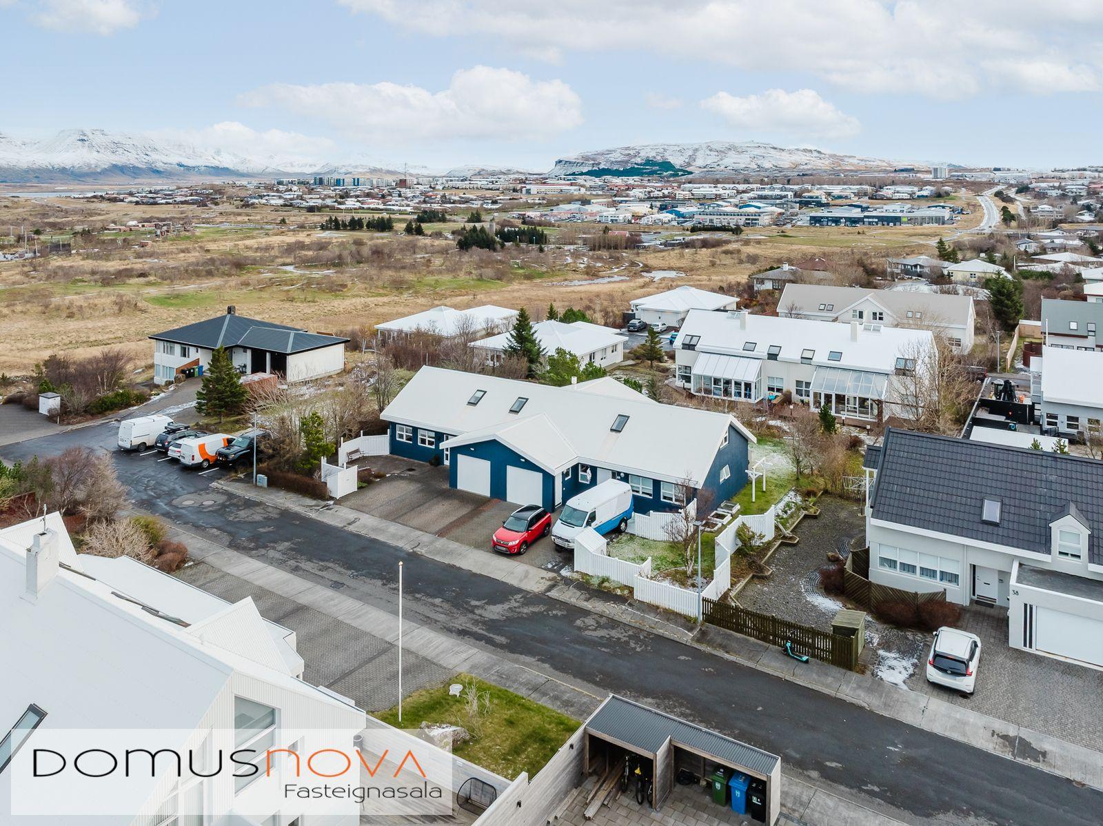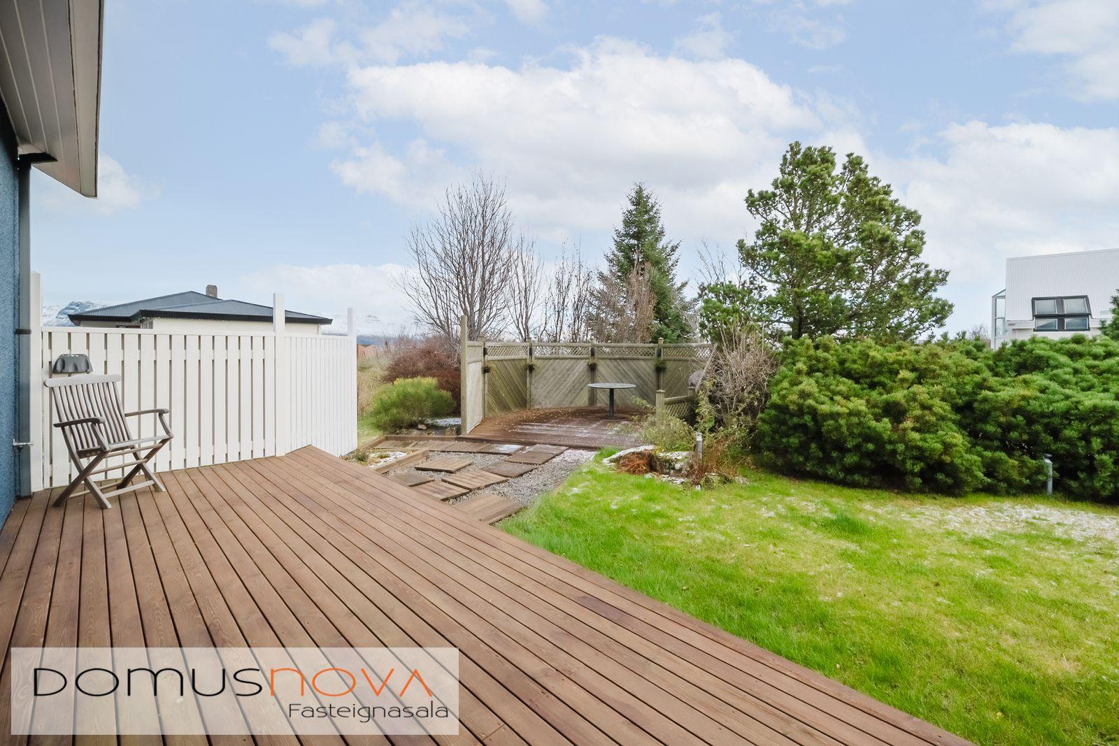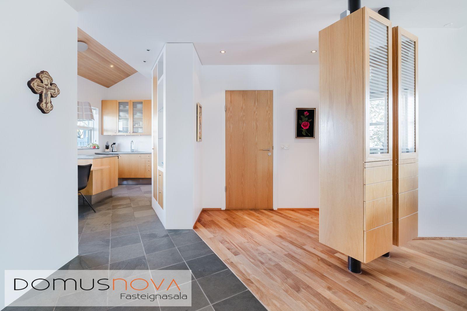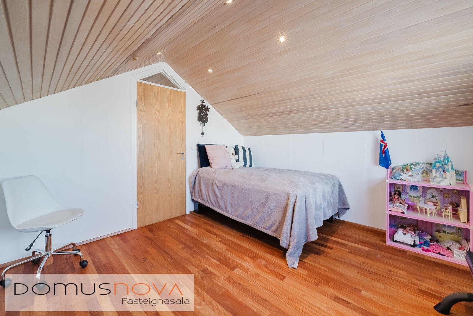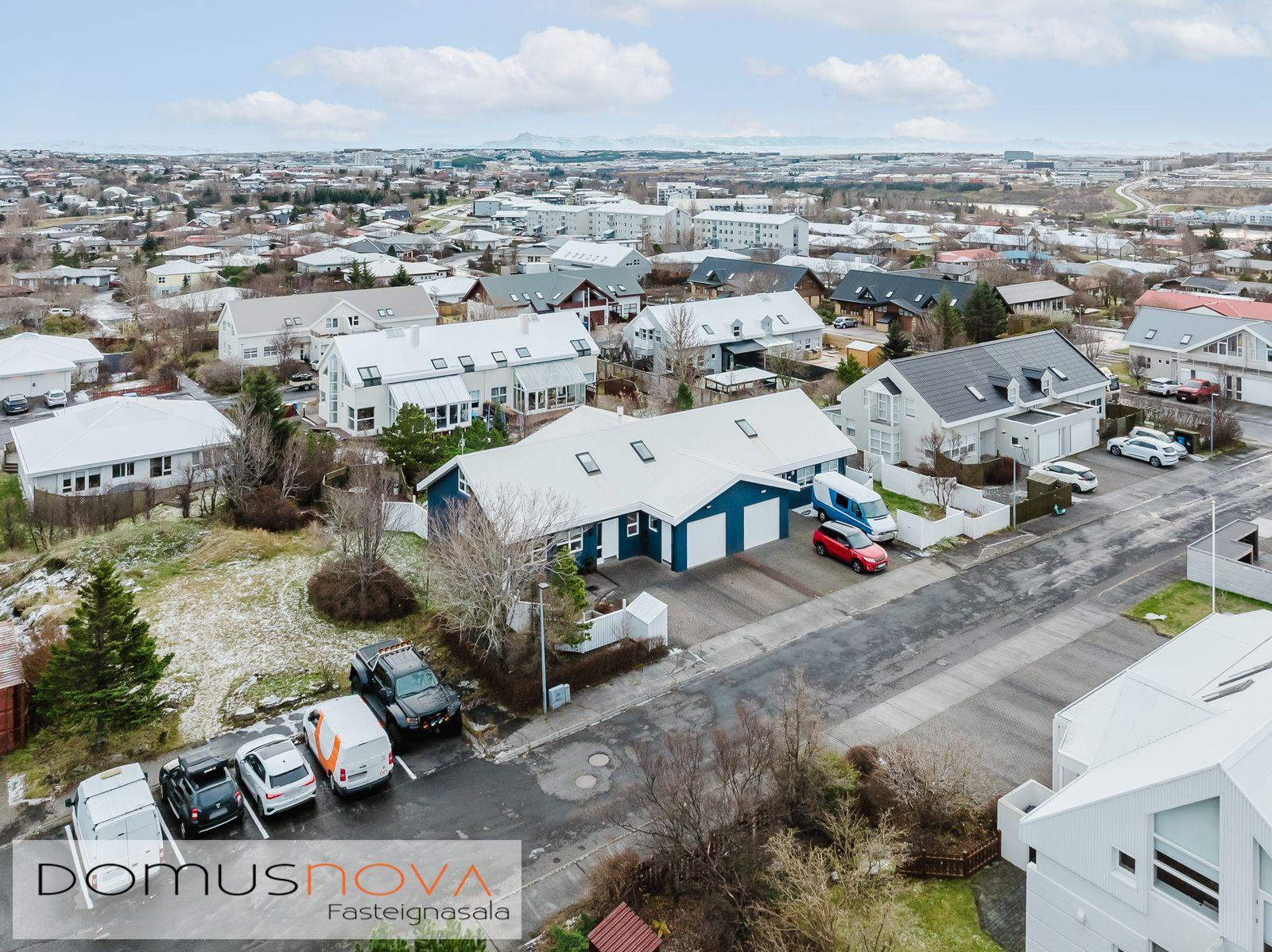 Lýsing eignar: Aðkoma:Húsið er innarlega í rólegum botnlanga. Fyrir framan húsið má með góðu móti leggja þremur bílum. Einnig rúmgott svæði fyrir setuaðstöðu fyrir framan hús. Forstofa: Flísalögð forstofa með fallegum dökkum náttúru steinflísum og góðu skápaplássi. Þvottahús: Innaf forstofu er gengið inn í þvottahús. Þar er stæði fyrir þvottavél og þurrkara. Fínt vinnupláss og góð innrétting. Opnanlegur gluggi. Flísar á gólfi. Eldhús:Mjög vönduð innrétting. Mikið skápa og borðpláss. Granítplötur á borðum. Innfelld uppþottavél og ísskápur ásamt bakaraofni í vinnuhæð. Borðkrókur er í eldhúsinu. Háfur yfir eyju. Stórir gluggar og flísar á gólfi. Baðherbergi:Innrétting með ágætis geymsluplássi. Granítplata á borði. Baðkar og sér sturtuklefi. Handklæðaofn og upphengt salerni. Flísar á gólfi og opnanlegur gluggi. Stofa/borðstofa: Alrýmið er einstaklega fallegt með mjög mikilli lofthæð. Á gólfum er parket og náttúru steinflísar á gólfi. Arinn með íslensku grágrýti í eldhólfi og á syllu. Stórir gluggar á alrýminu gefa fallega sýn. Útgengt frá stofu út á verönd/garð. Svefnherbergi I:Á neðri hæðinni er hjónaherbergið. Það er parketlagt með góðum fataskáp. Svefnherbergi II:Búið er að breyta alrýminu og nýtist þetta svefnherbergi sem hluti af alrýminu í dag. Þessu rými væri hægt að breyta aftur í svefnherbergi. Svefnherbergi III: Þetta herbergi er á efri hæðinni. Rúmgott herbergi. Parket á gólfi. Mikið útsýni til norðurs. Í herberginu er gott geymslurými undir súð sem er lokað af. Efri hæð:Nýtist í dag sem sjónvarpsrými, vinnuaðstaða og svefnherbergi. Undir súð er gott geymslurými. Bílskúr:Mjög snyrtilegur. Heitt og kalt vatn. Opnanlegur gluggi. Rafmagnsopnari á bílskúrshurð. Gott geymsluloft.