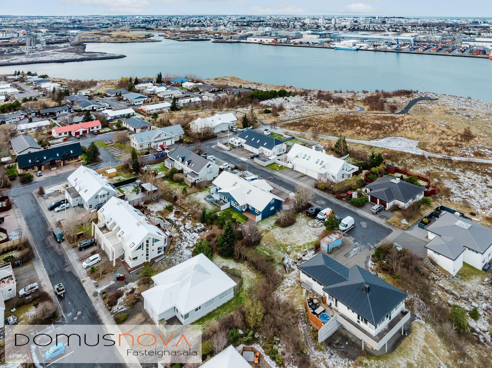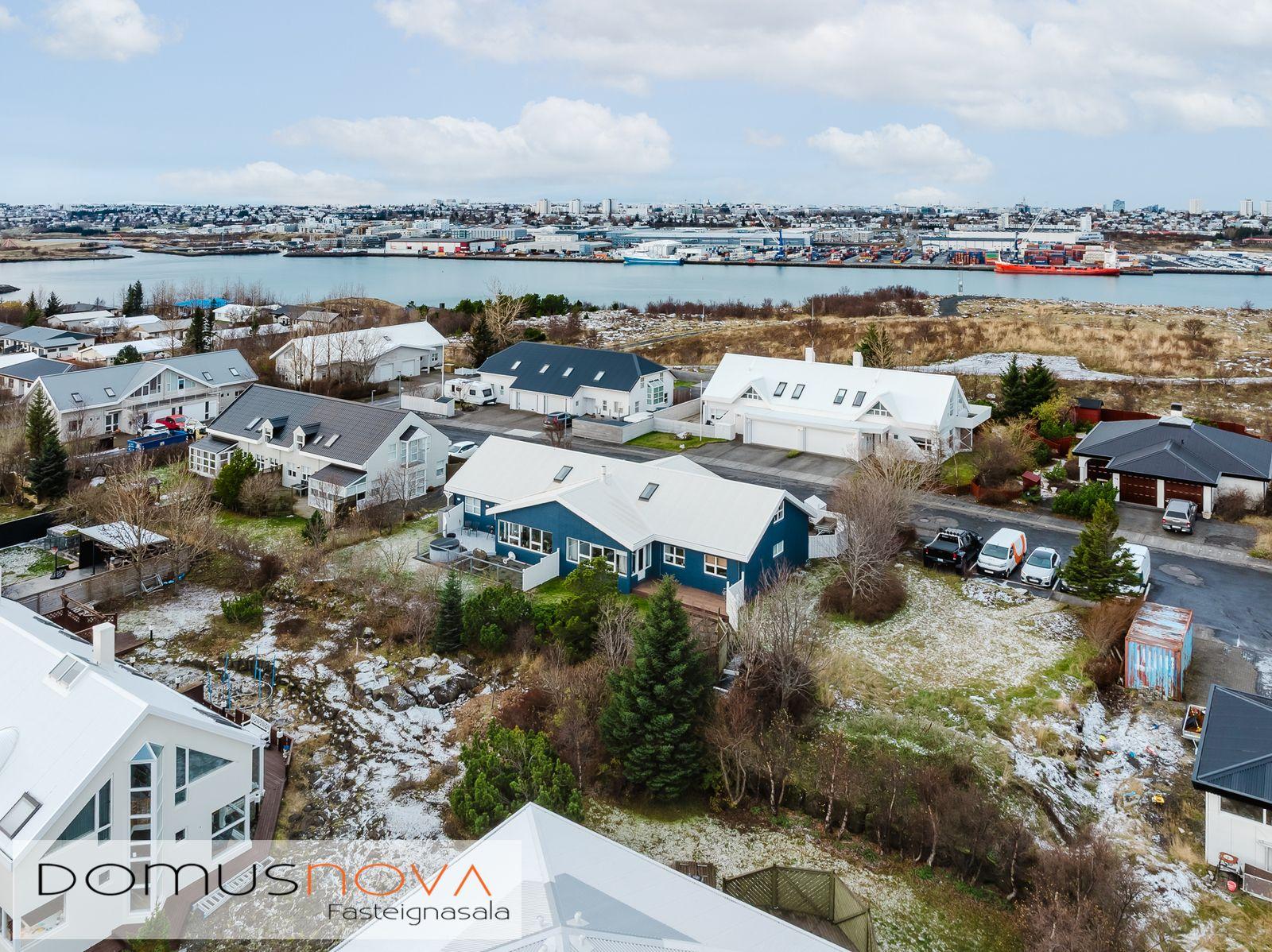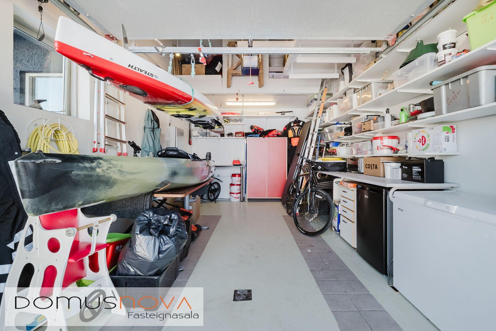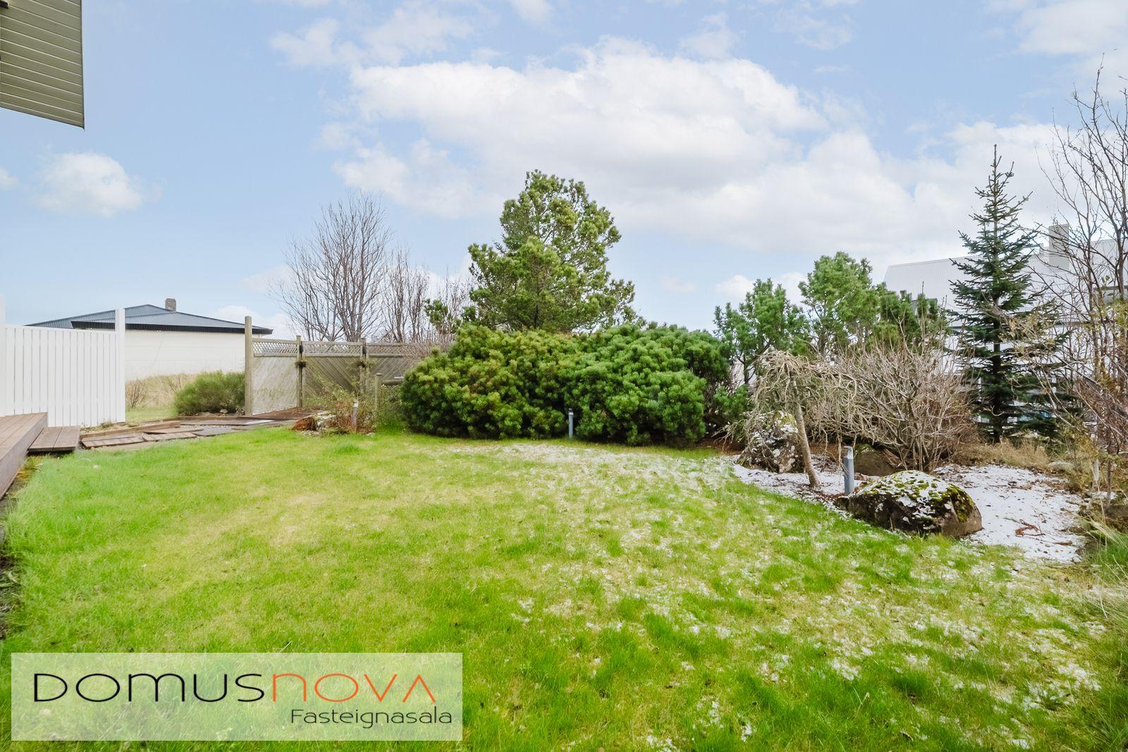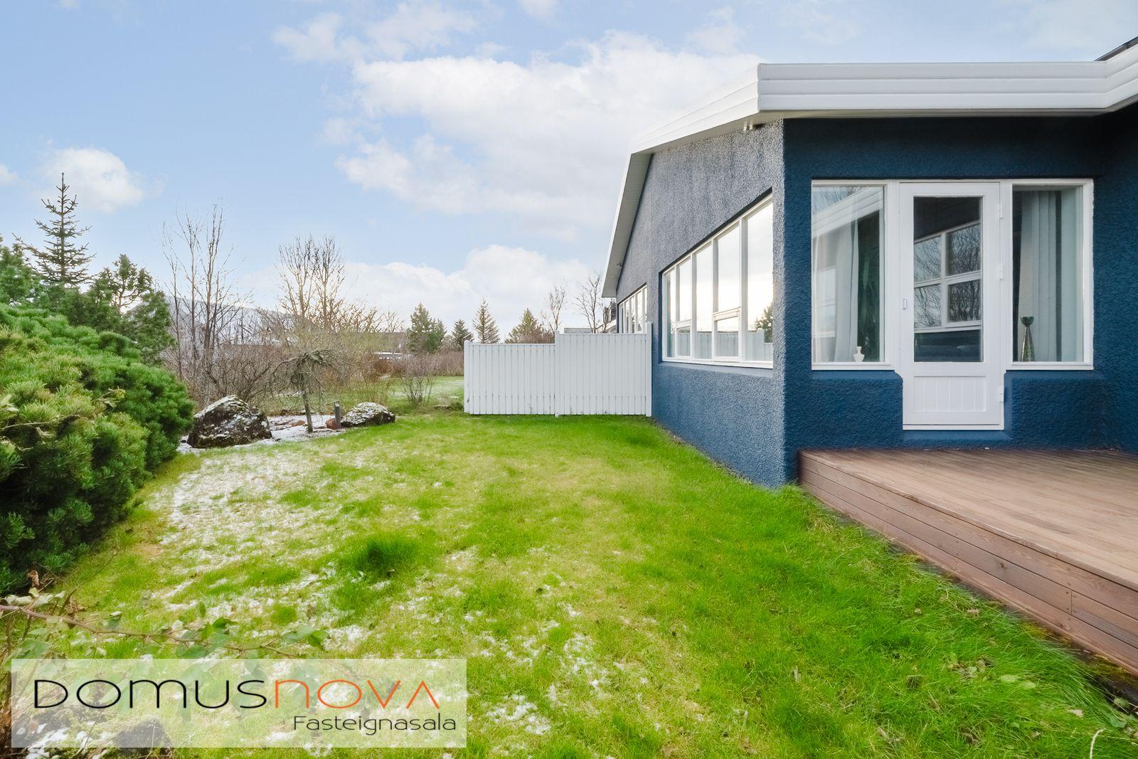 Lýsing eignar: Aðkoma:Húsið er innarlega í rólegum botnlanga. Fyrir framan húsið má með góðu móti leggja þremur bílum. Einnig rúmgott svæði fyrir setuaðstöðu fyrir framan hús. Forstofa: Flísalögð forstofa með fallegum dökkum náttúru steinflísum og góðu skápaplássi. Þvottahús: Innaf forstofu er gengið inn í þvottahús. Þar er stæði fyrir þvottavél og þurrkara. Fínt vinnupláss og góð innrétting. Opnanlegur gluggi. Flísar á gólfi. Eldhús:Mjög vönduð innrétting. Mikið skápa og borðpláss. Granítplötur á borðum. Innfelld uppþottavél og ísskápur ásamt bakaraofni í vinnuhæð. Borðkrókur er í eldhúsinu. Háfur yfir eyju. Stórir gluggar og flísar á gólfi. Baðherbergi:Innrétting með ágætis geymsluplássi. Granítplata á borði. Baðkar og sér sturtuklefi. Handklæðaofn og upphengt salerni. Flísar á gólfi og opnanlegur gluggi. Stofa/borðstofa: Alrýmið er einstaklega fallegt með mjög mikilli lofthæð. Á gólfum er parket og náttúru steinflísar á gólfi. Arinn með íslensku grágrýti í eldhólfi og á syllu. Stórir gluggar á alrýminu gefa fallega sýn. Útgengt frá stofu út á verönd/garð. Svefnherbergi I:Á neðri hæðinni er hjónaherbergið. Það er parketlagt með góðum fataskáp. Svefnherbergi II:Búið er að breyta alrýminu og nýtist þetta svefnherbergi sem hluti af alrýminu í dag. Þessu rými væri hægt að breyta aftur í svefnherbergi. Svefnherbergi III: Þetta herbergi er á efri hæðinni. Rúmgott herbergi. Parket á gólfi. Mikið útsýni til norðurs. Í herberginu er gott geymslurými undir súð sem er lokað af. Efri hæð:Nýtist í dag sem sjónvarpsrými, vinnuaðstaða og svefnherbergi. Undir súð er gott geymslurými. Bílskúr:Mjög snyrtilegur. Heitt og kalt vatn. Opnanlegur gluggi. Rafmagnsopnari á bílskúrshurð. Gott geymsluloft.