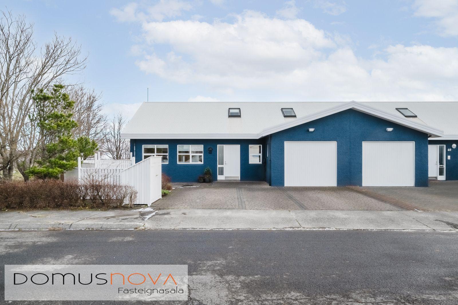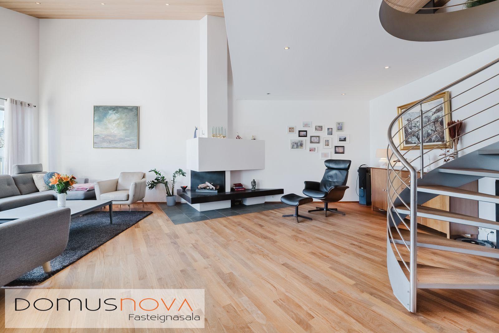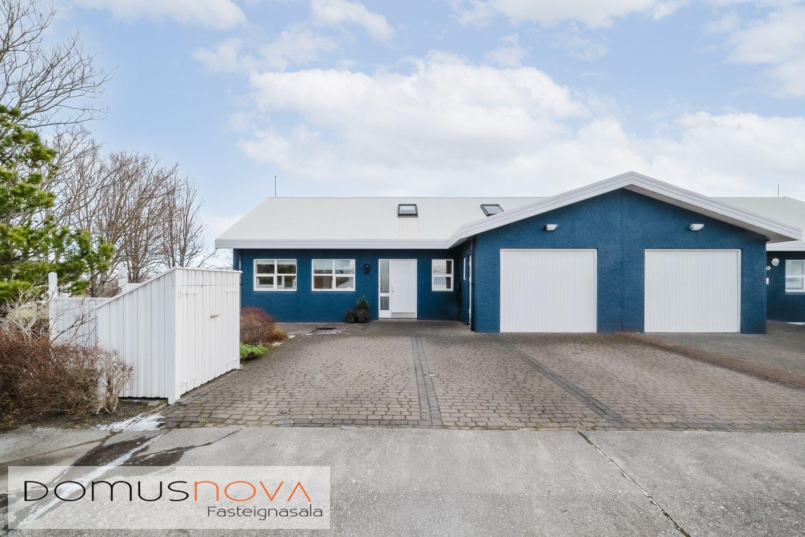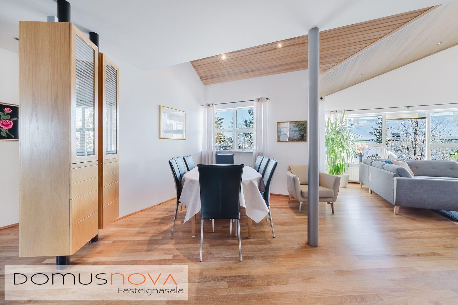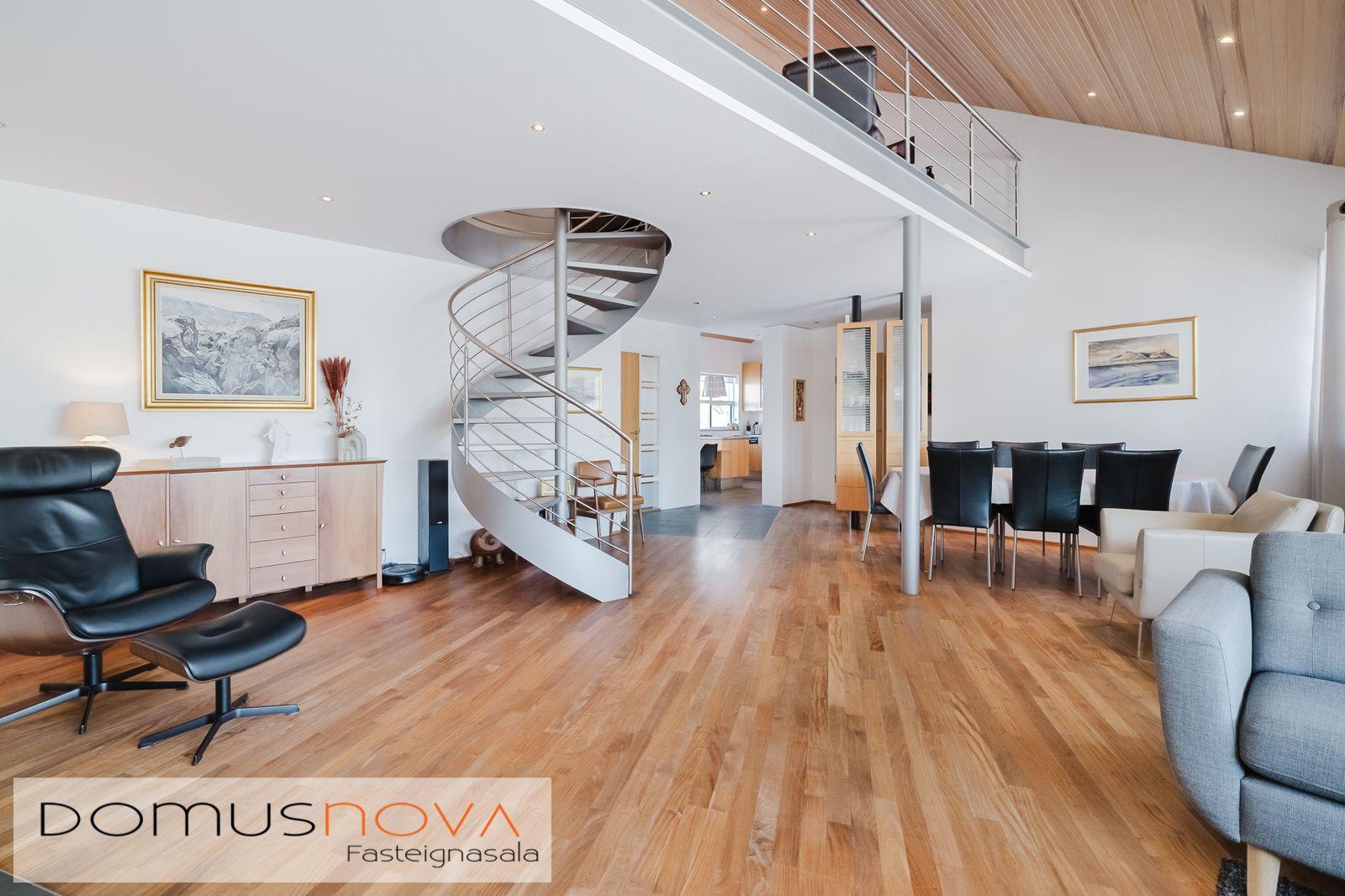 Domusnova fasteignasala og Andri H. Agnarsson lgf. kynna til sölu mjög fallegt og vandað parhús með mikilli og veglegri lofthæð. Húsið er á tveimur hæðum með bílskúr innarlega í botnlanga. Húsið er skráð samkvæmt HMS 165,8m2. Íbúðarhlutinn er 142,3m2 og bílskúrinn 23,5m2. Hluti efri hæðar er undir súð og því heildarfermetrar eitthvað fleiri en uppgefnir.