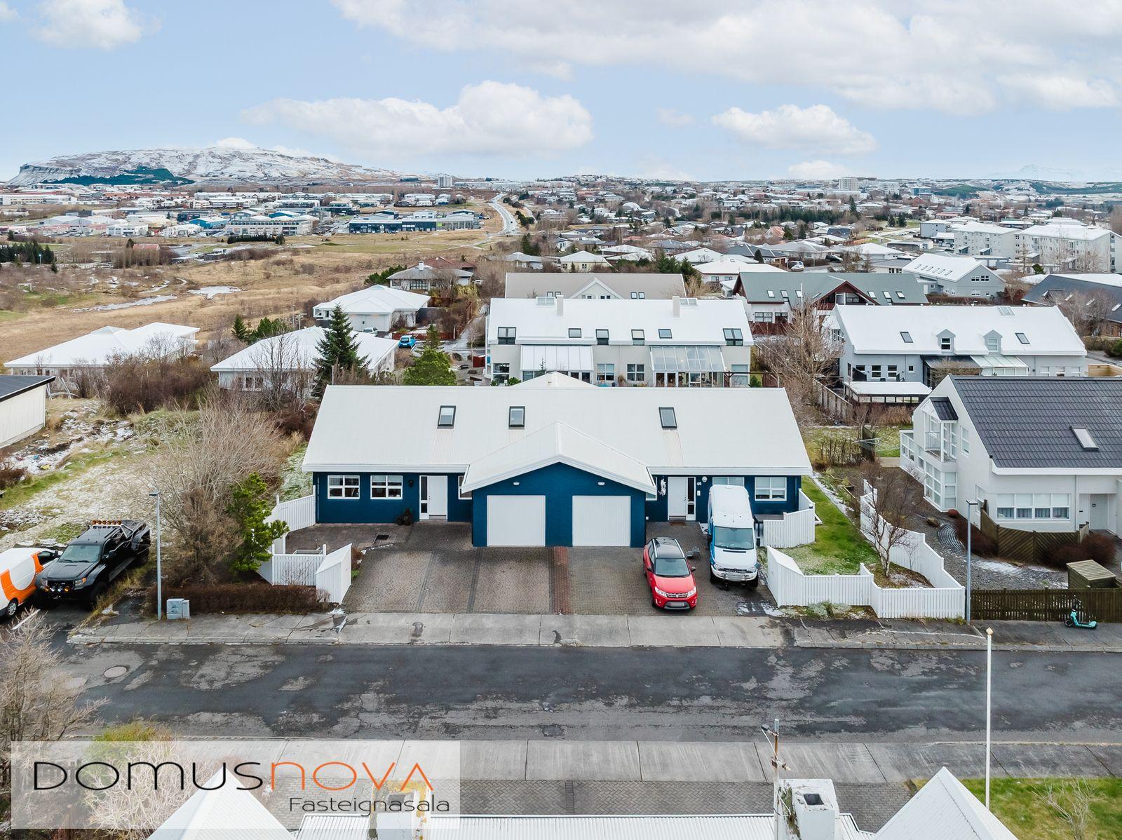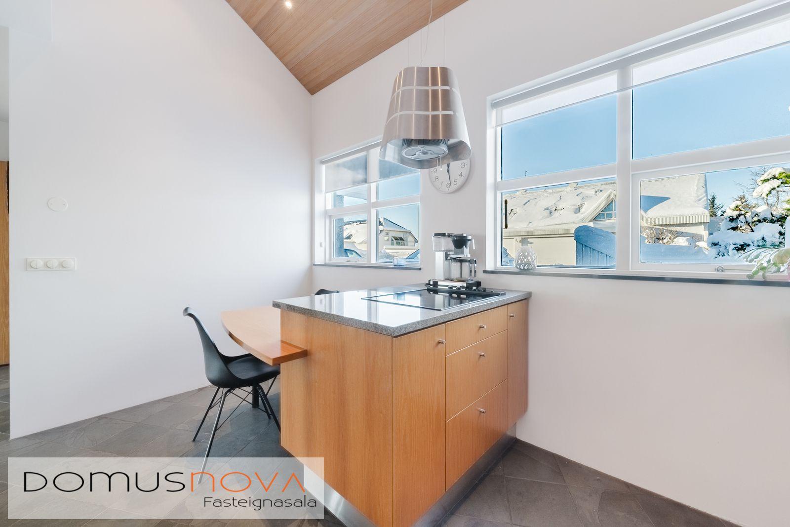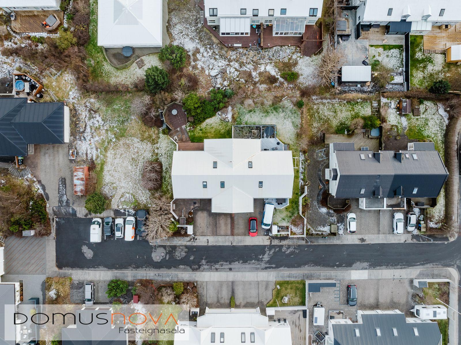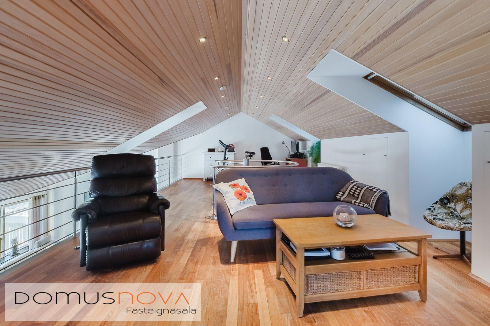Domusnova fasteignasala og Andri H. Agnarsson lgf. kynna til sölu mjög fallegt og vandað parhús með mikilli og veglegri lofthæð. Húsið er á tveimur hæðum með bílskúr innarlega í botnlanga. Húsið er skráð samkvæmt HMS 165,8m2. Íbúðarhlutinn er 142,3m2 og bílskúrinn 23,5m2. Hluti efri hæðar er undir súð og því heildarfermetrar eitthvað fleiri en uppgefnir.