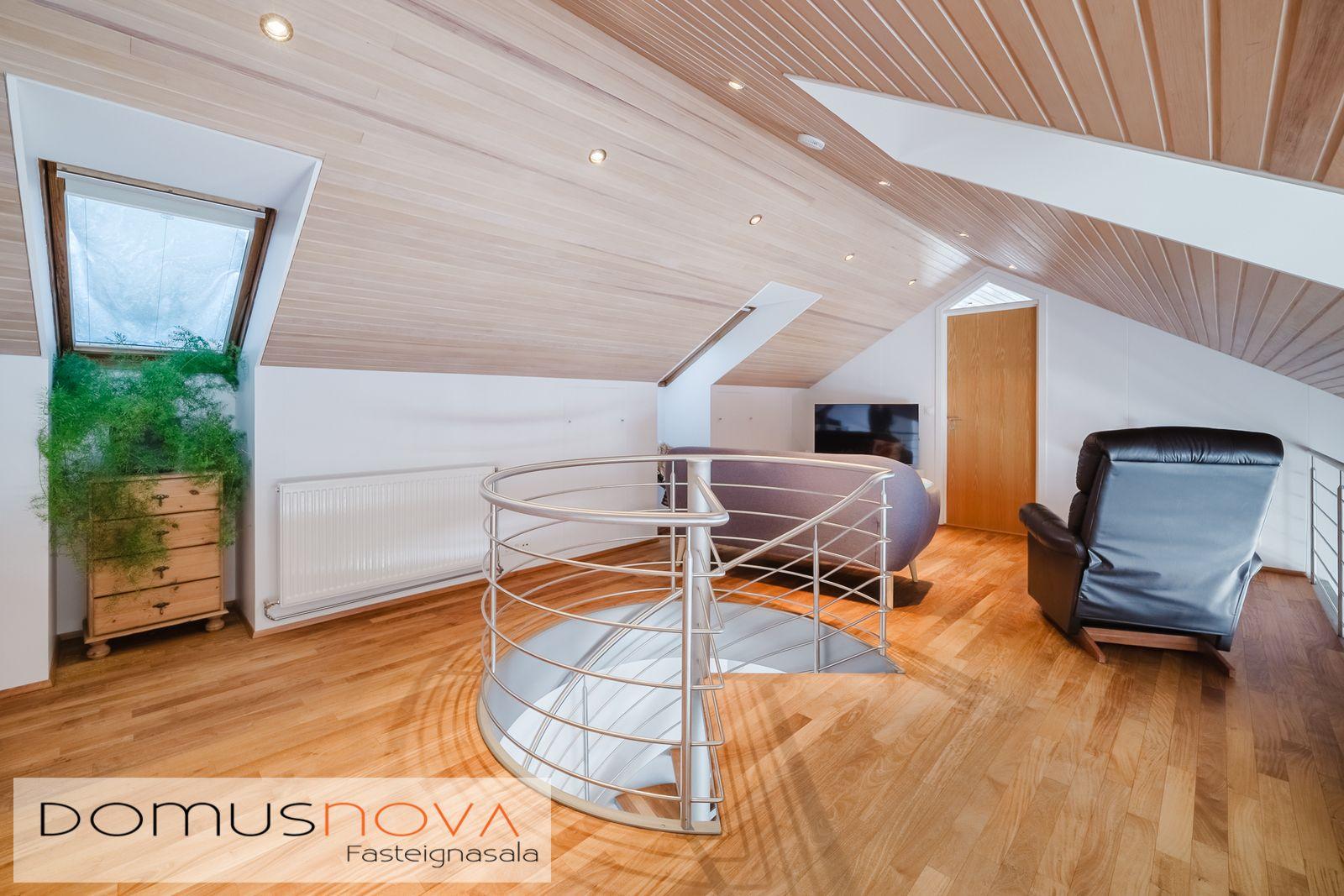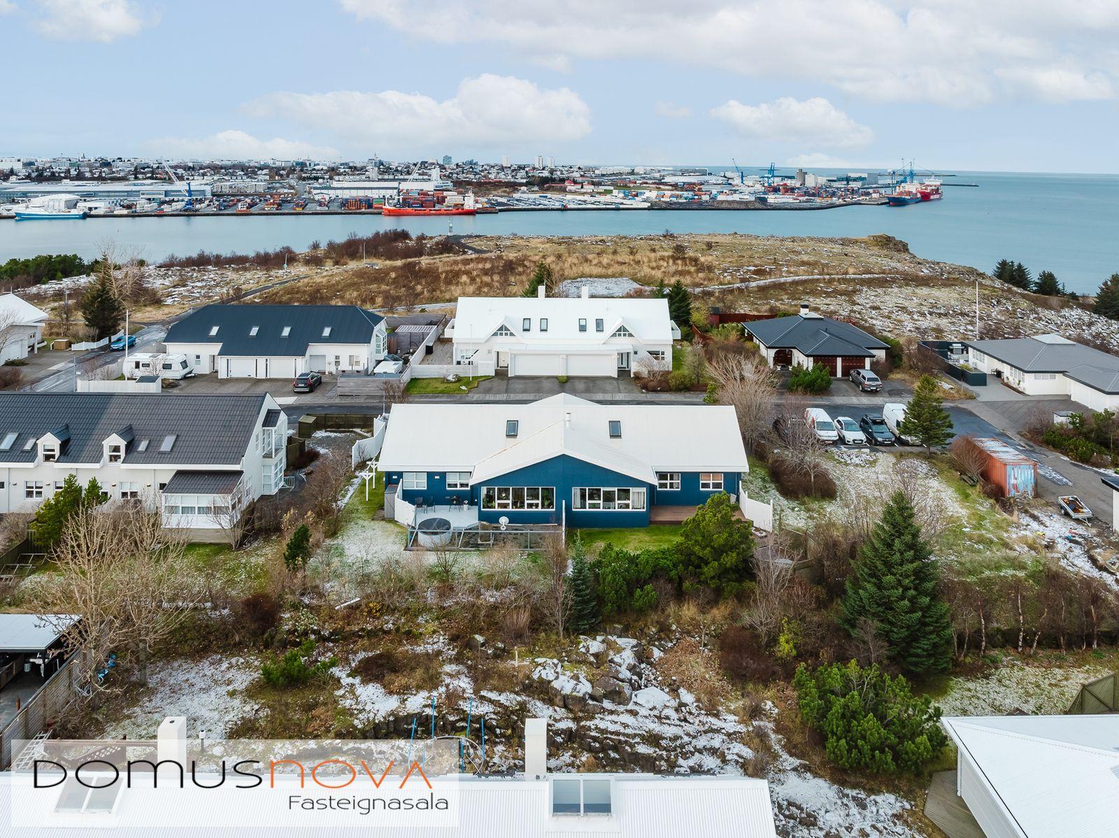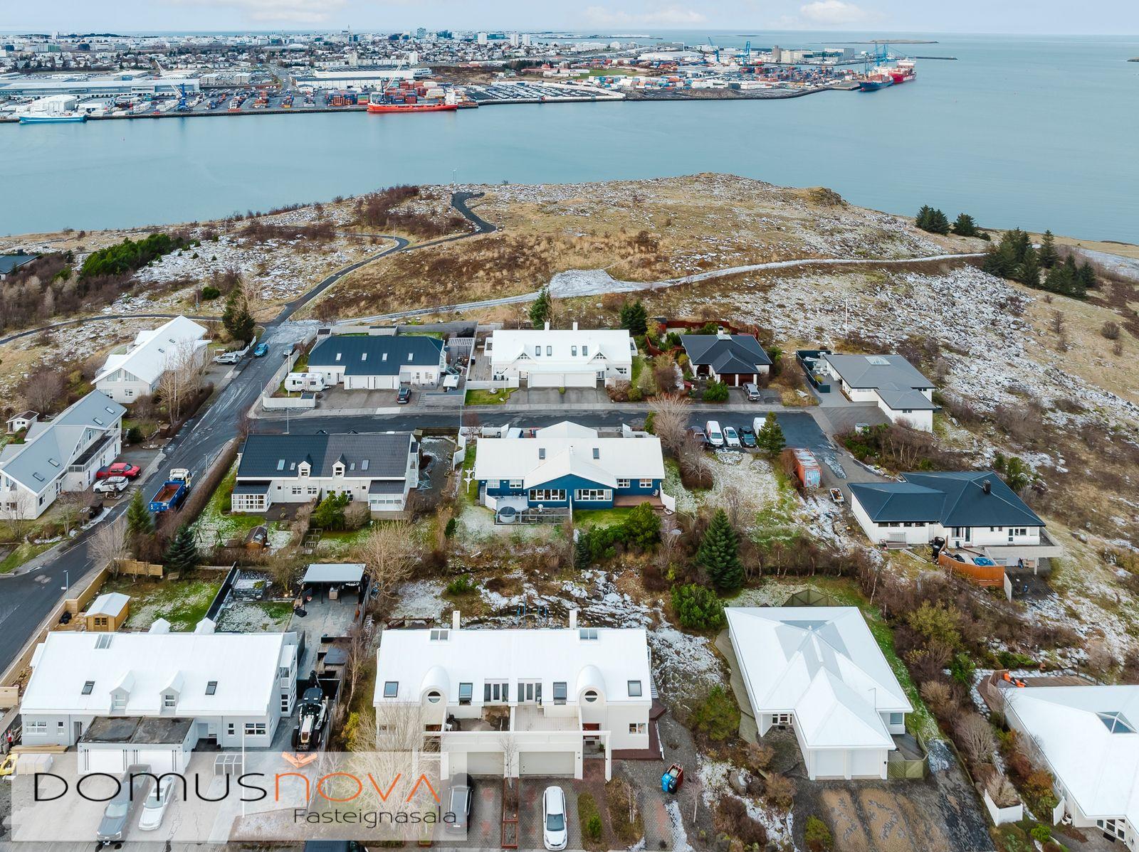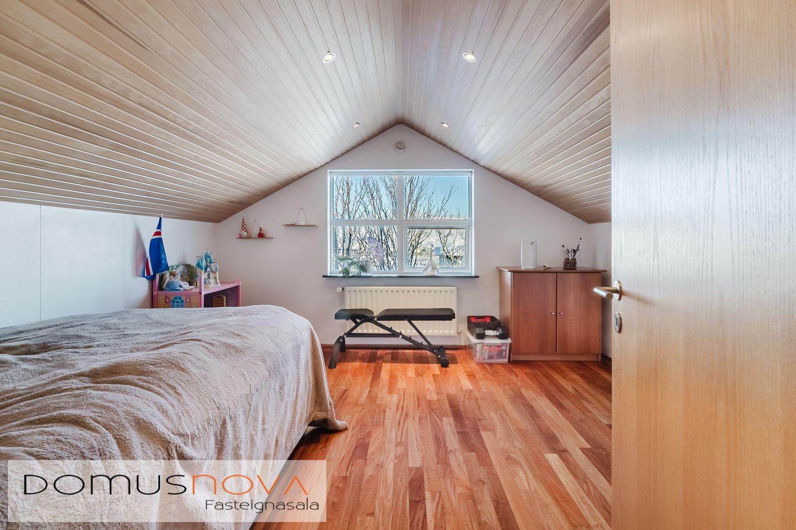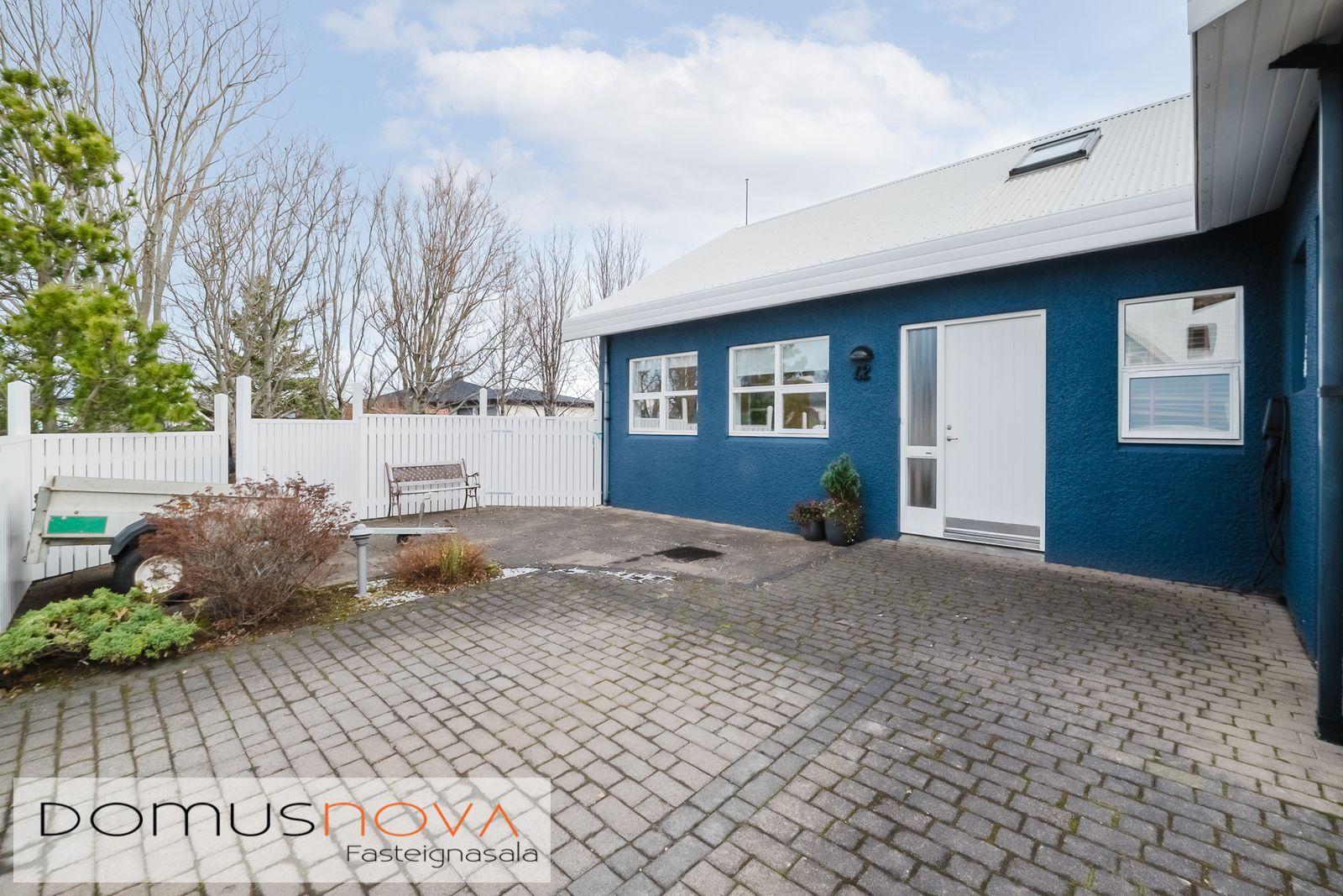 Domusnova fasteignasala og Andri H. Agnarsson lgf. kynna til sölu mjög fallegt og vandað parhús með mikilli og veglegri lofthæð. Húsið er á tveimur hæðum með bílskúr innarlega í botnlanga. Húsið er skráð samkvæmt HMS 165,8m2. Íbúðarhlutinn er 142,3m2 og bílskúrinn 23,5m2. Hluti efri hæðar er undir súð og því heildarfermetrar eitthvað fleiri en uppgefnir.