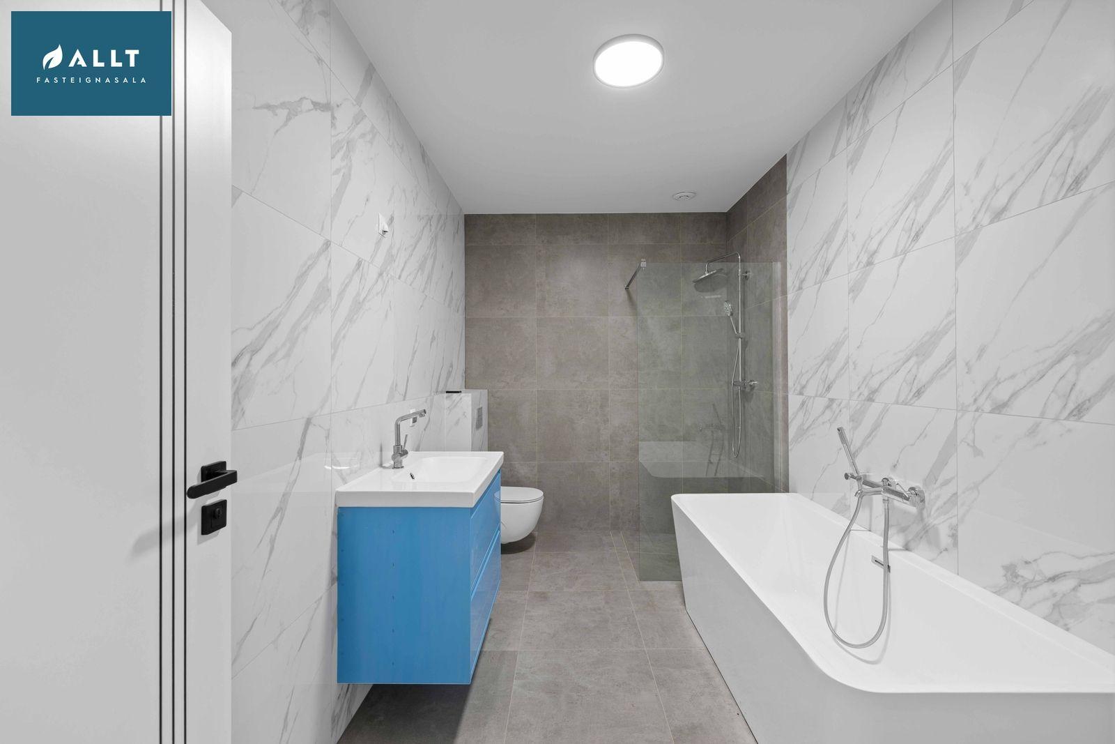 Baðherbergi (2) er flísalagt í hólf og gólf með baðkari og walk in sturtu, hvít upphengd innrétting með handlaug og upphengt salerni. Tengi er fyrir þvottavél og þurrkara