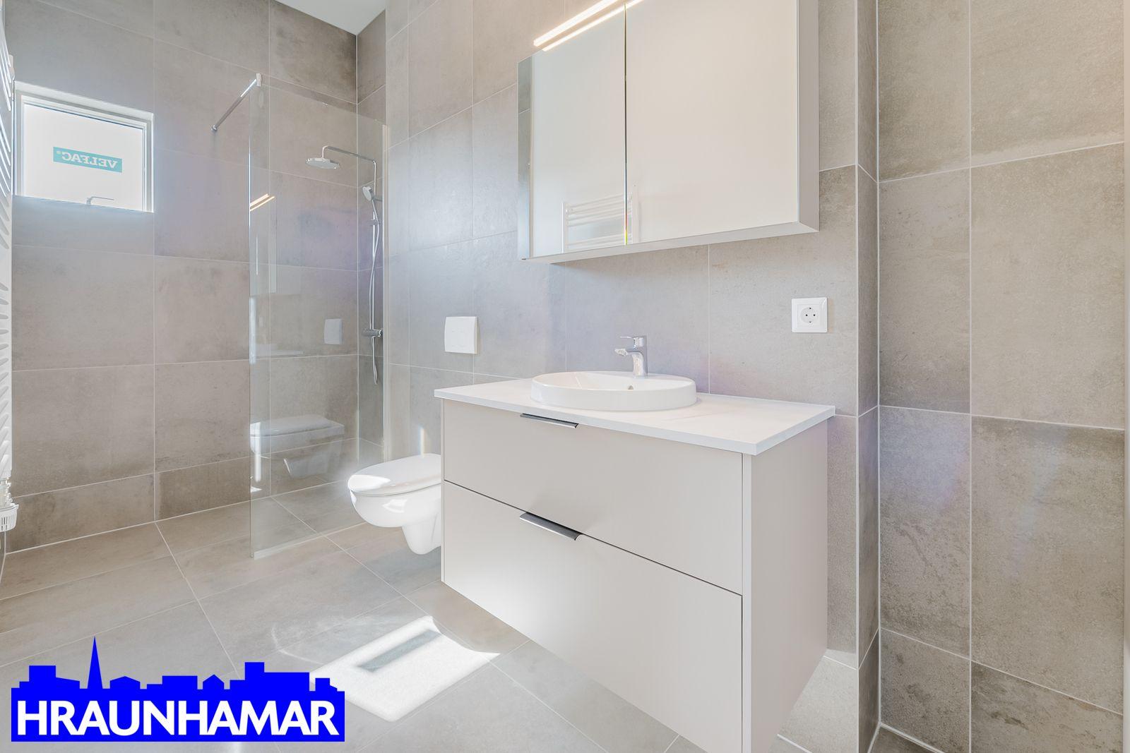baðherbergi með innréttingu, upphengdu salerni og sturtu. Tengi fyrir þvottavél og þurrkara.