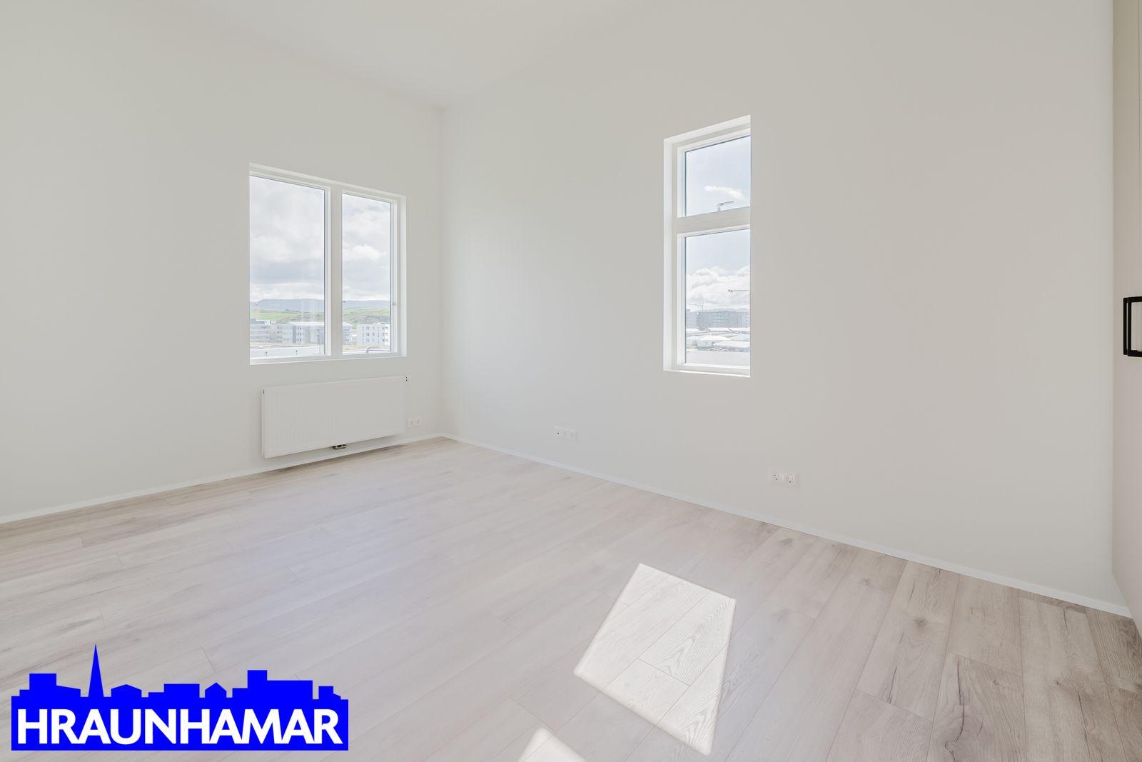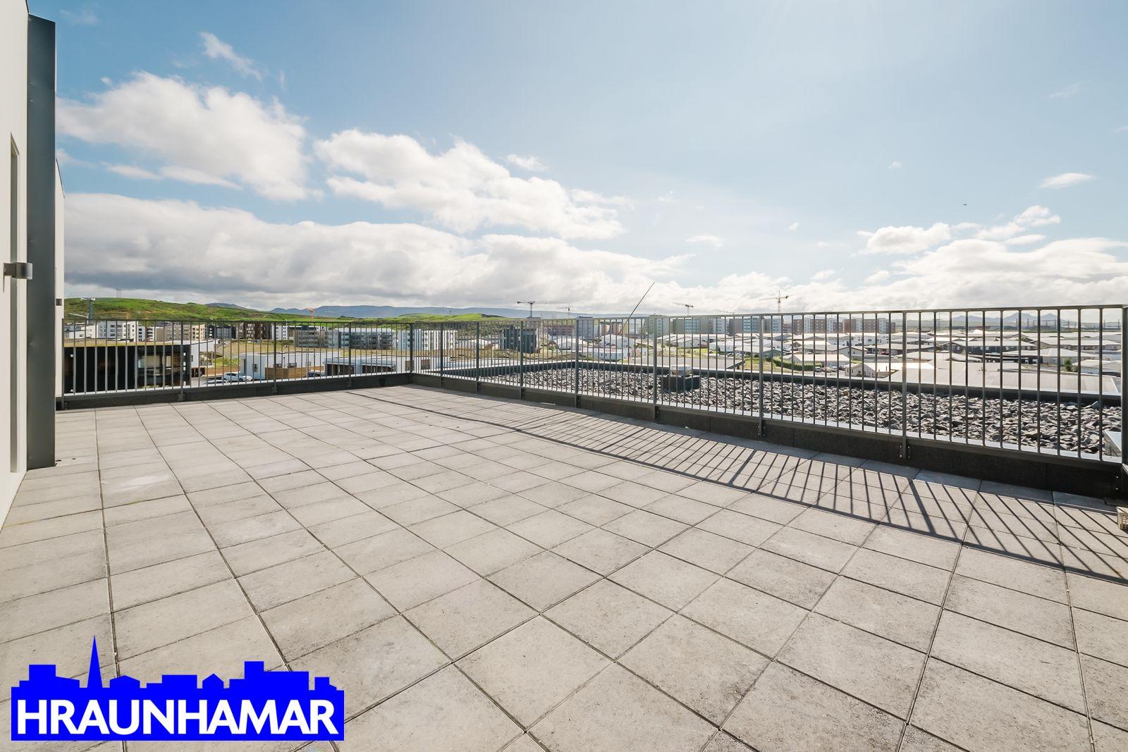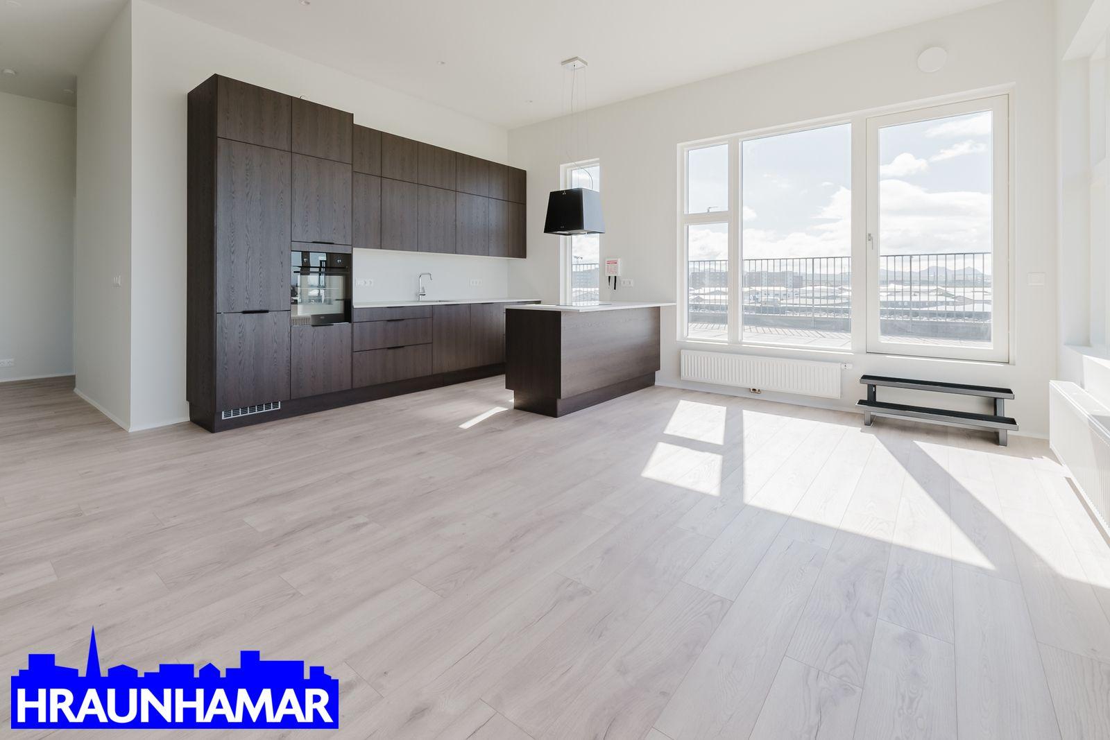 Íbúð 202 er glæsileg fögurra herbergja íbúð með sérinngangi, skráð 137,5 fermetrar með geymslu. Aukin lofthæð er í íbúðinni og fylgir henni um 50 fm þaksvalir. Frábært útsýni.