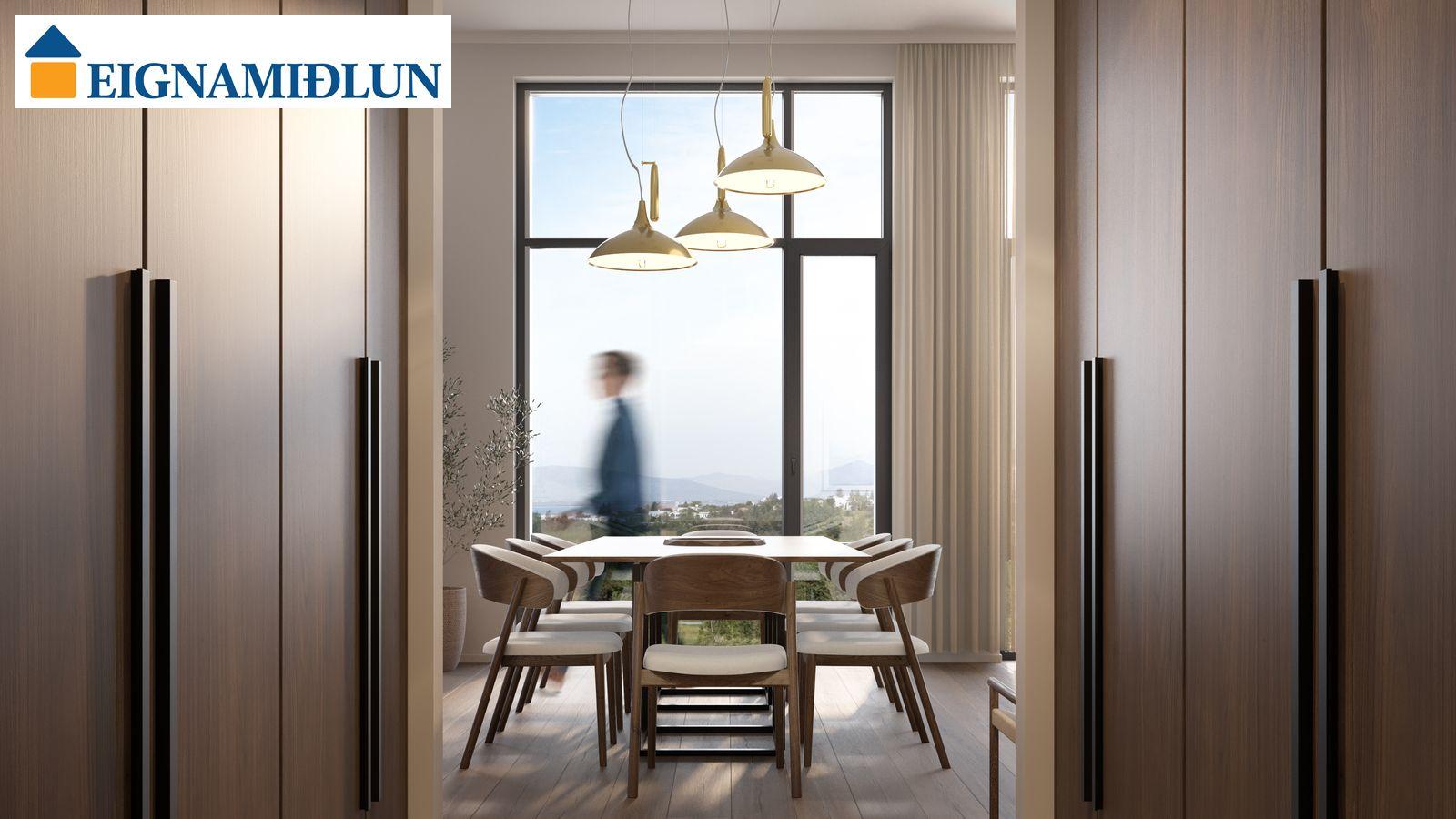 Innréttingaþema er Safír Premíum (900). Val þegar kemur að innréttingum og frágangi. Fimm innréttingaþemu í boði frá Nobilia (Easytouch frontar) og möguleiki á innréttingum frá Leicht (spónlagðar). Steinn á borðum. Vönduð eldhústæki frá Siemens, Elica og Bora. Vínkælir frá Temptech. Innfelldar innihurðir. Innbyggð Vola blöndunartæki á baðherbergjum.