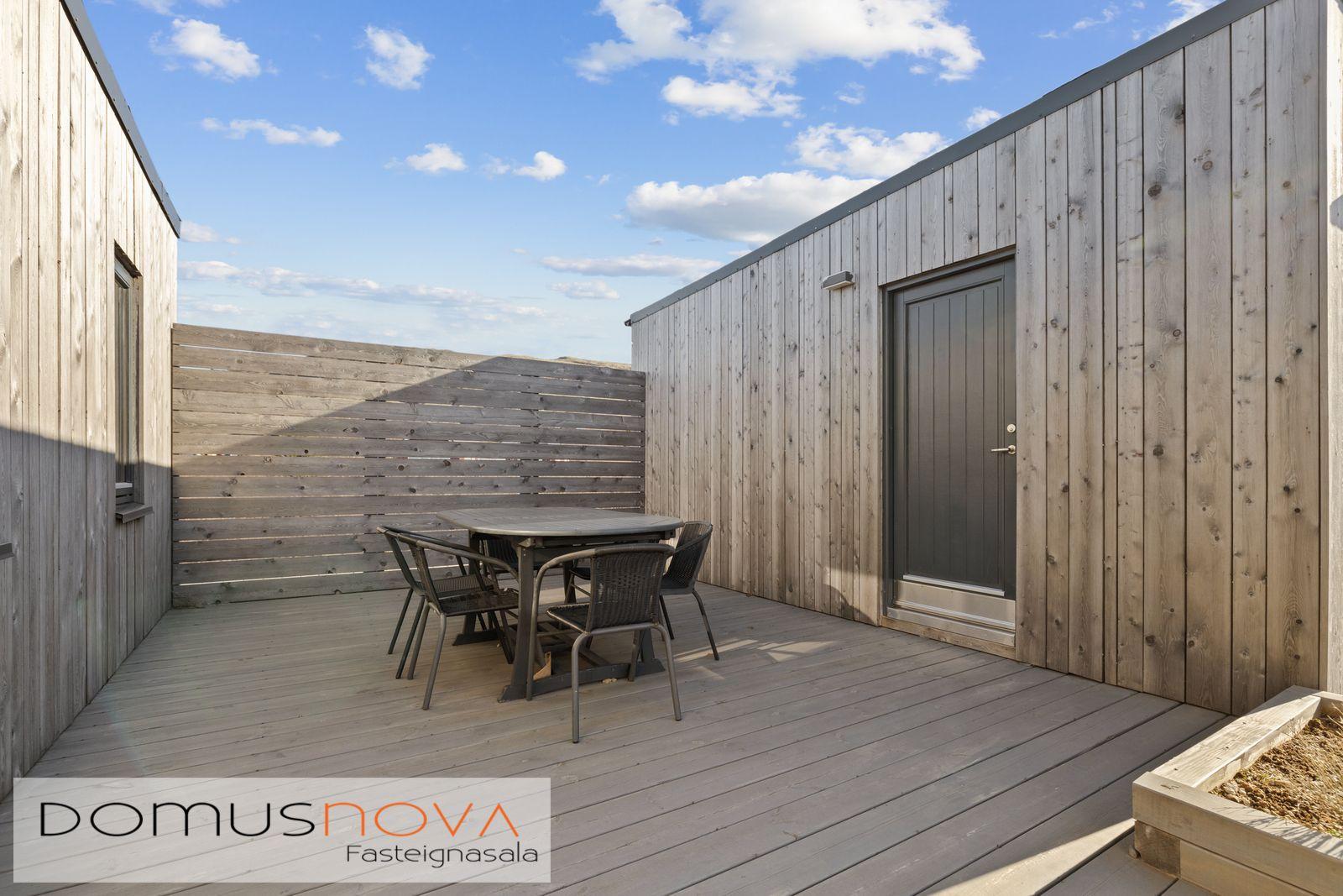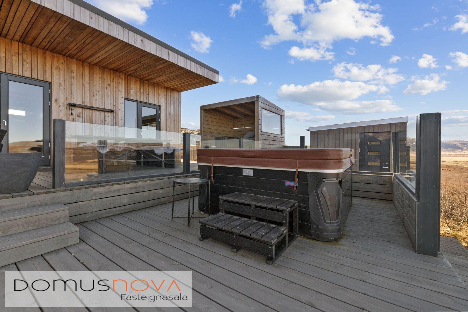Mjög stór verönd er í skjólsælu horni móti vestri og suðri. Á veröndinni er stór rafmagnspottur, grillskýli, saunahús (6 fm) með mögnuðum útsýnisglugga. Mikið rými til að sitja og finna sér skjól, hvernig sem blæs.