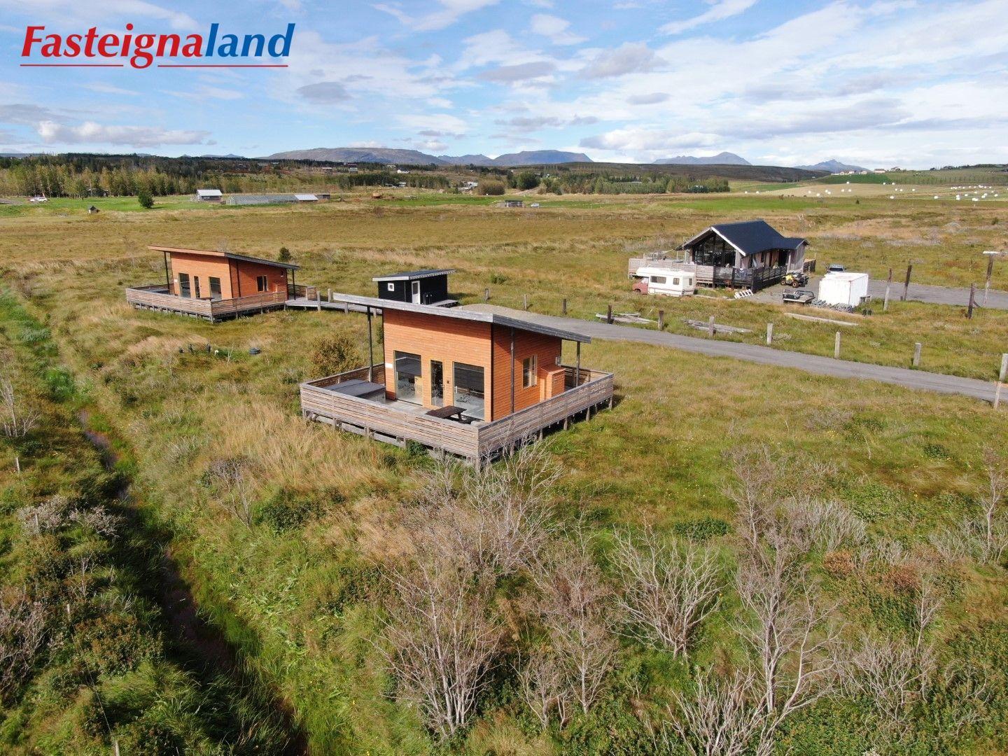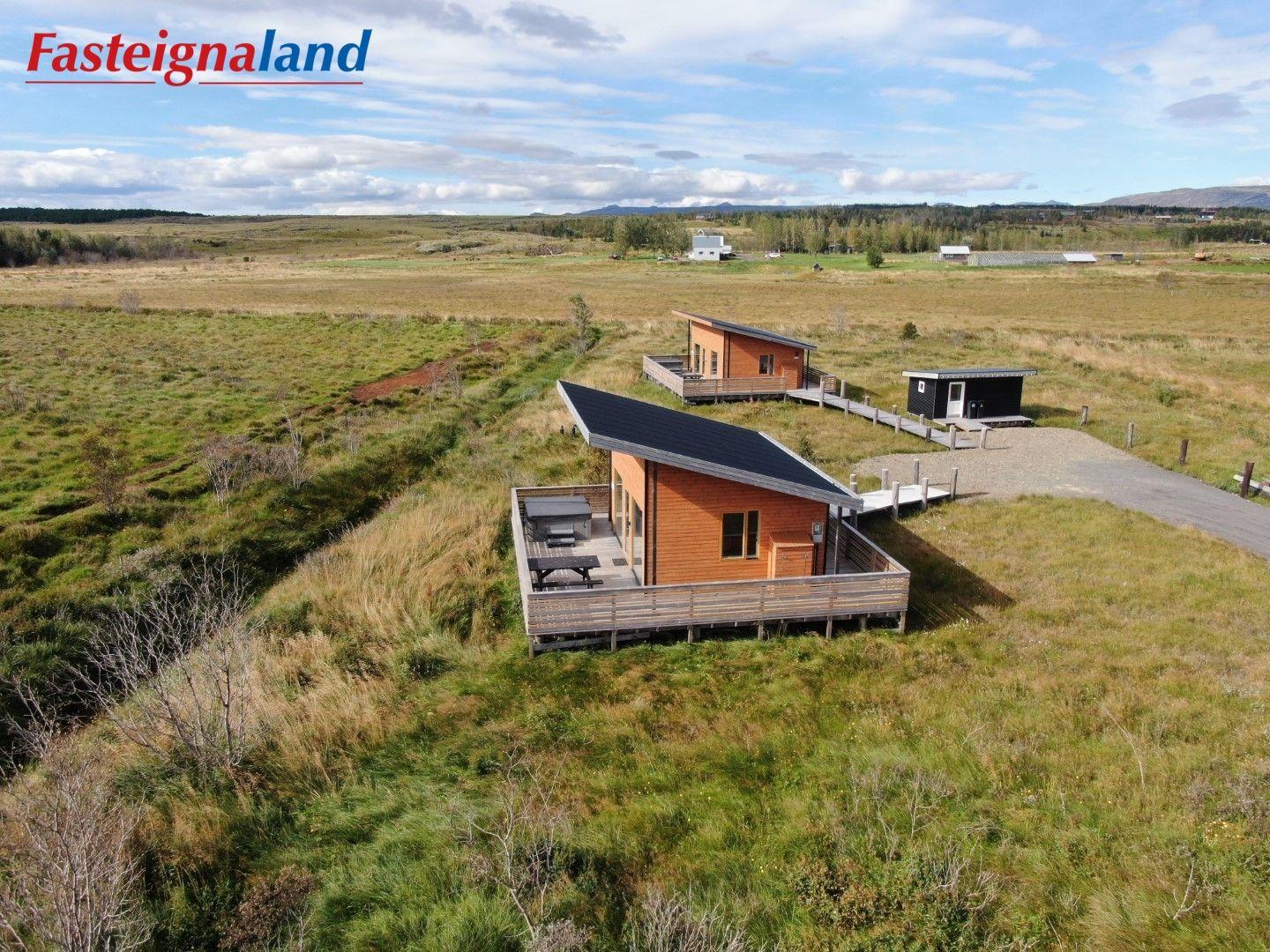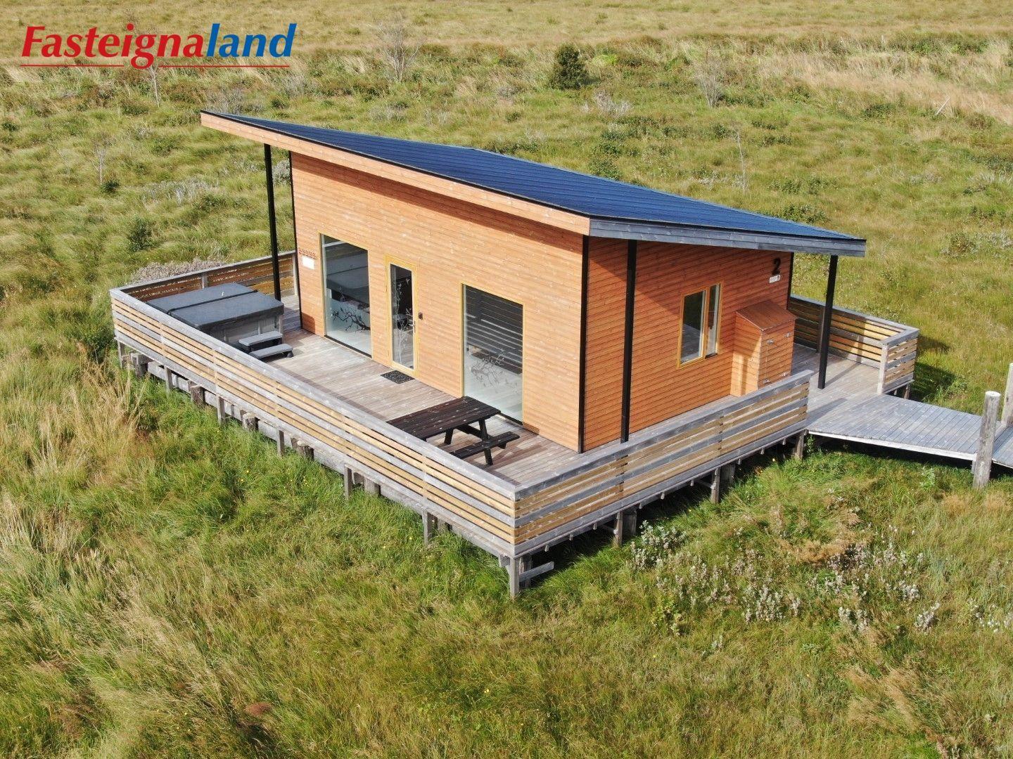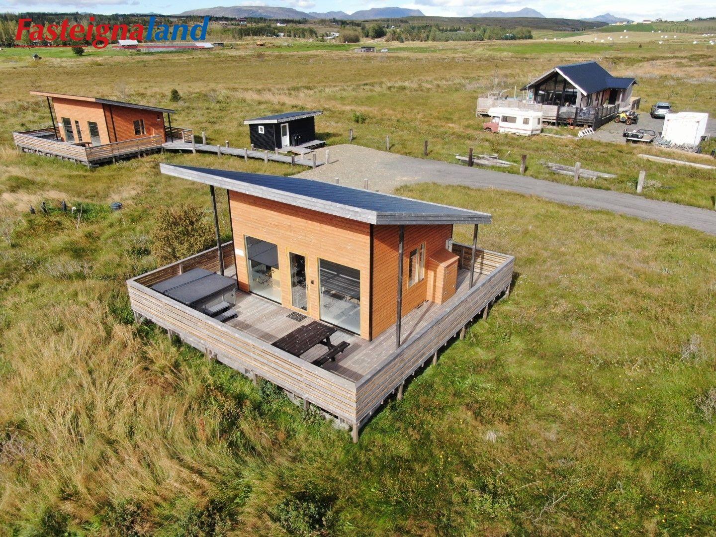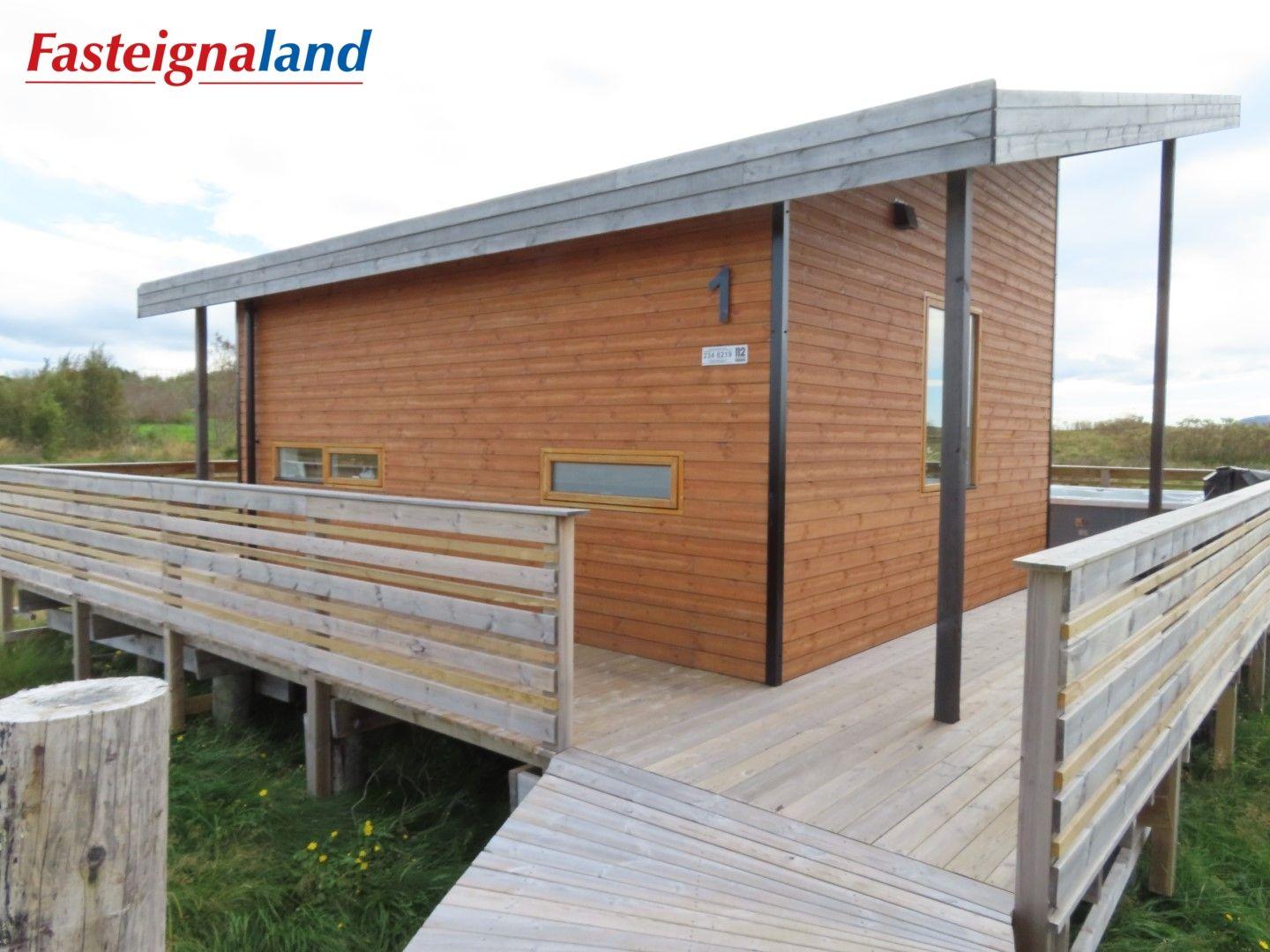 Lýsing á eign nr. 1: Hús skráð gestahús 30 fm. Komið inn alrými/stofu með parketi á gólfi. Herbergi með parketi á gólfi. Baðherbergi með flísum á gólfi og fíbo plötum á veggjum, viðarinnréttingu og „walk in“ sturtu. Eldhús og stofa í sama rými L-laga með góðri lofhæð. Viðarinnréttingu og sambyggðri eldavél með kermik helluborði/uppþvottavél. Góður pallur með handriðið. Heitur pottur.