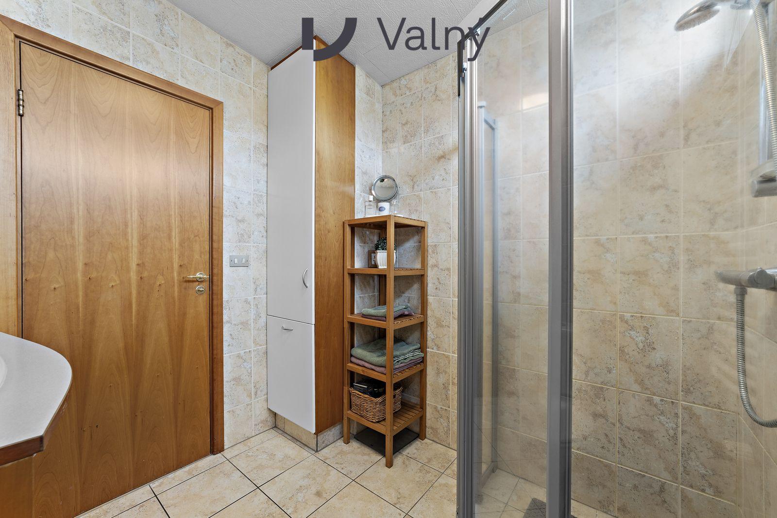 Baðherbergi flísalagt í hólf og gólf, með sturtu, salerni, handklæðaofni og innréttingu með skápaplássi.