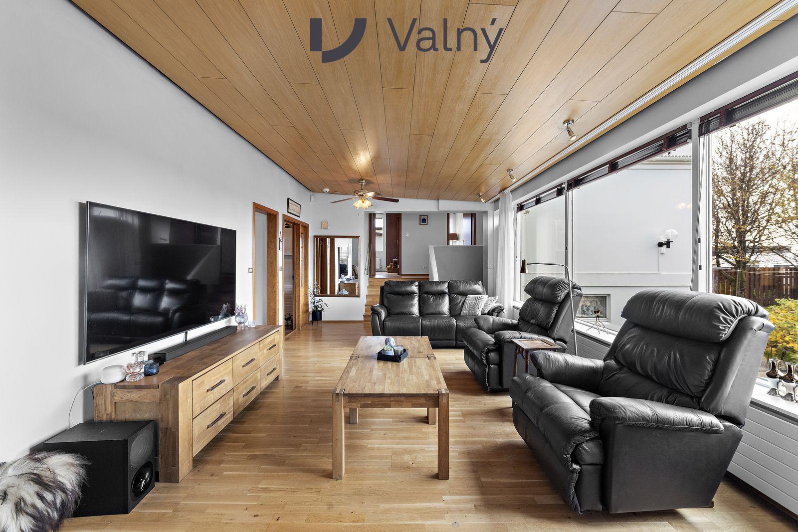 Stofa og borðstofa er með stórum gluggum sem gerir rýmið bjart og fallegt. Útgengt í garð á hellulagða verönd með heitum potti. Viðarparket á gólfi.