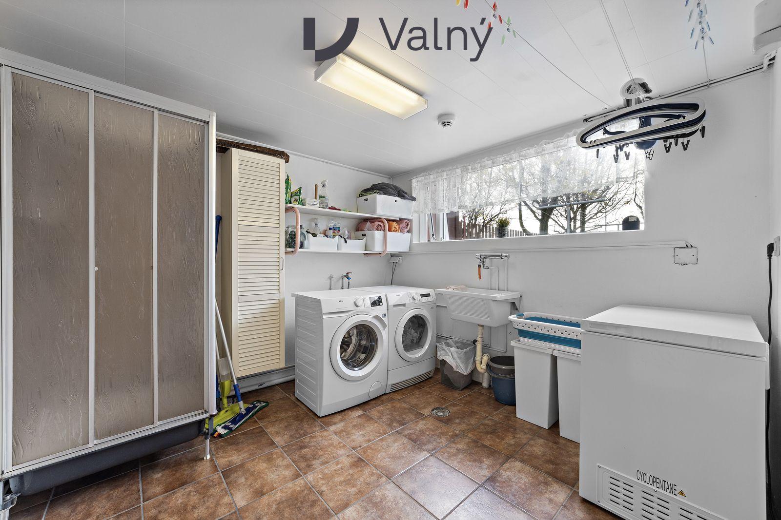 Þvottahús er rúmgott með sturtu, skolvaski og flísalögðu gólfi.