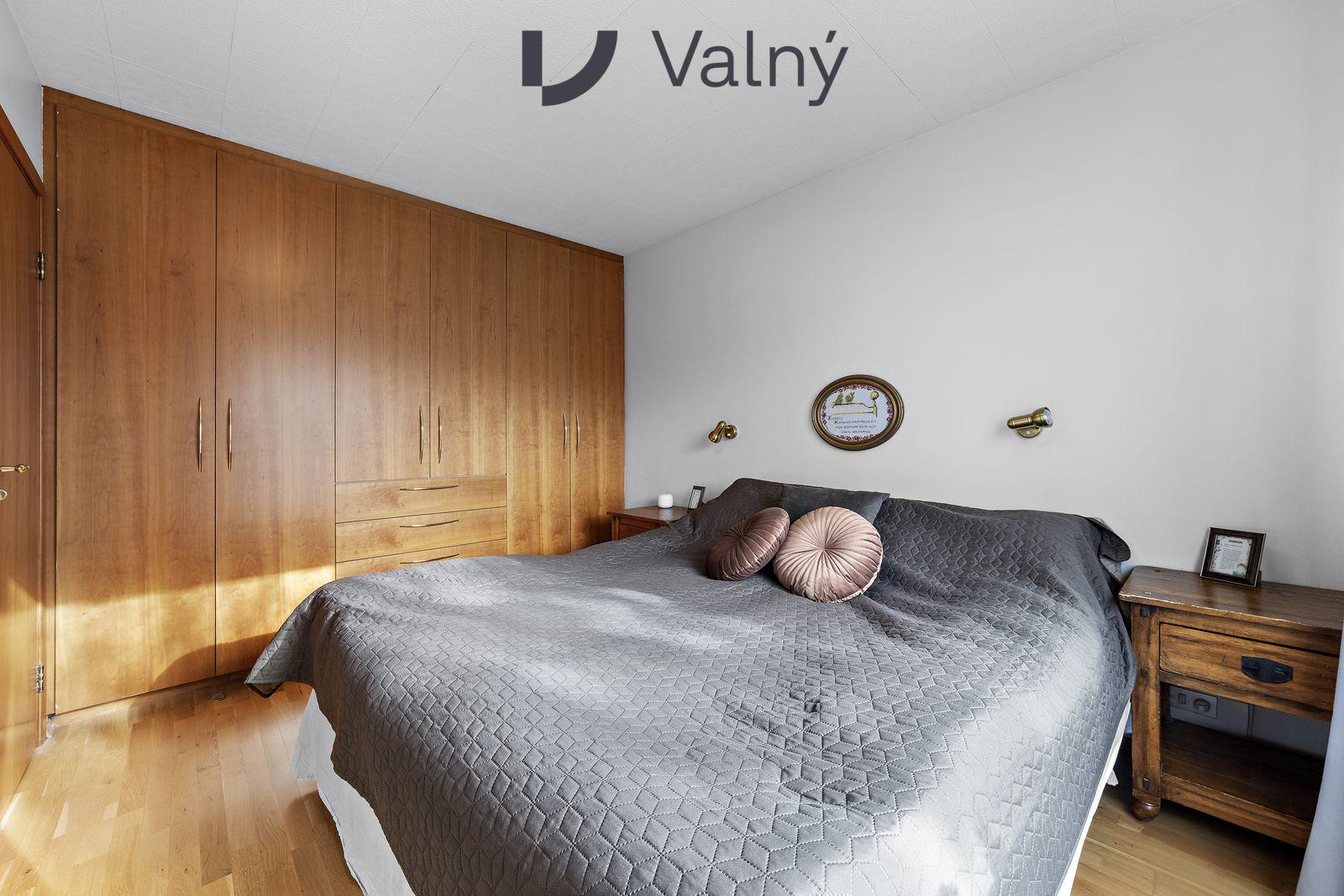 Hjónaherbergi með stórum fataskáp og viðarparketi.