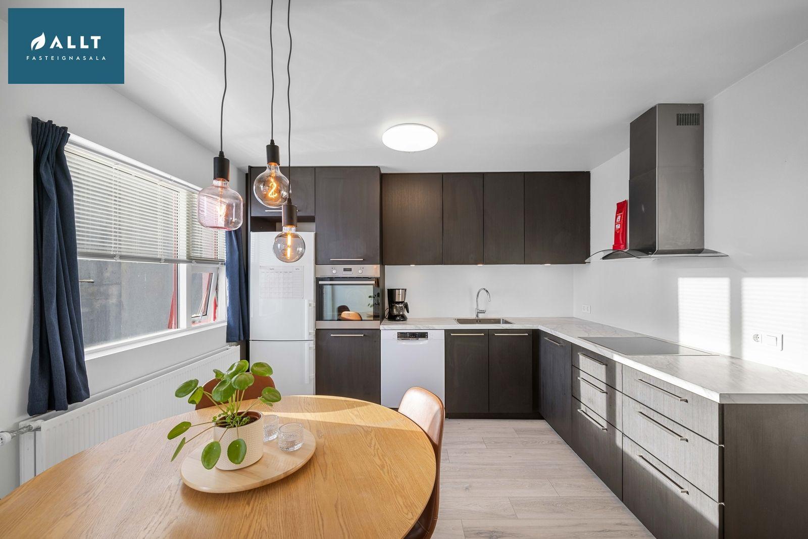 Eldhús: Parket á gólfi, Nýleg, smekkleg svarbrún innrétting með innbyggðri uppþvottarvél. Gert er ráð fyrir einföldum ísskáp í innréttingu. Útgengt er á svalir úr eldhúsi.