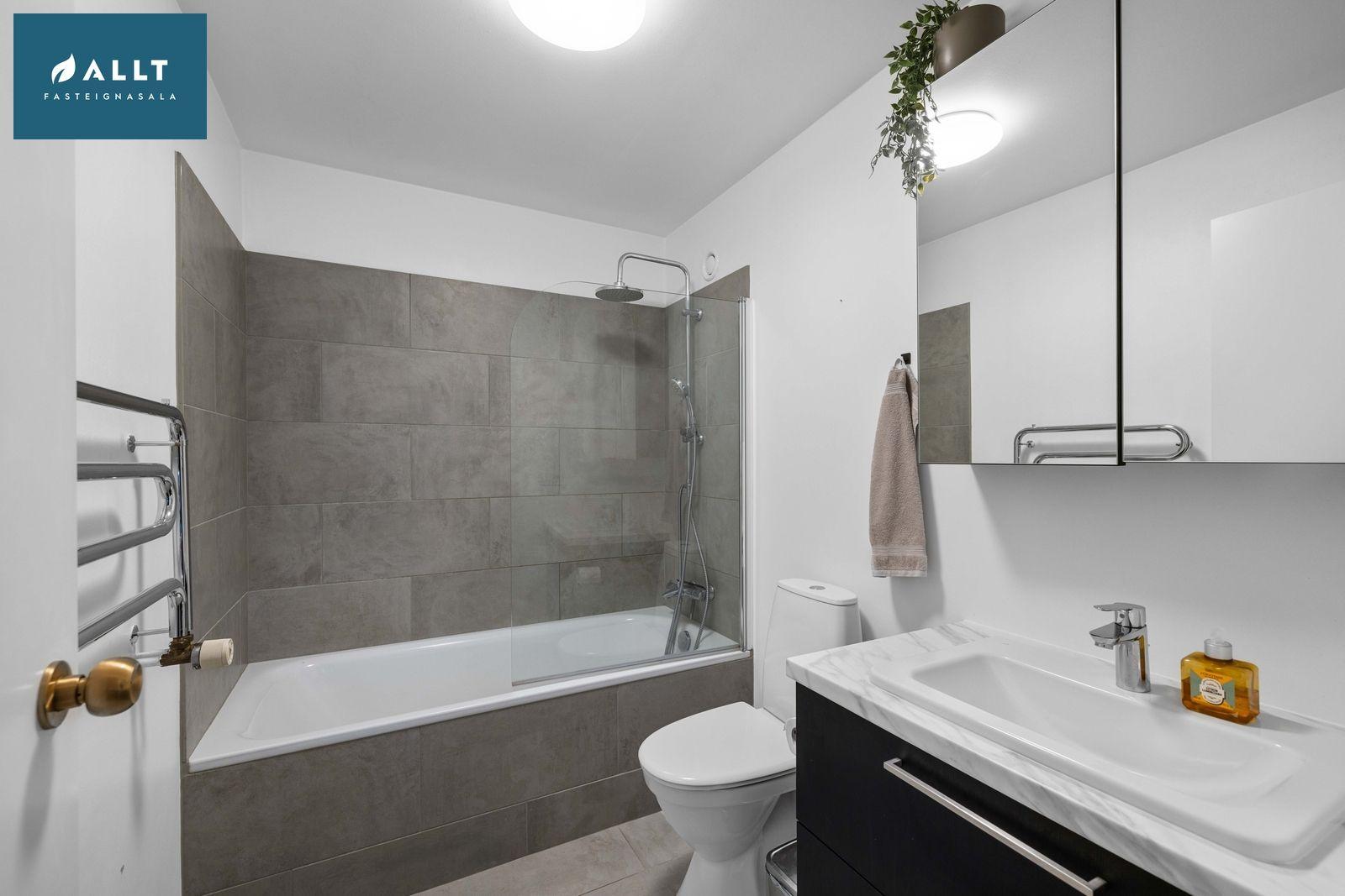 Baðherbergi: Nýlega uppgert með Nýlegri svarbrúnni innréttingu og gráum flísum hólf í gólf. Baðkar með sturtu.