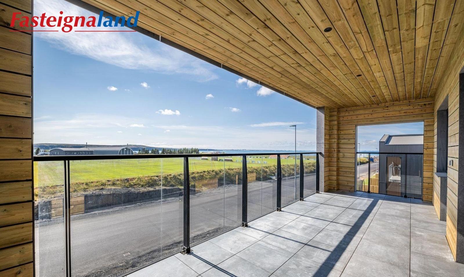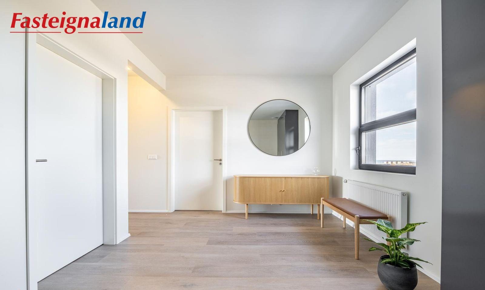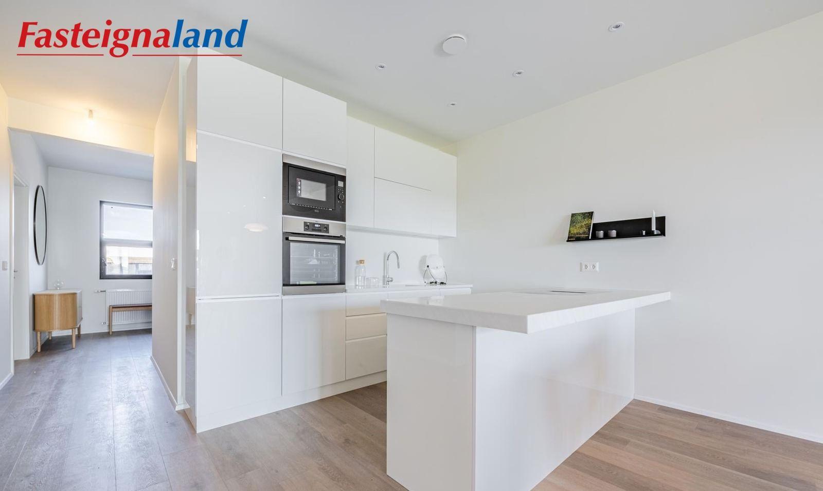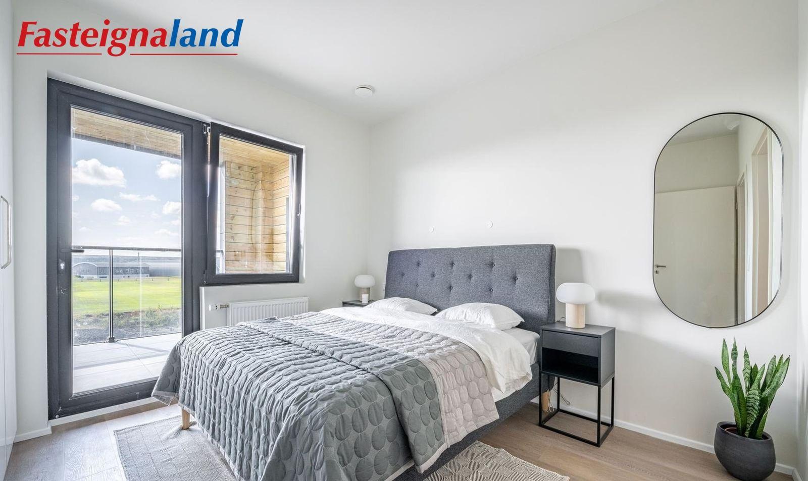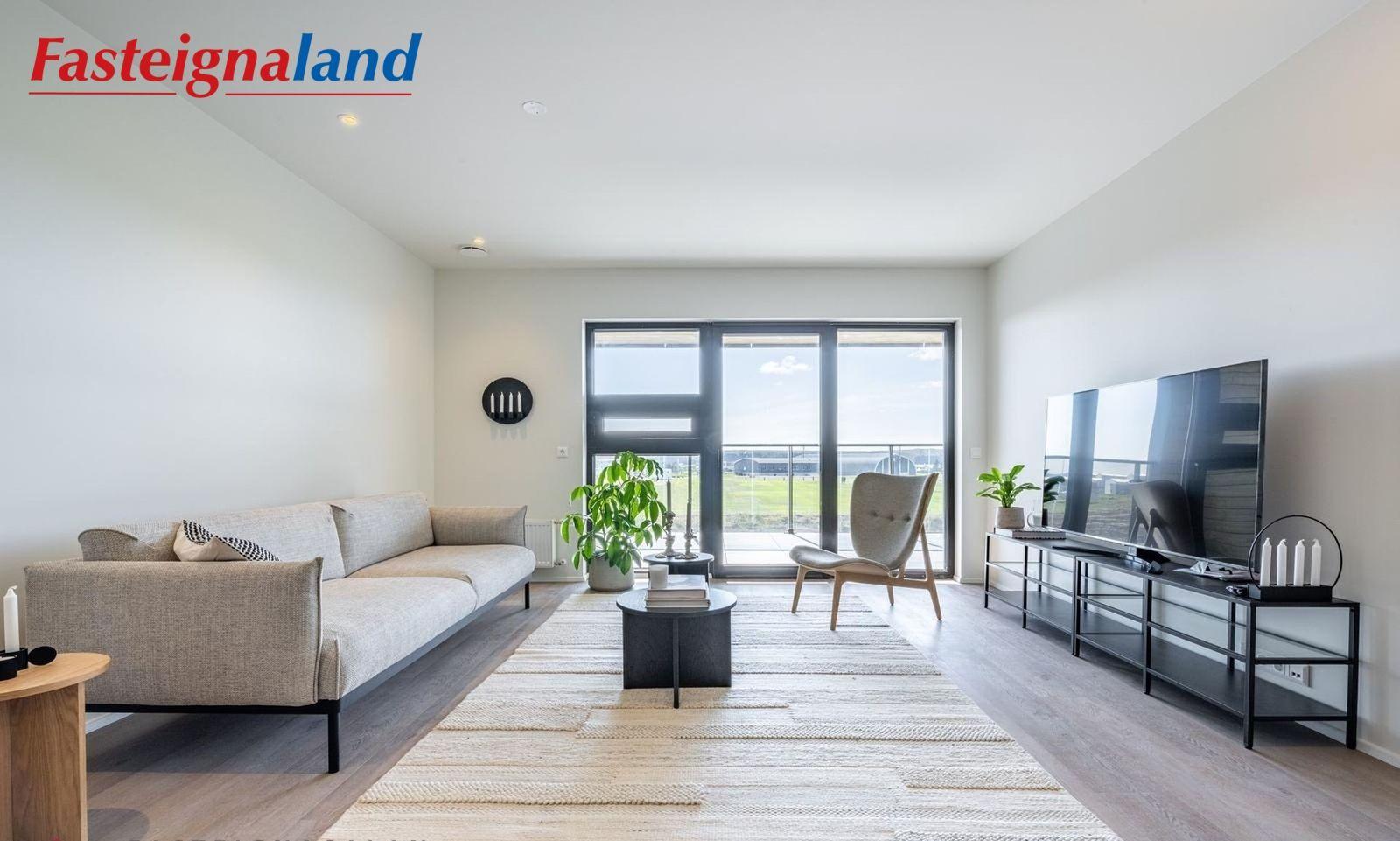 Nánari lýsing Anddyri: Með stórum fataskáp. Stofa: Björt og rúmgóð með útgengi á stórar suðursvalir. Hjónaherberg: Rúmgott með góðum fataskápum, útgengt á svalir. Svefnherbergi: Rúmgott með fastaskápum. Geymsla og Þvottahús: innan íbúðar. Baðherbergi: á gólfum og veggjum eru flísar 1m x 2.7m í marmara lit. Loftræstikerfi er á baðherbergi með sér lögnum. Baðherbergi er með 80 cm dökk grárri innréttingu með hvítum postulínsvaski. Í sturtu er hitastýritæki með höfuð og handsturtu og sturtugler. Innbyggður salerniskassi, upphengd salerniskál með hæglokandil Eldhús: Eldhúsinnréttingar eru hvítar og eru sérsmíðaðar með glans áferð. U laga eldhús með eldhúshellu þar sem hægt er að hafa 2-3 stóla við. Borðplata er úr Corian & er eldhusvaskur hannaður ofan í plötuna í sama efni. Eldhústæki eru frá Ormsson og eru eftirfarandi: Eldavél – AEG Spanhelluborð m/Viftu. Bakaraofn – AEG Veggofn blástursofn blástursofn m/kjöthitamæli svartur. Örbylgjuofn - AEG 26 lítra – 900 wött -stál. Ísskápur Innbyggður- AEG 177,9x54x54,9 með frysti fylgir íbúðum. AEG Uppþvottavél fylgir íbúðinni.