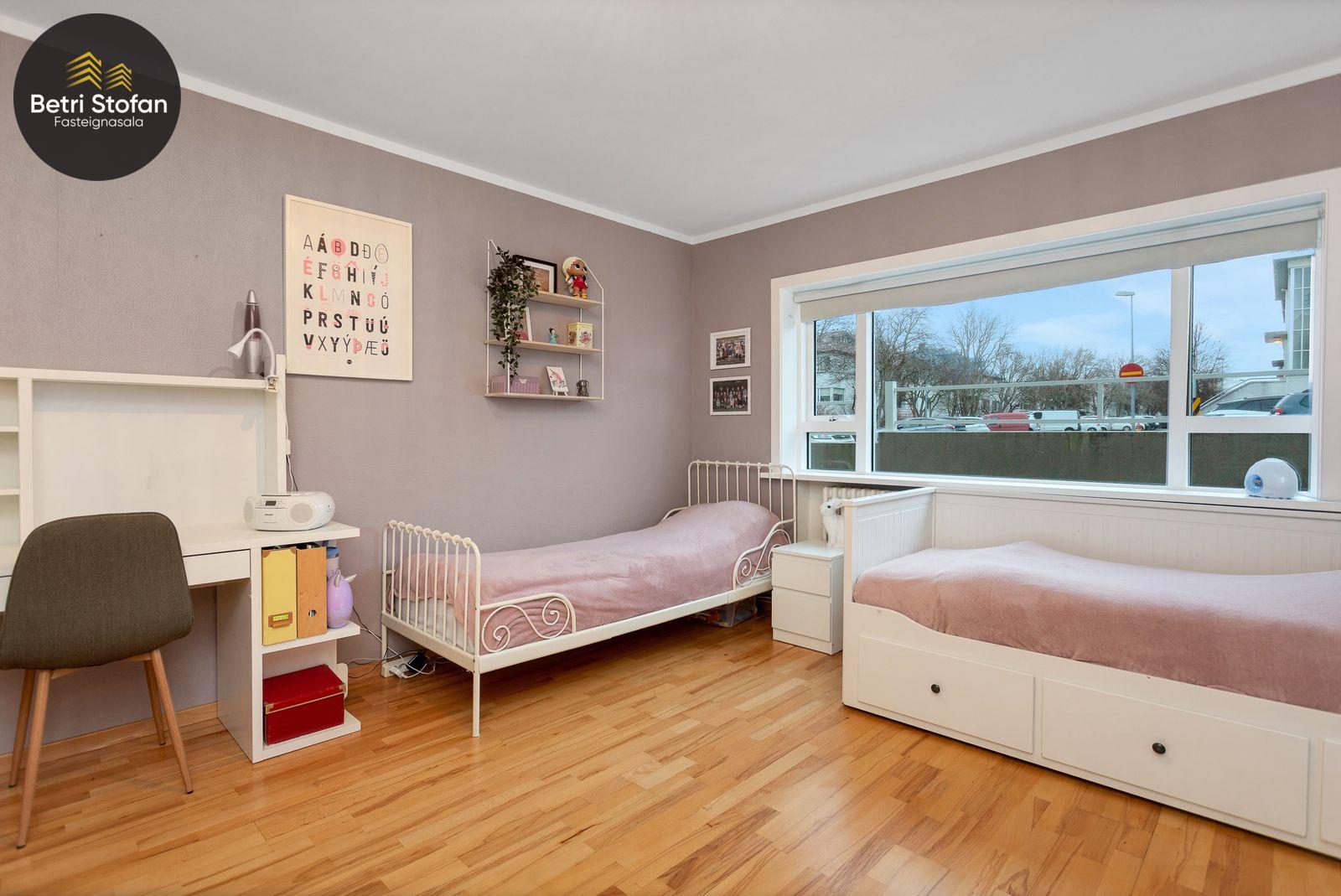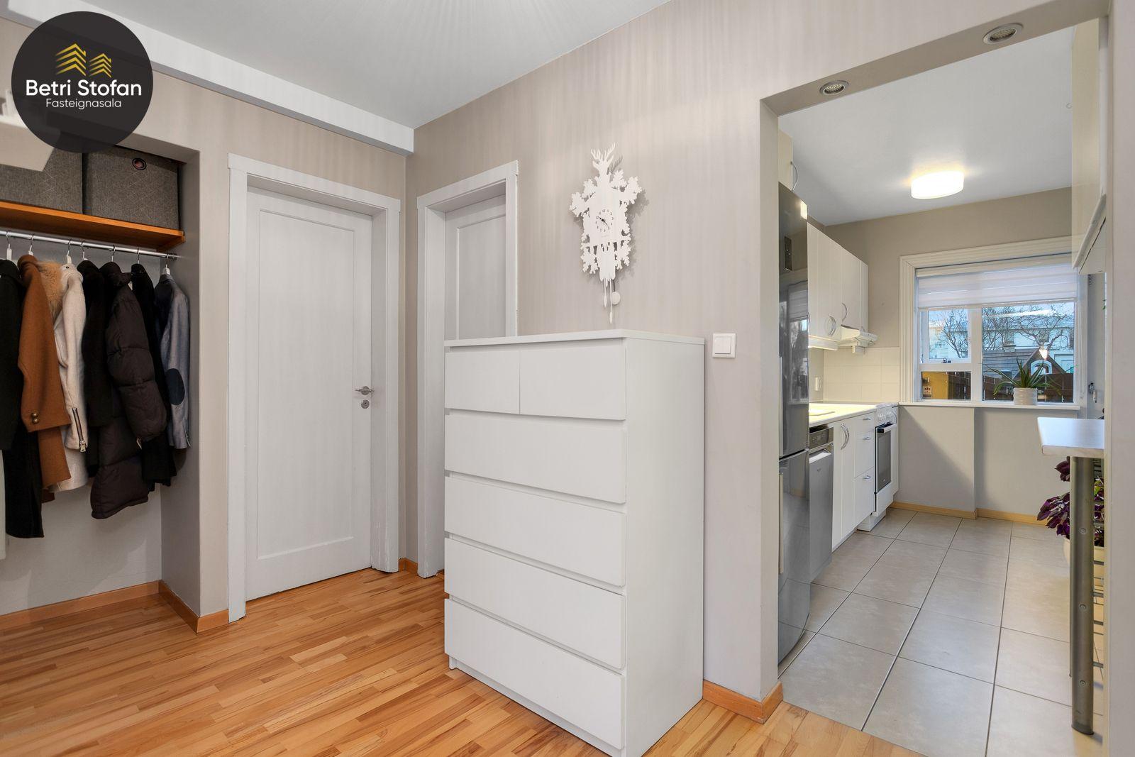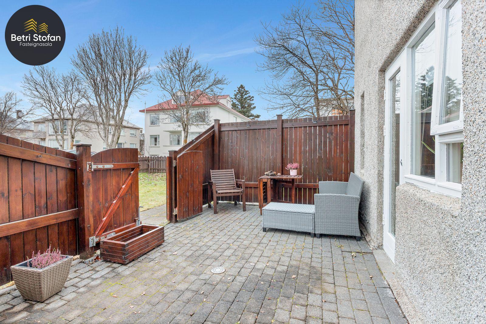 Nánari lýsing: Anddyri: Inngangur á hlið hússins, flísalagt sameiginlegt rými. Anddyri / hol með parketi á gólfi og fatahengi. Stofa: Rúmgóð og fín með parketi á gólfi. Eldhús: Hvít snyrtileg innrétting, flísar á gólfi, innaf eldhúsi er búr. Úr eldhúsi er útgengt á stóra afgirta sér verönd. Svefnherbergi: Tvö sérstaklega rúmgóð og fín herbergi, bæði með parketi á gólfi og fataskápum. Baðherbergi: Flísalagt, þar er hvít fín innrétting, vegghengt salerni og góð sturta, gluggi er á baðherberginu og gólfhiti. Sameign: Þvottahús er sameiginlegt ásamt hjóla og vagnageymslu. Sameiginleg geymsla er í risi og útigeymsla. Eigendur hafa einnig notað geymslu undir stiga. Húsið: Eigin hefur verið talsvert endurnýjuð í gegnum árin og má þar nefna ofnalagnir, skólp ofl.
