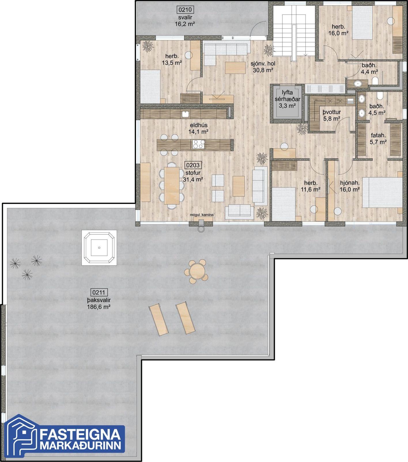 Birt stærð íbúðar 0203 er 241,8 fermetrar. Áætlaður afhendingartími er í febrúar 2026.