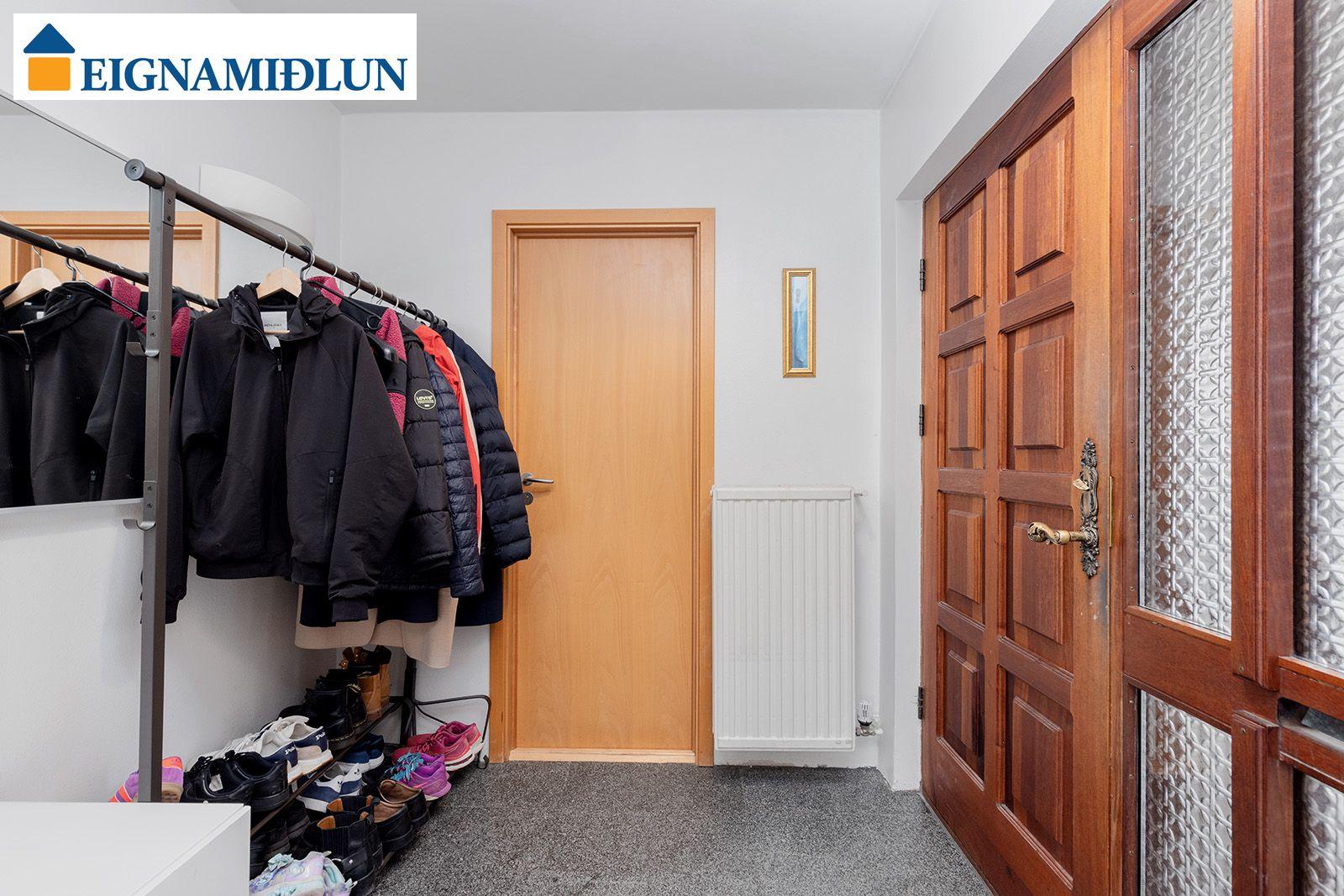 Forstofa er rúmgóð með flísum á gólfi, gestasalerni inn af forstofu.