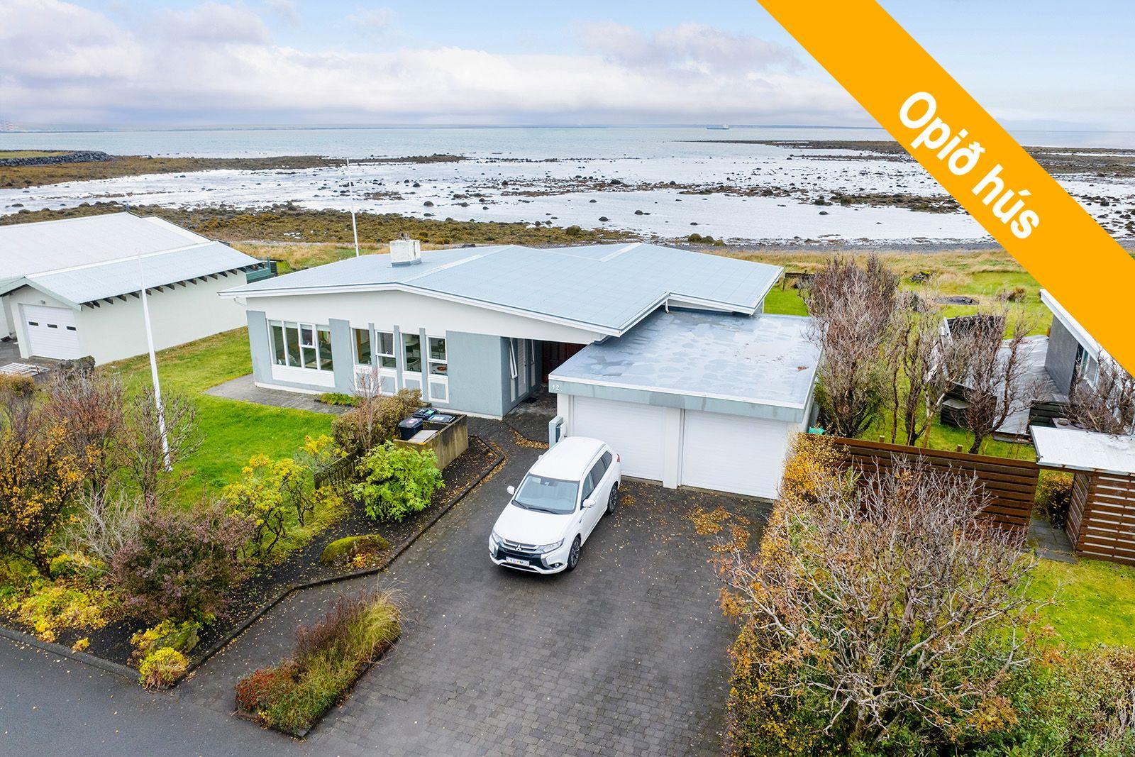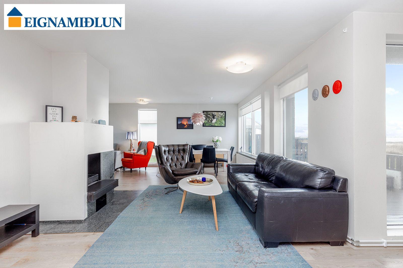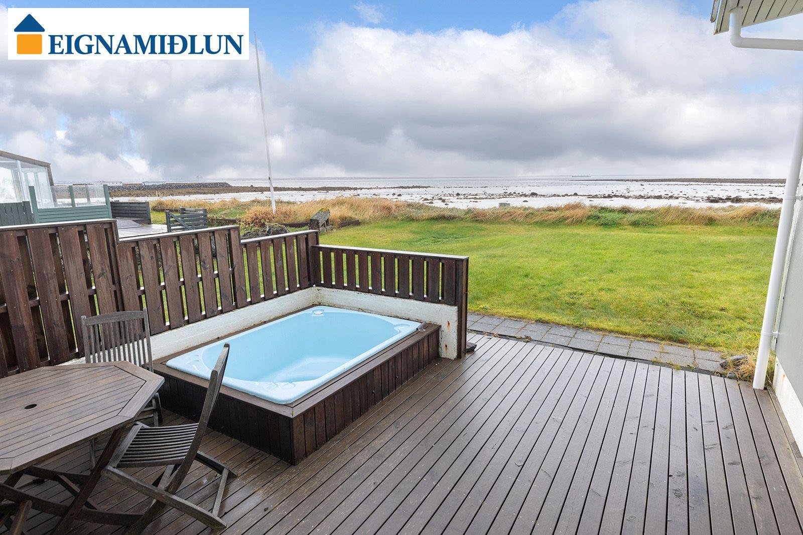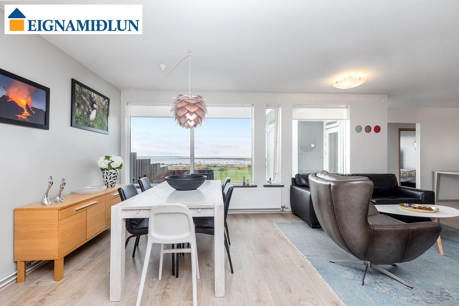 Komið er inn í alrými frá forstofu. Stórir gluggar í bjartri stofu með frábæru sjávarútsýni. Arin í stofu/borðstofu. Stofa og borðstofa með útgangi til á pall með heitum potti.