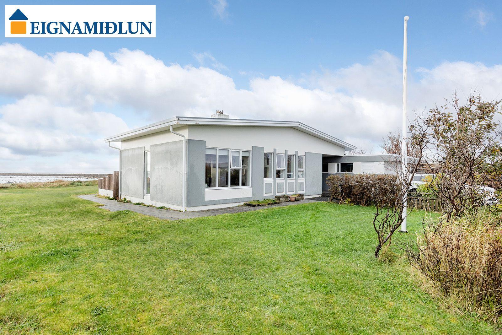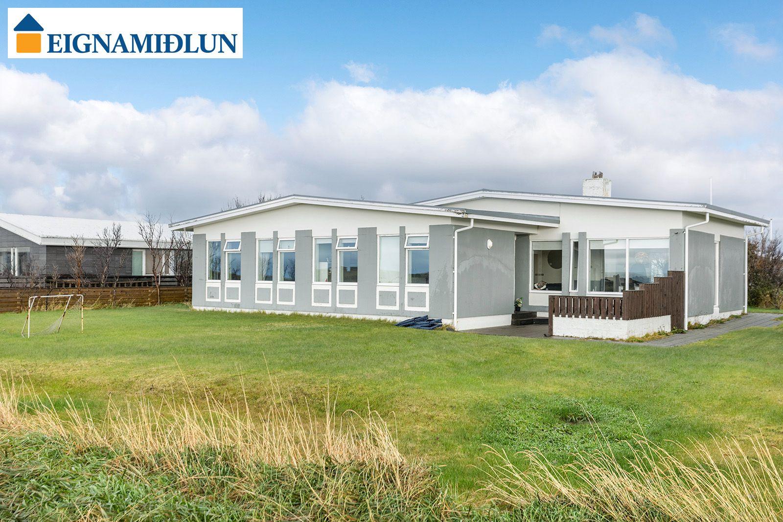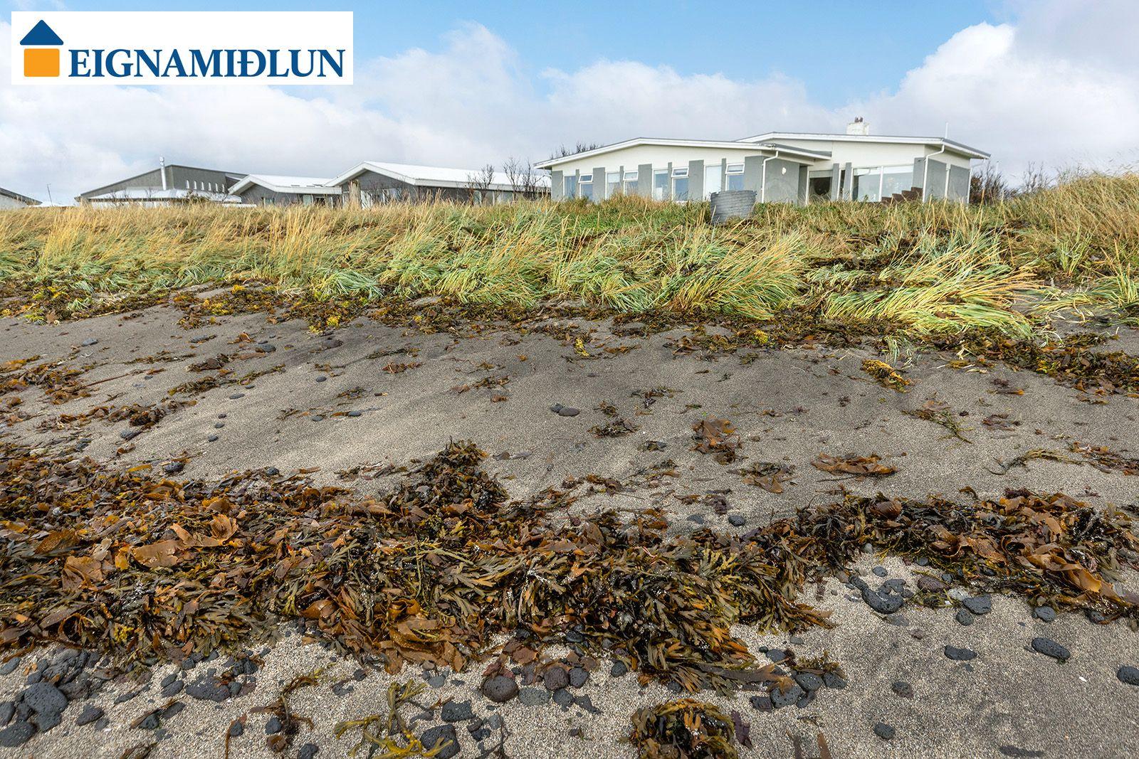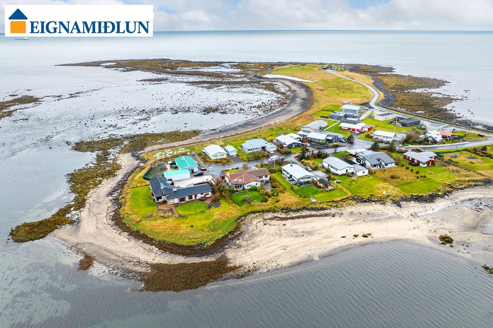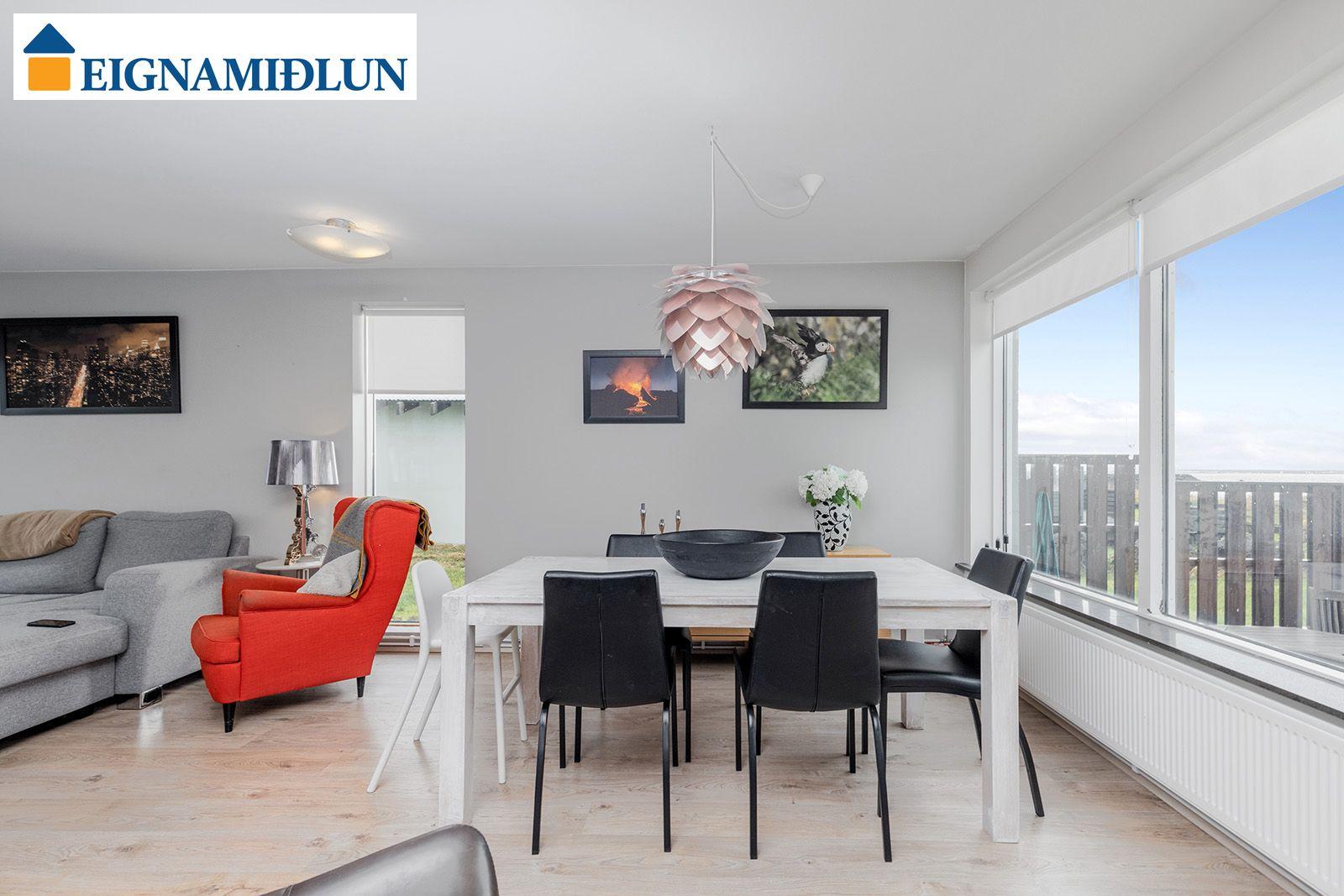 Komið er inn í alrými frá forstofu. Stórir gluggar í bjartri stofu með frábæru sjávarútsýni. Arin í stofu/borðstofu. Stofa og borðstofa með útgangi til á pall með heitum potti.