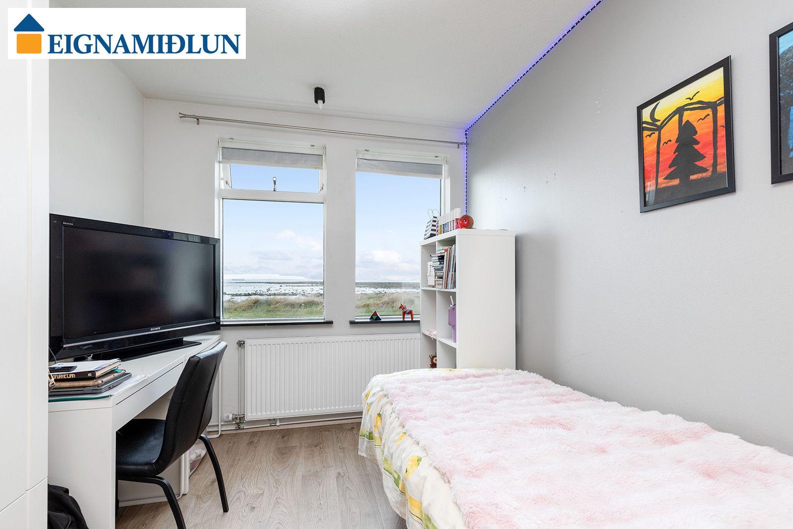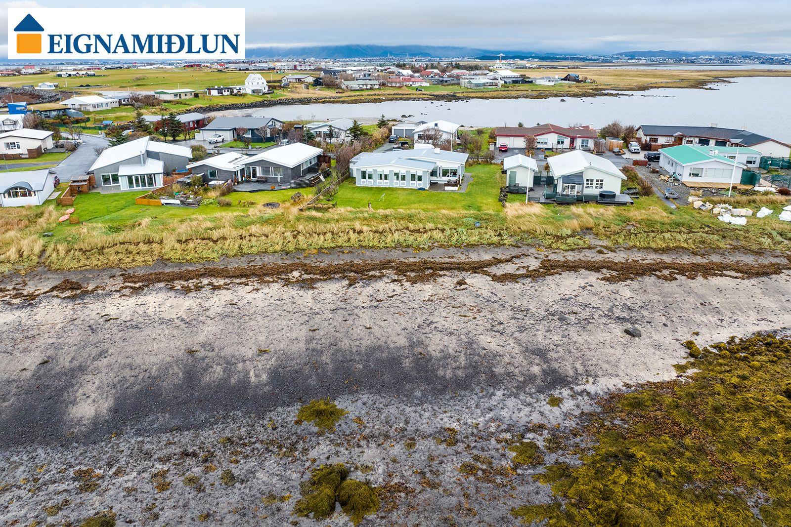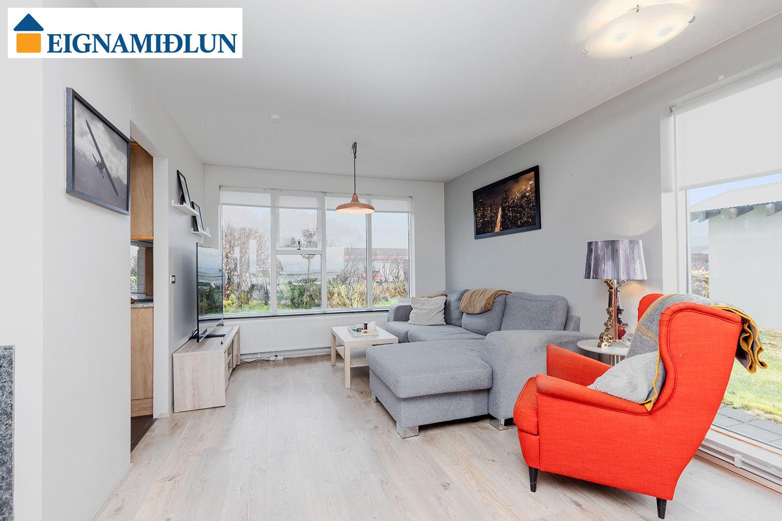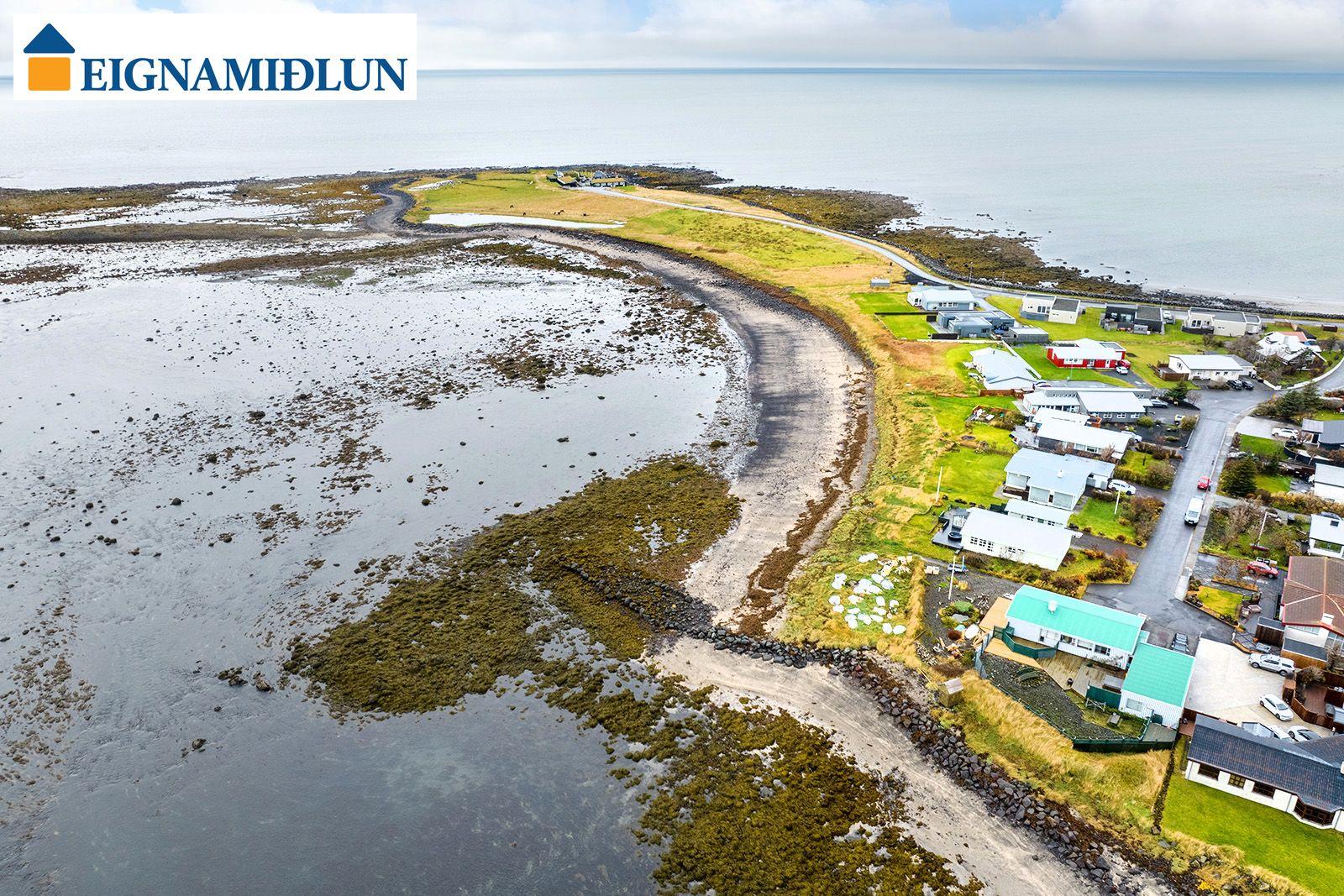 Komið er inn í alrými frá forstofu. Stórir gluggar í bjartri stofu með frábæru sjávarútsýni. Arin í stofu/borðstofu. Stofa og borðstofa með útgangi til á pall með heitum potti.