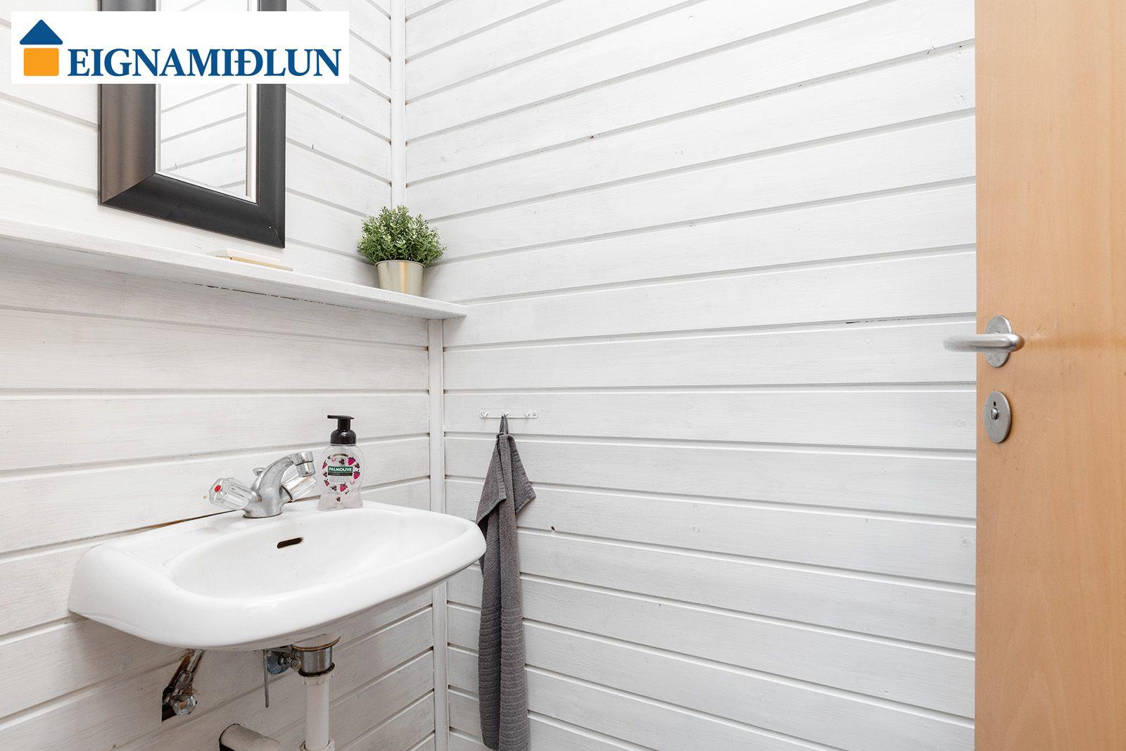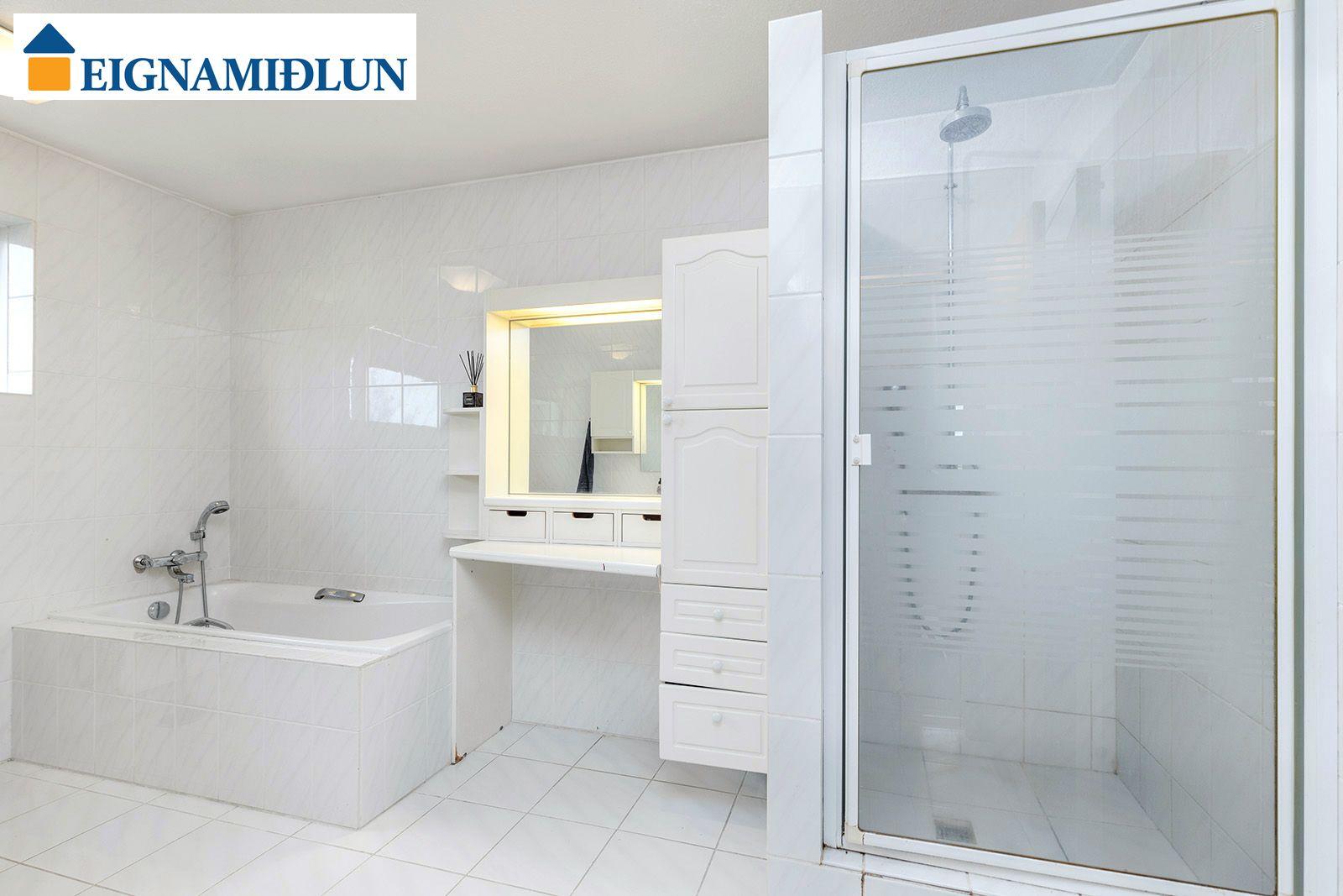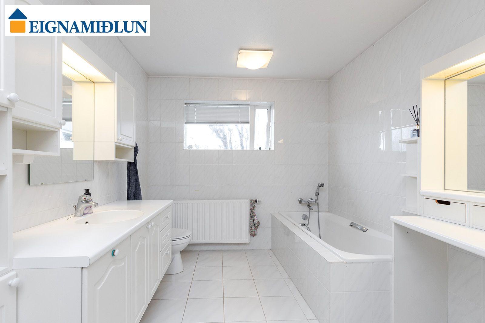 Baðherbergi er flísalagt í hólf og gólf með ljósum flísum, eldri innréttingu, salerni, stórum sturtuklefa og baðkari. Inn af baðherbergi er geymsla sem upprunalega samkvæmt teikningu átti að vera rými fyrir saunaklefa.