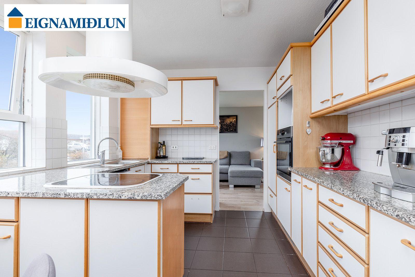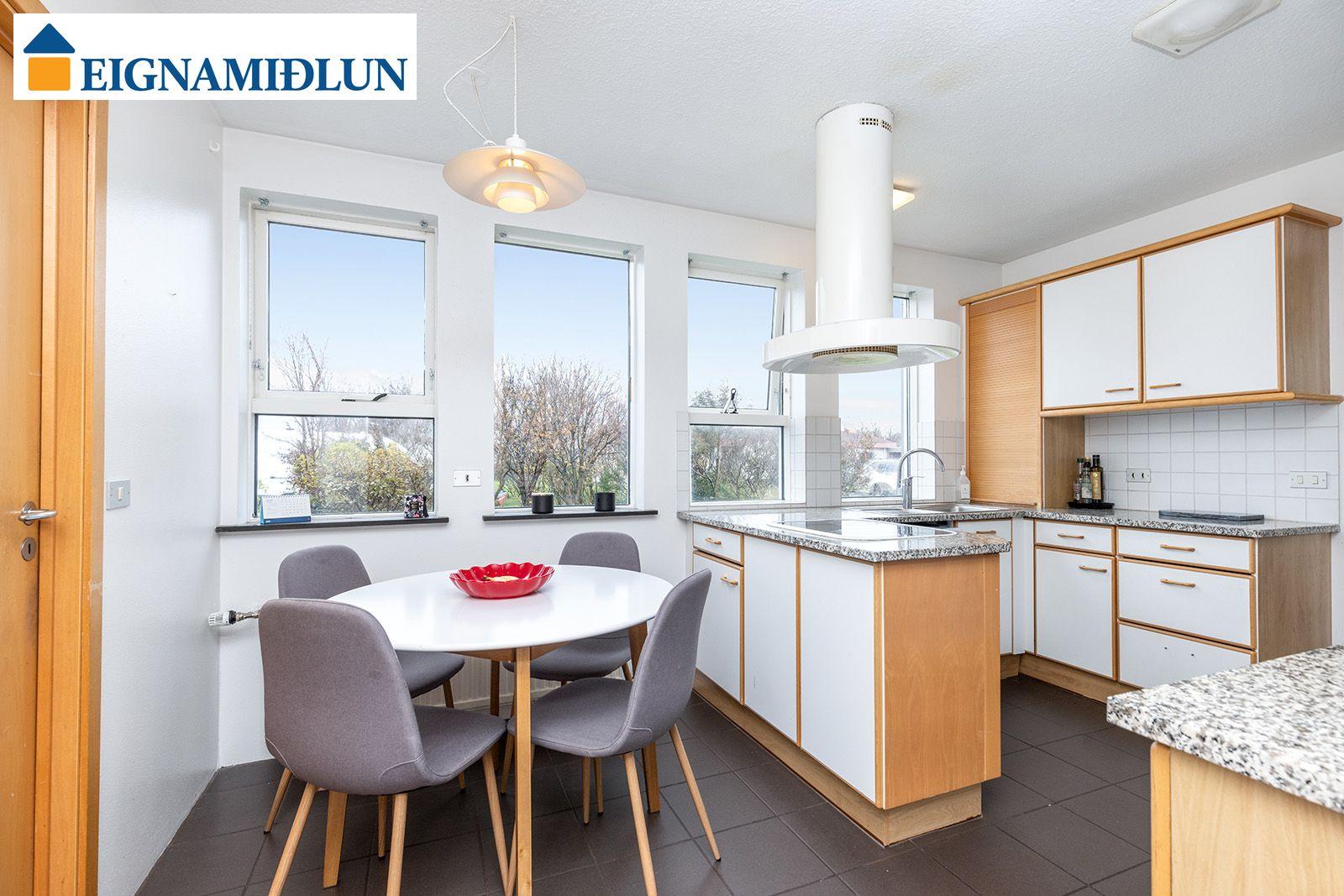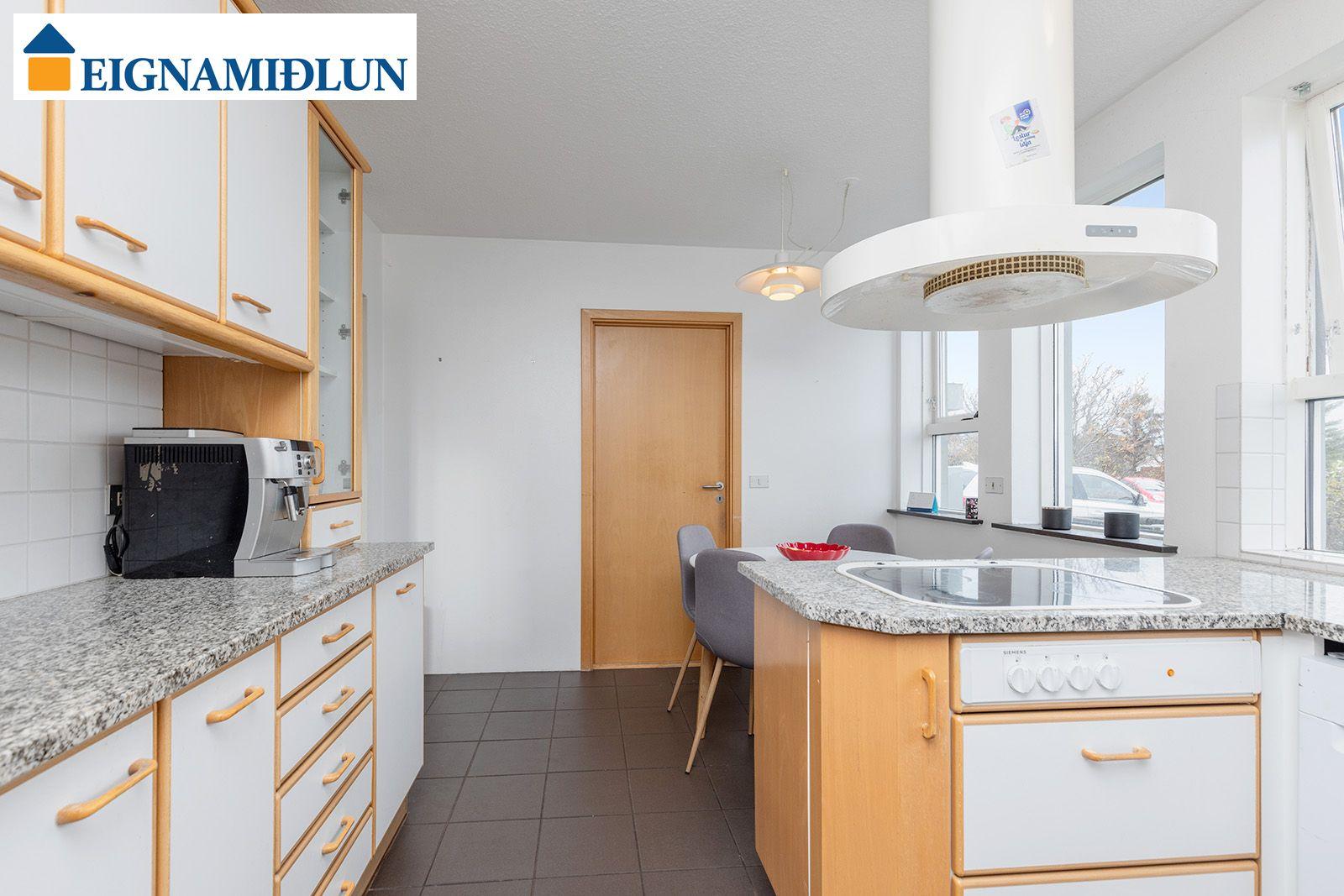 Eldhús með eldri hvítri innréttingu, steinn á borðum, ofn í vinnuhæð. Mjög gott skápapláss og eldavél á eyju með háf, fín vinnuaðstaða. Flísar á gólfum og gott rými fyrir eldhúsborð. Búr/þvottahús inn af eldhúsi.