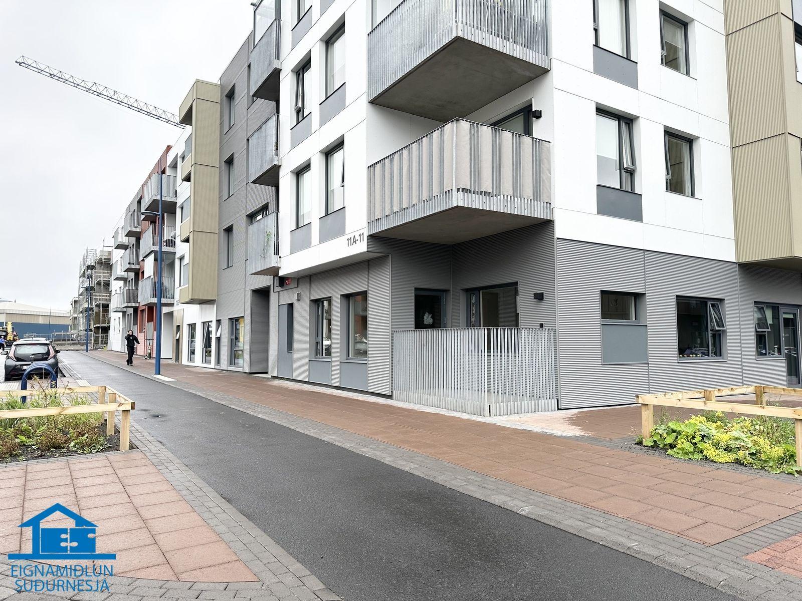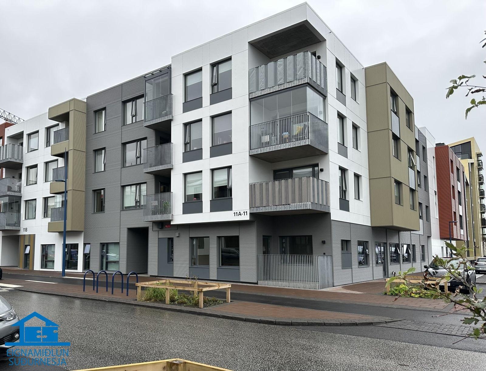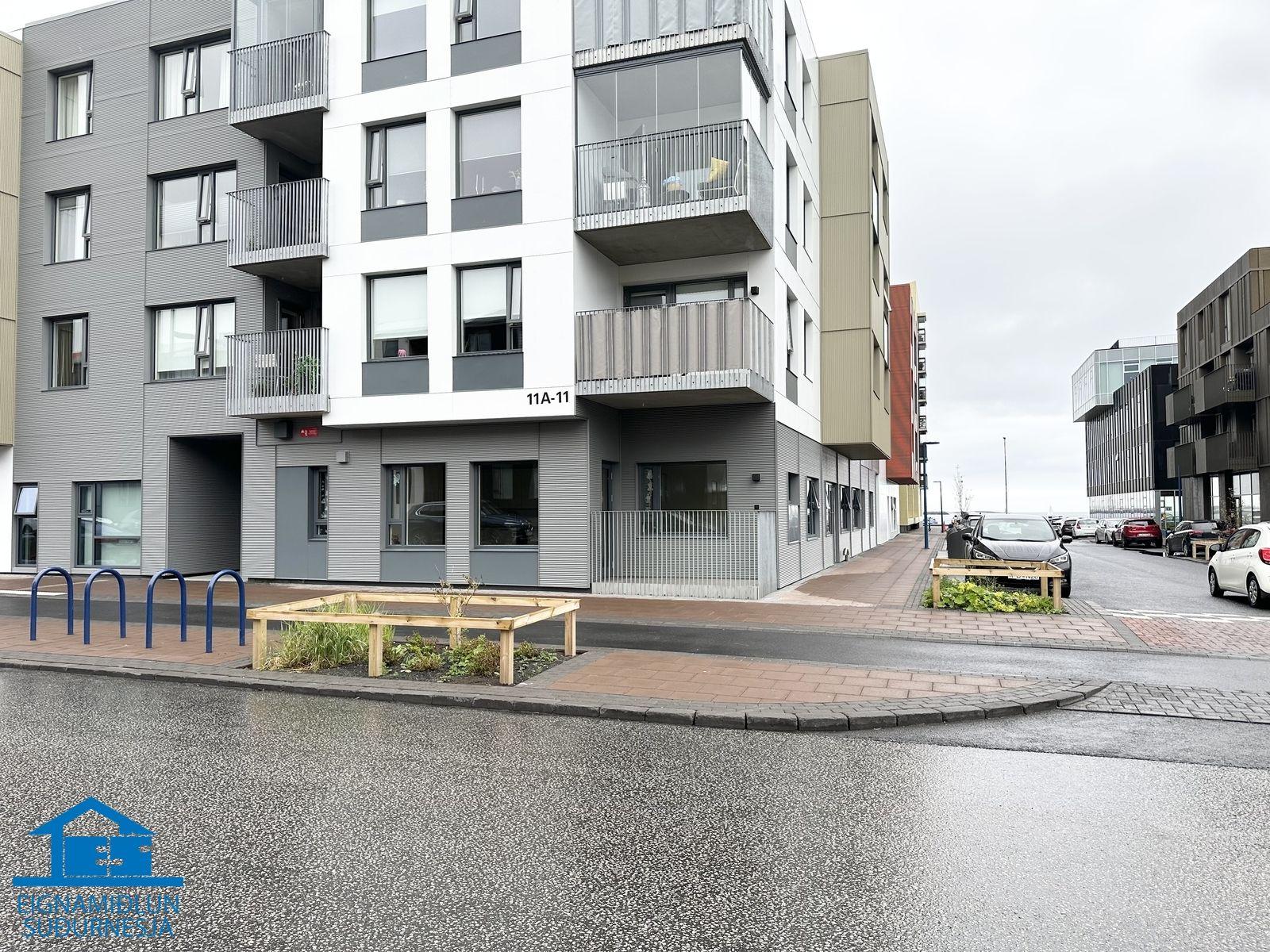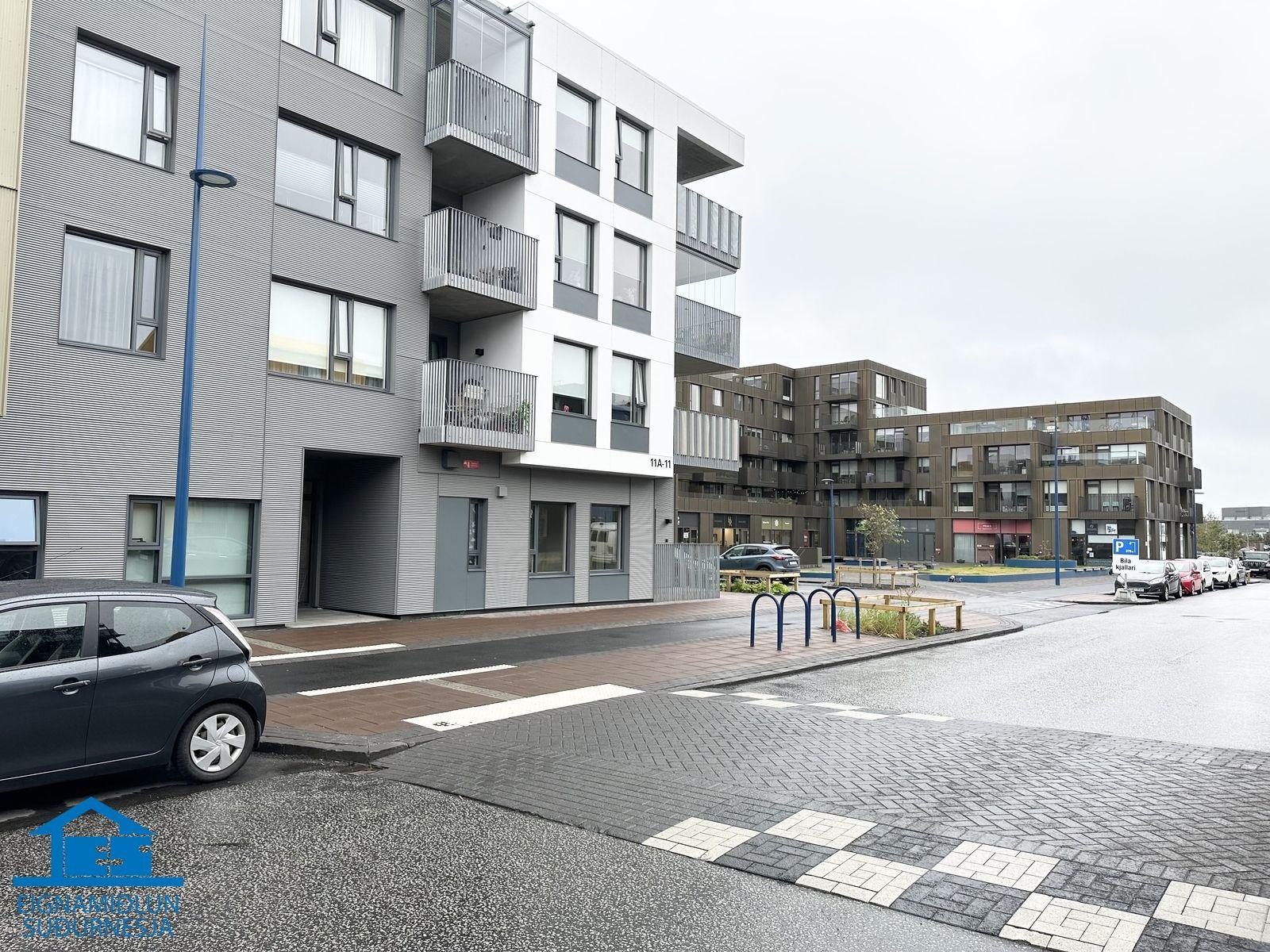 Nánari lýsing: Eign merkt 114. Komið er inn um anddyri með parket á gólfi. Eldhús og borðstofa eru í opnu björtu rými, þar er útgengi út á svalir. Baðherbergi hefur flísar á gólfi og veggjum, upphengt salerni, sturta og innrétting, þar er opnanlegur gluggi. Eldhús: Borðplata er svört að lit. Eldhúsinnrétting með góðum tækjum og búnaði, spanhelluborði og ofn. Lóð: Snjóbræðsla er að hluta í helstu göngustígum í garði. Hluti af lóð hússins er afgirt leiksvæði fyrir leikskólann. Sér geymsla í sameign.