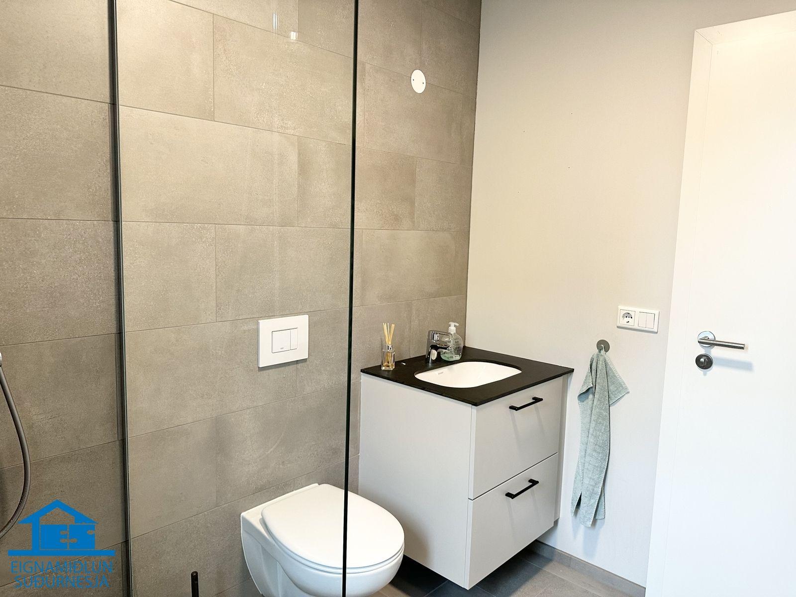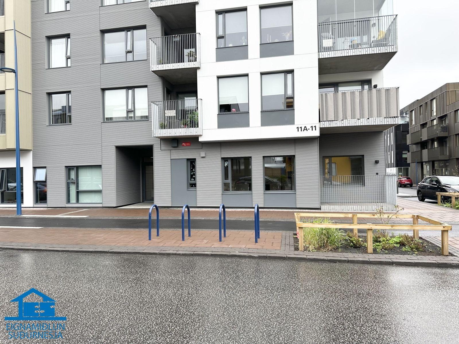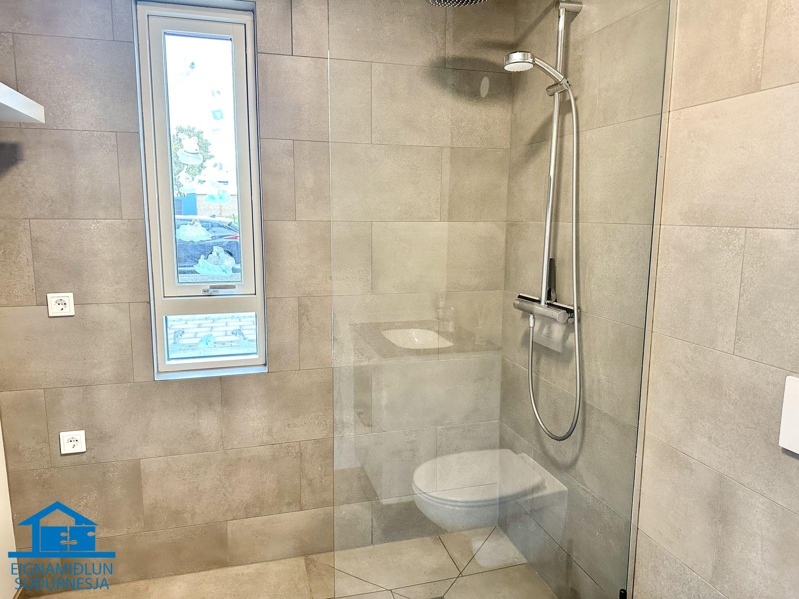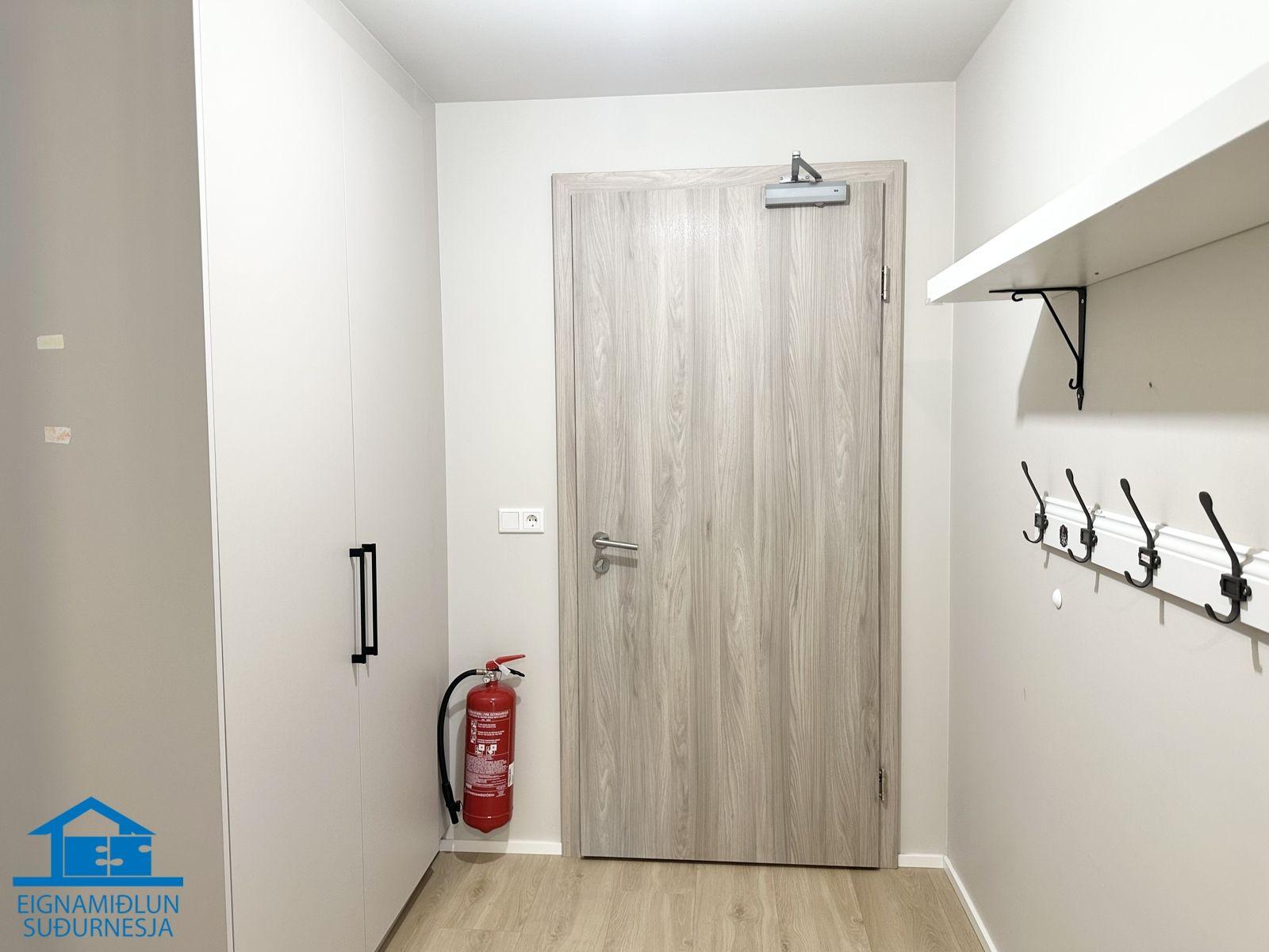 Nánari lýsing: Eign merkt 114. Komið er inn um anddyri með parket á gólfi. Eldhús og borðstofa eru í opnu björtu rými, þar er útgengi út á svalir. Baðherbergi hefur flísar á gólfi og veggjum, upphengt salerni, sturta og innrétting, þar er opnanlegur gluggi. Eldhús: Borðplata er svört að lit. Eldhúsinnrétting með góðum tækjum og búnaði, spanhelluborði og ofn. Lóð: Snjóbræðsla er að hluta í helstu göngustígum í garði. Hluti af lóð hússins er afgirt leiksvæði fyrir leikskólann. Sér geymsla í sameign.