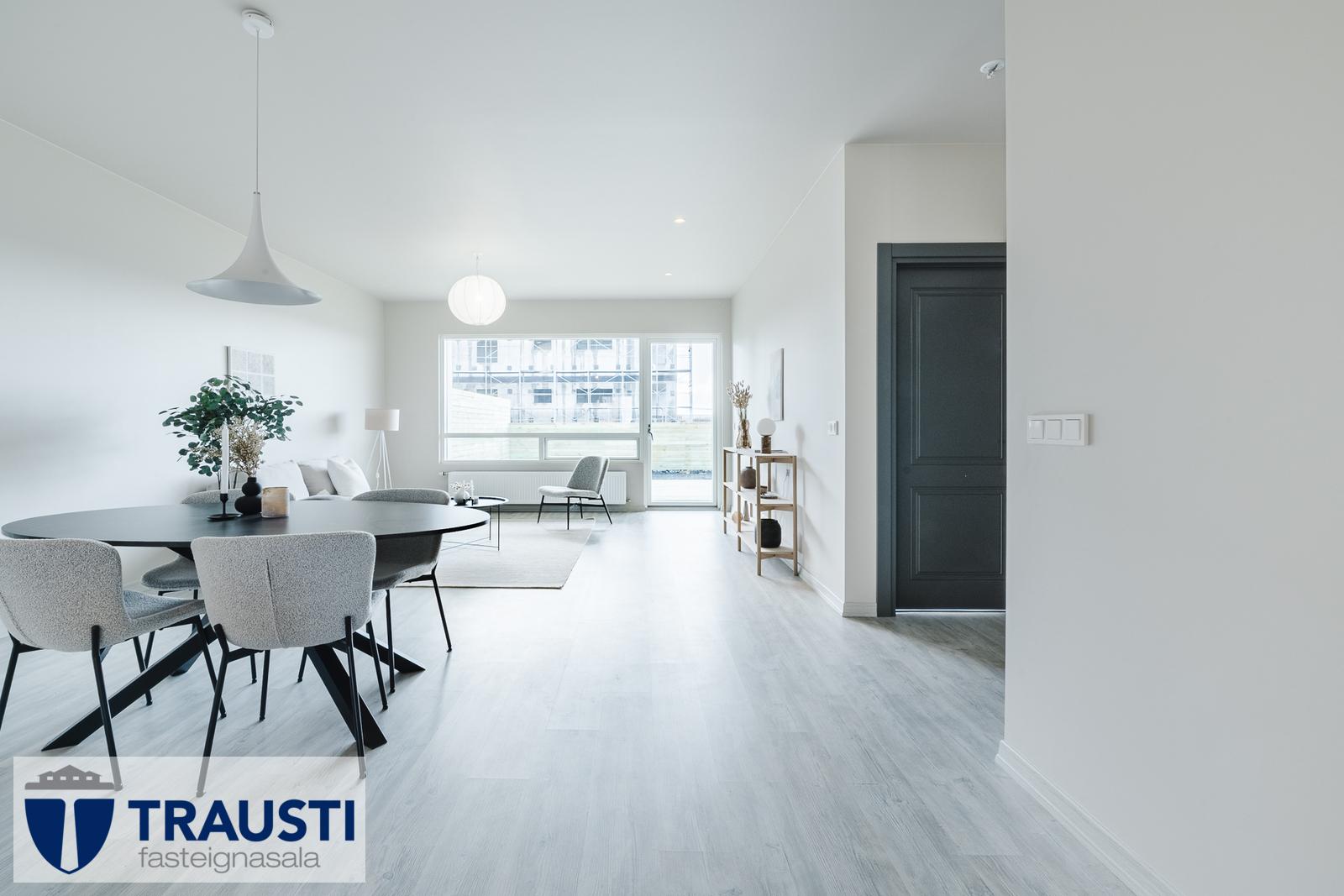 Þessi bjarta og vel skipulagða íbúð státar af aukinni lofthæð, innfelldri lýsingu og rúmgóðu alrými sem sameinar stofu, borðstofu og eldhús.