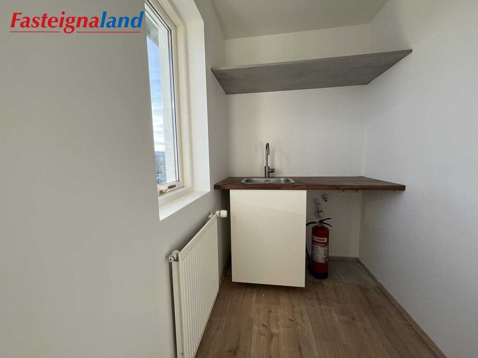 Nánari lýsing: Forstofa með parketi á gólfi, Eldhús og stofa eru í opnu rými með parketi á gólfi. Stílhrein ný innrétting með span helluborði og innbyggðri uppþvottavél. Frá stofu er útgengt á svalir með fallegu útsýni. Svefnherbergi með parketi á gólfi. Baðherbergi með flísum á gólfi og veggjum að hluta. Þar er hvít innrétting, upphengt salerni, handklæðaofn og sturta. Þvottaherbergi innan íbúðar með flísum á gólfi og innréttingu. Sér geymsla fylgir íbúðinni sem staðsett er í sér húsi á baklóð.