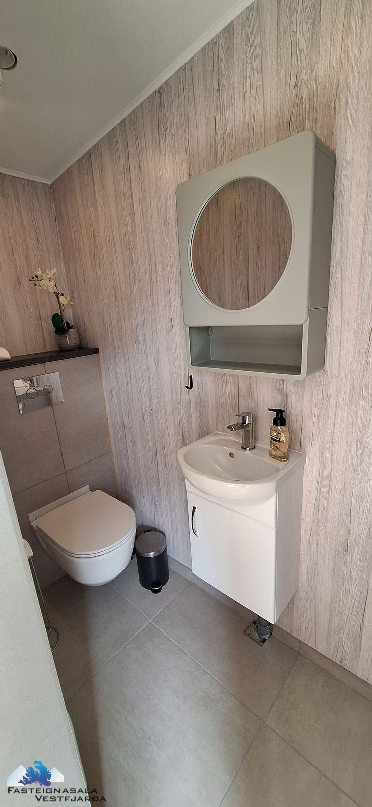 Lítil snyrting á neðri hæð með flísum á gólfi, vaskur og skápur.