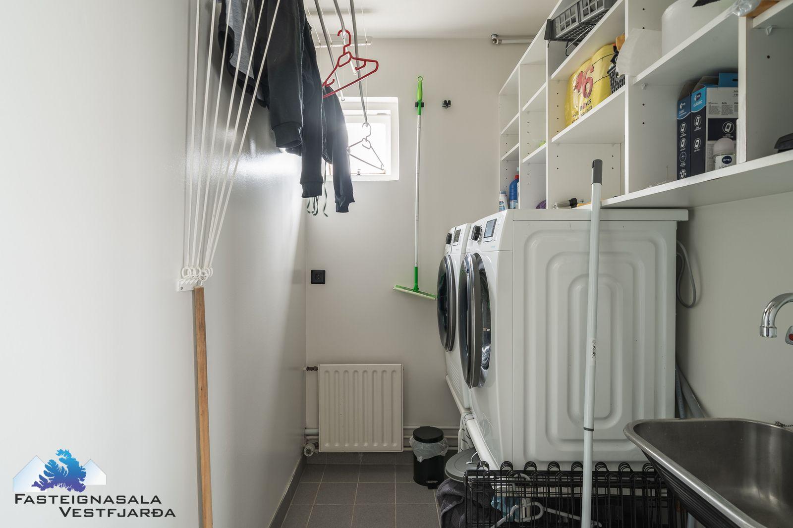 Þvottaherbergi með flísum á gólfi, gott hillupláss, vaskur og gott rými fyrir þvottavél og þurrkara.