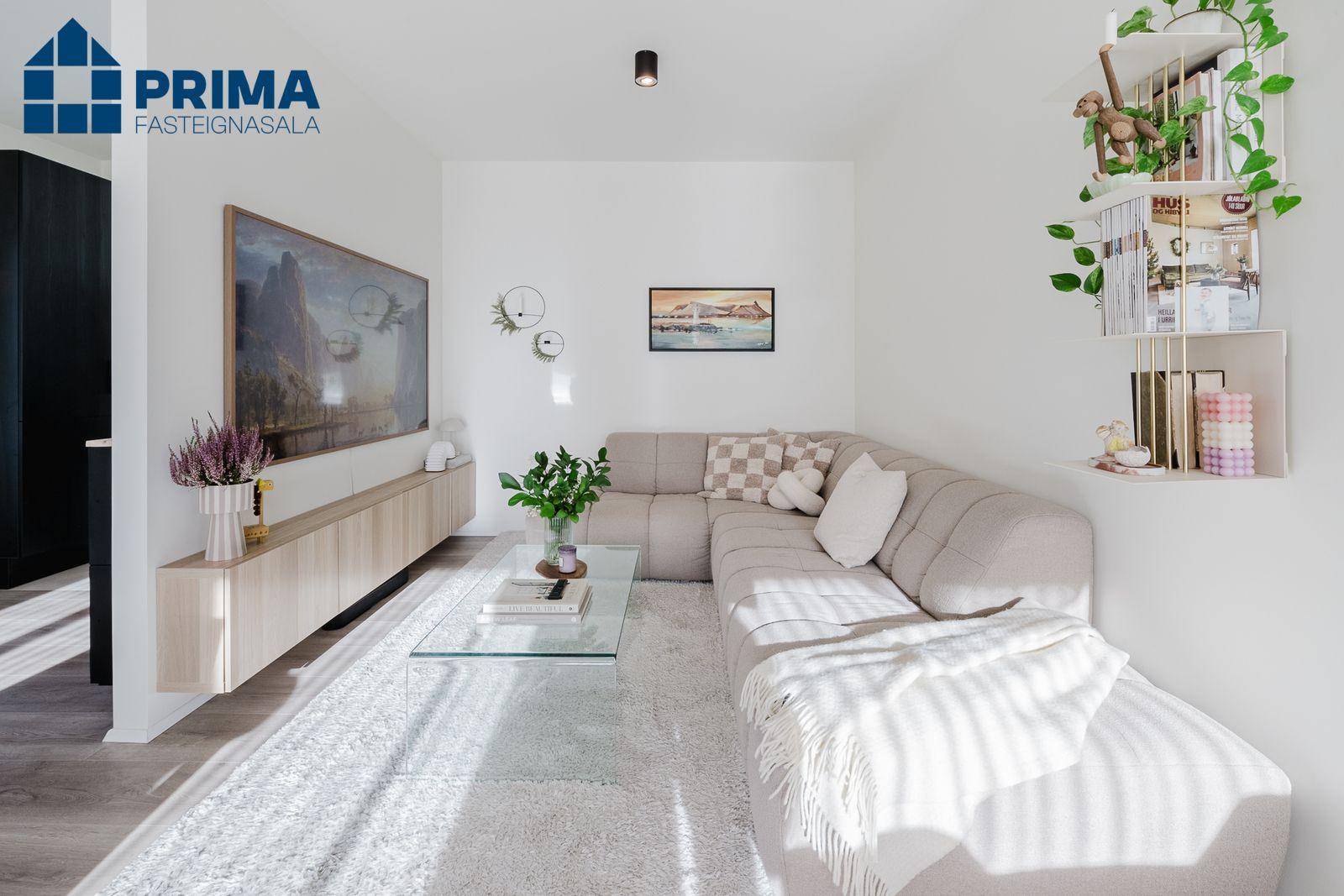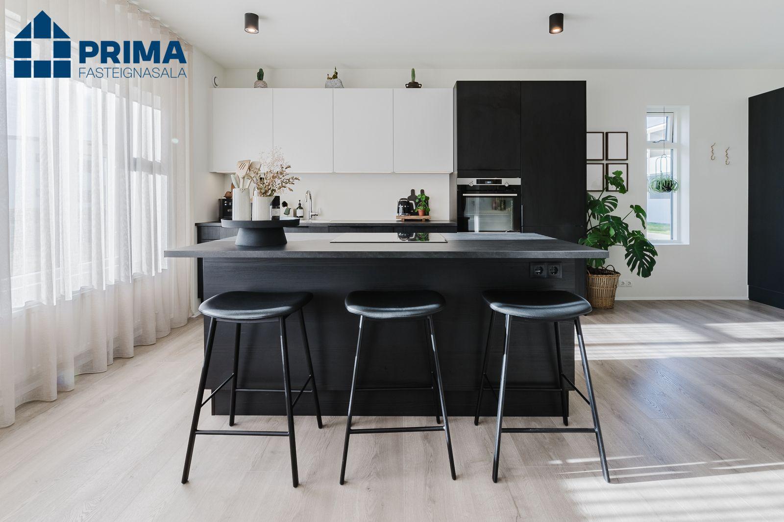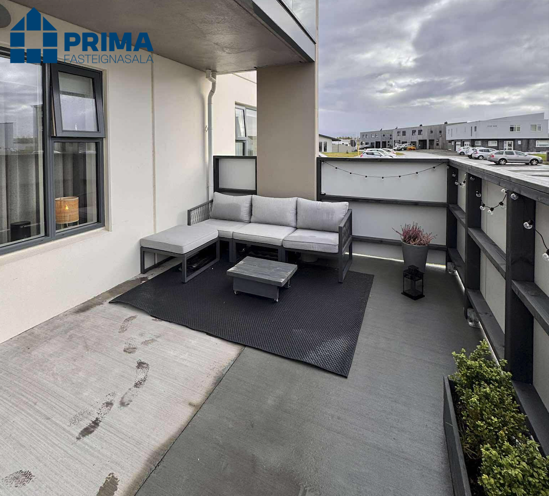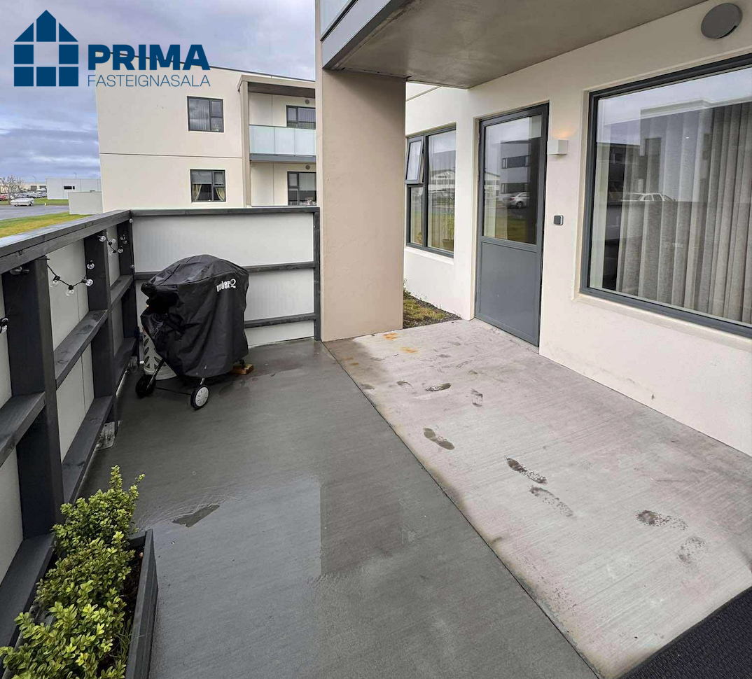 Alrýmið: Eldhús/stofa/borðstofa í sama rými. Bjart og rúmgott með parketi á gólfi. Falleg eldhúsinnréttingin með innbyggðum ísskáp og uppþvottavél. Gengið út á steypta lokaða verönd.