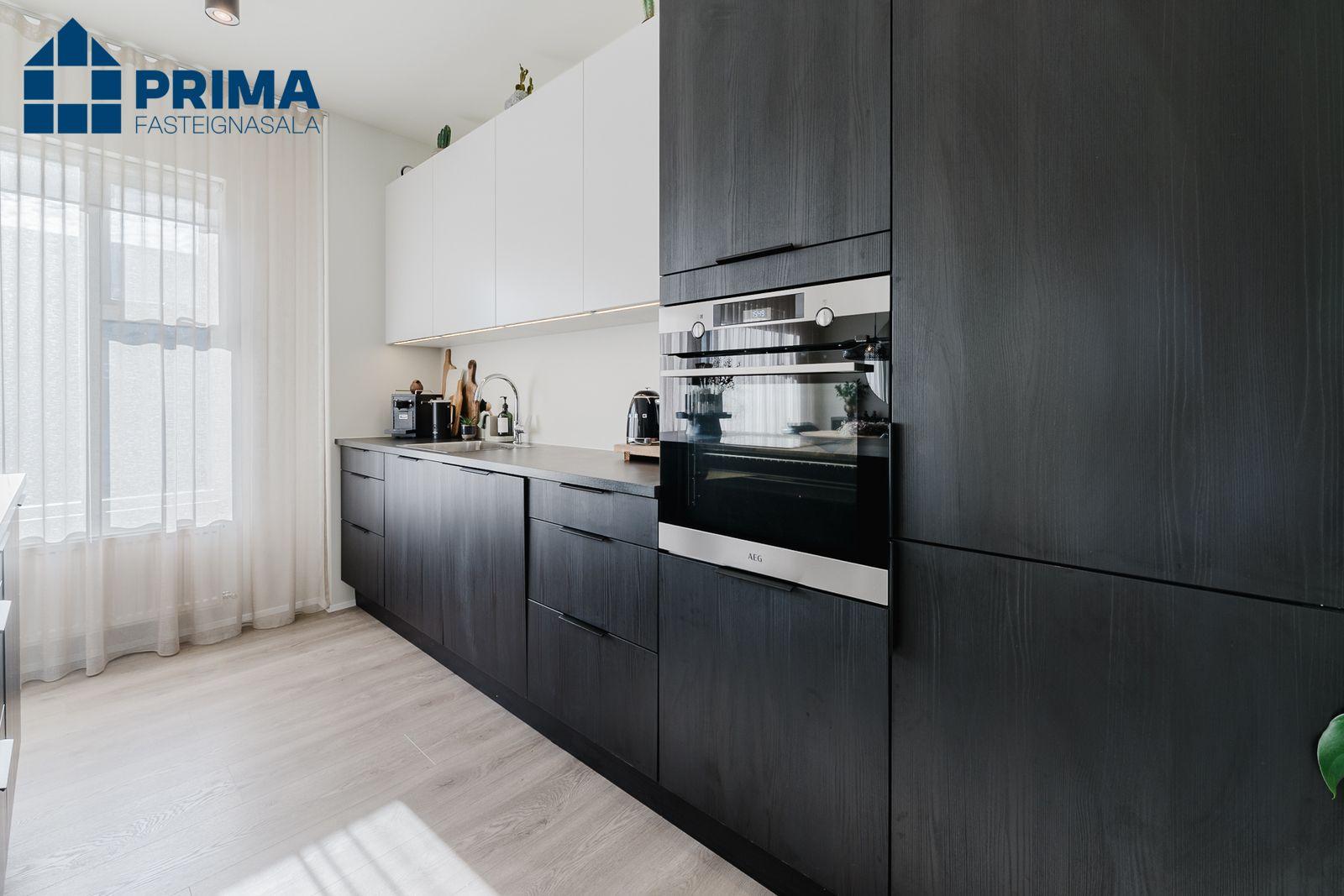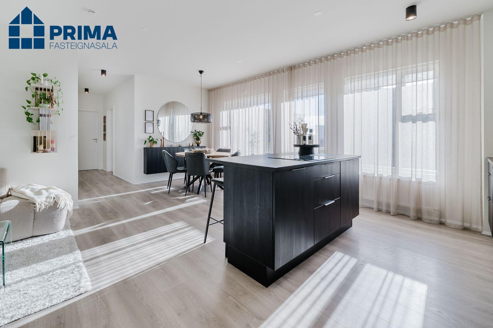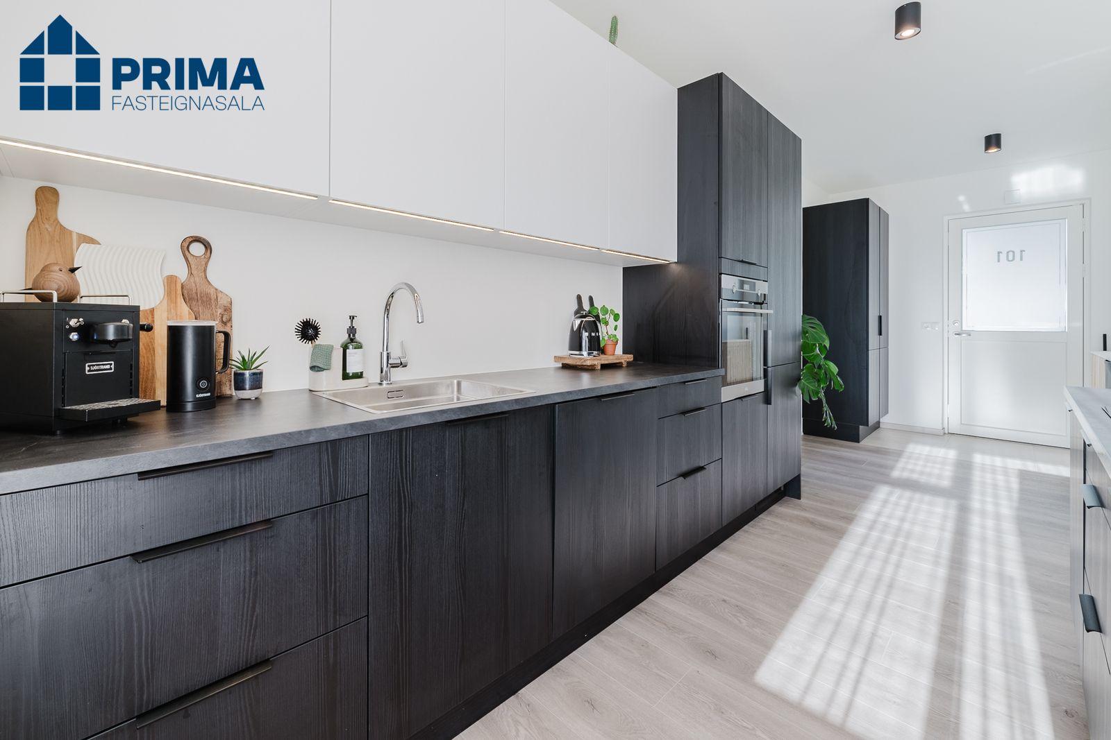 Alrýmið: Eldhús/stofa/borðstofa í sama rými. Bjart og rúmgott með parketi á gólfi. Falleg eldhúsinnréttingin með innbyggðum ísskáp og uppþvottavél. Gengið út á steypta lokaða verönd.