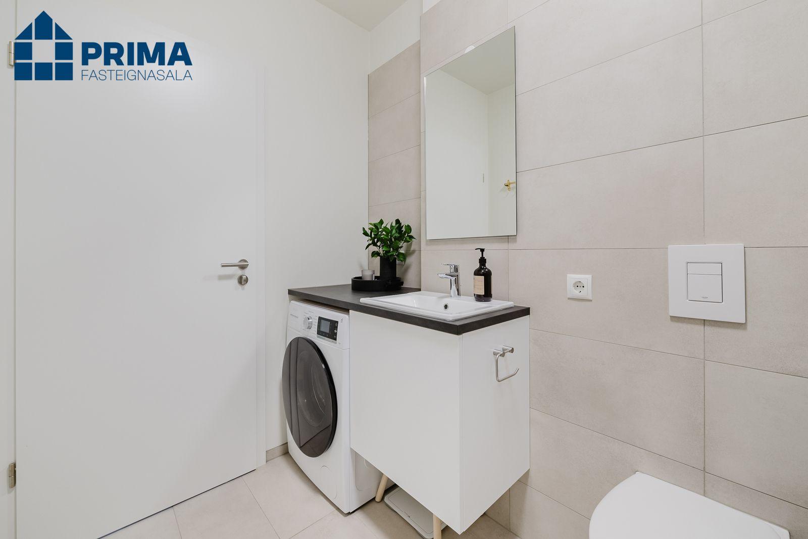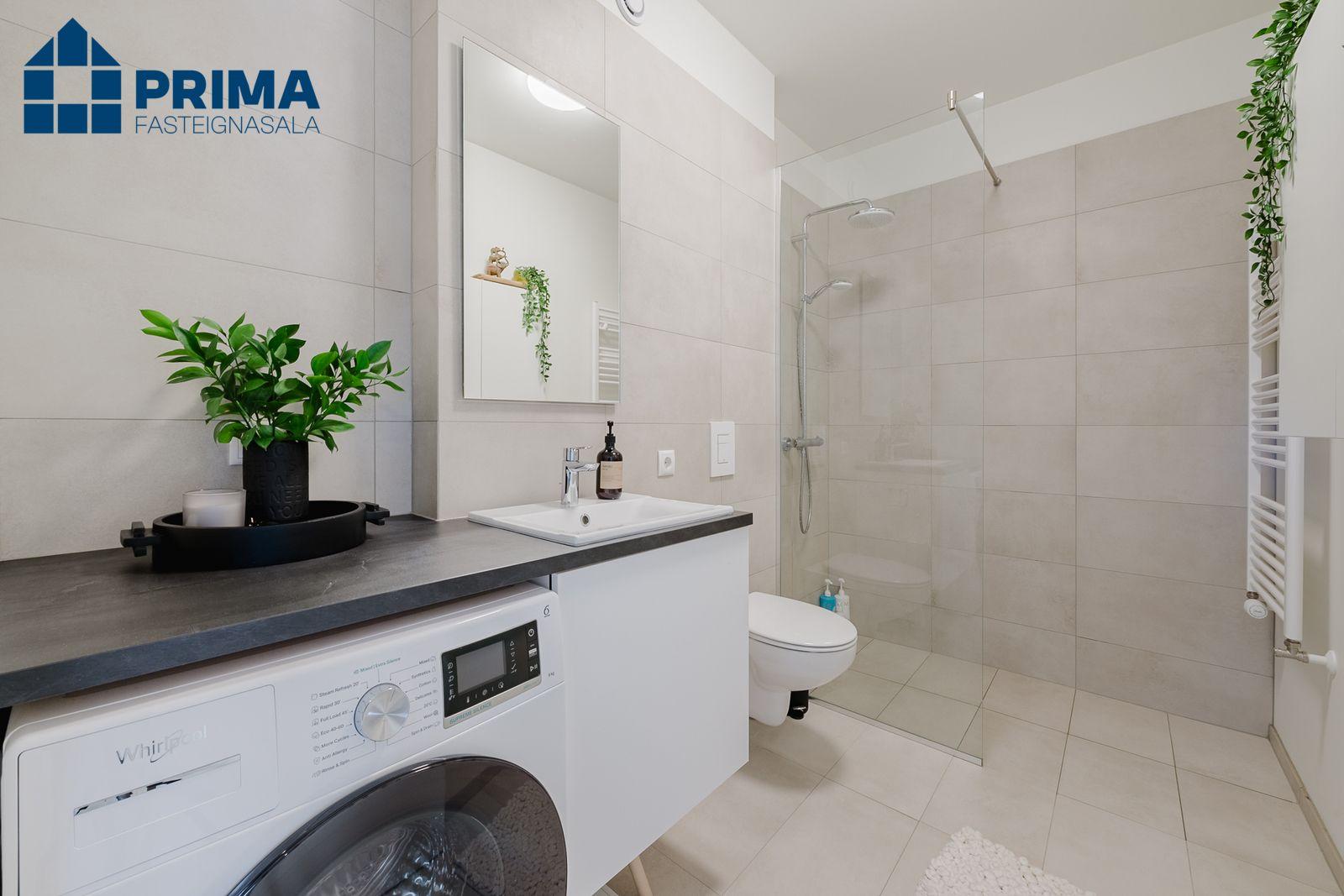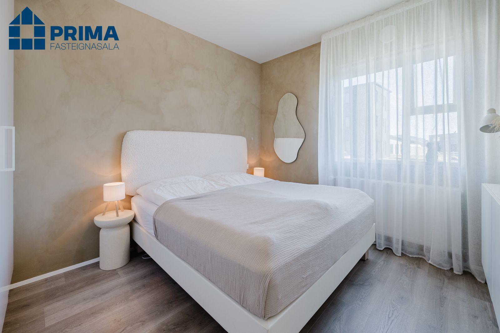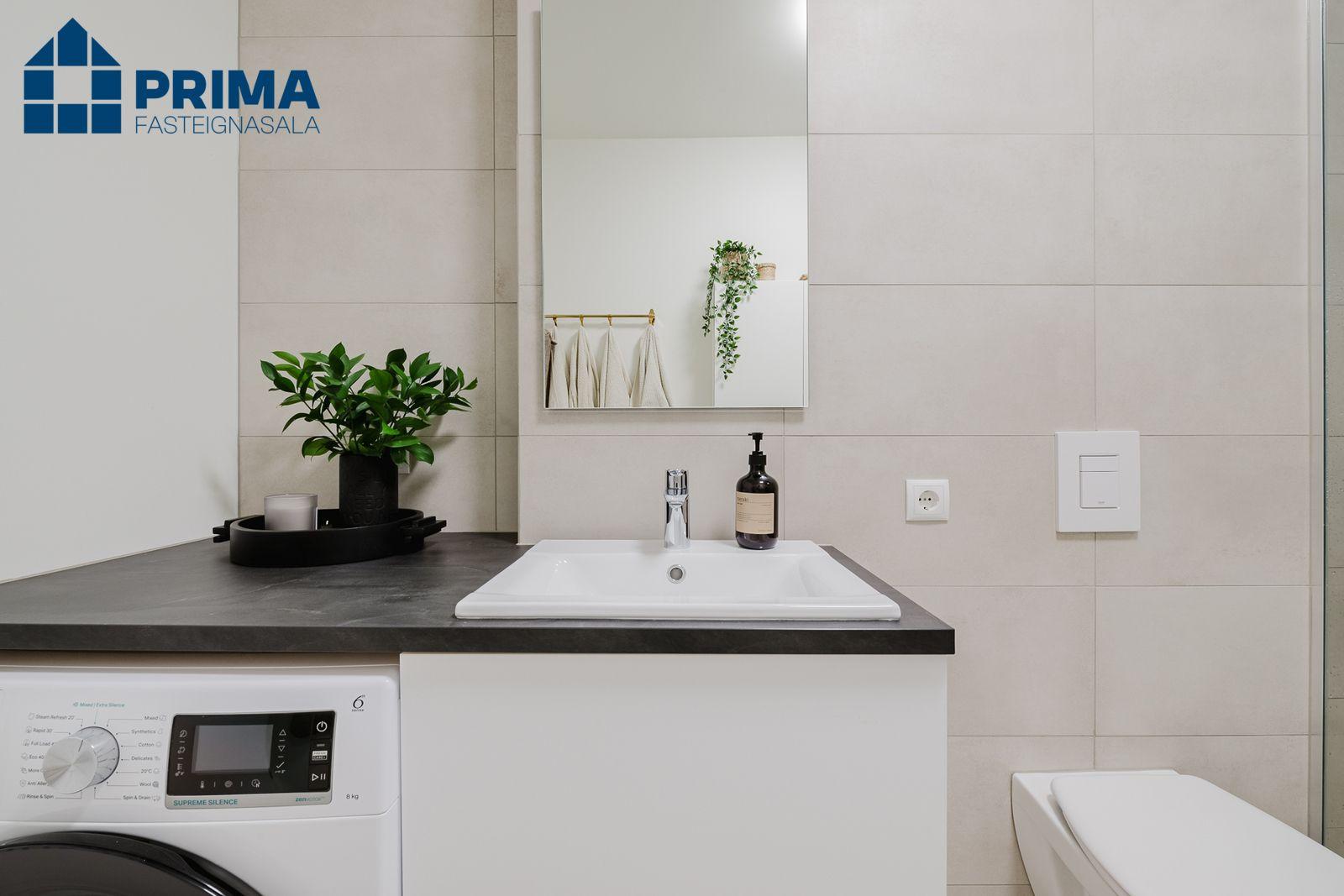 Baðherbergi: flísar á gólfi og veggjum. Vegghengt salerni, rúmgott sturtuhorn með glervegg og falleg innrétting. Tengi fyrir þvottavél.