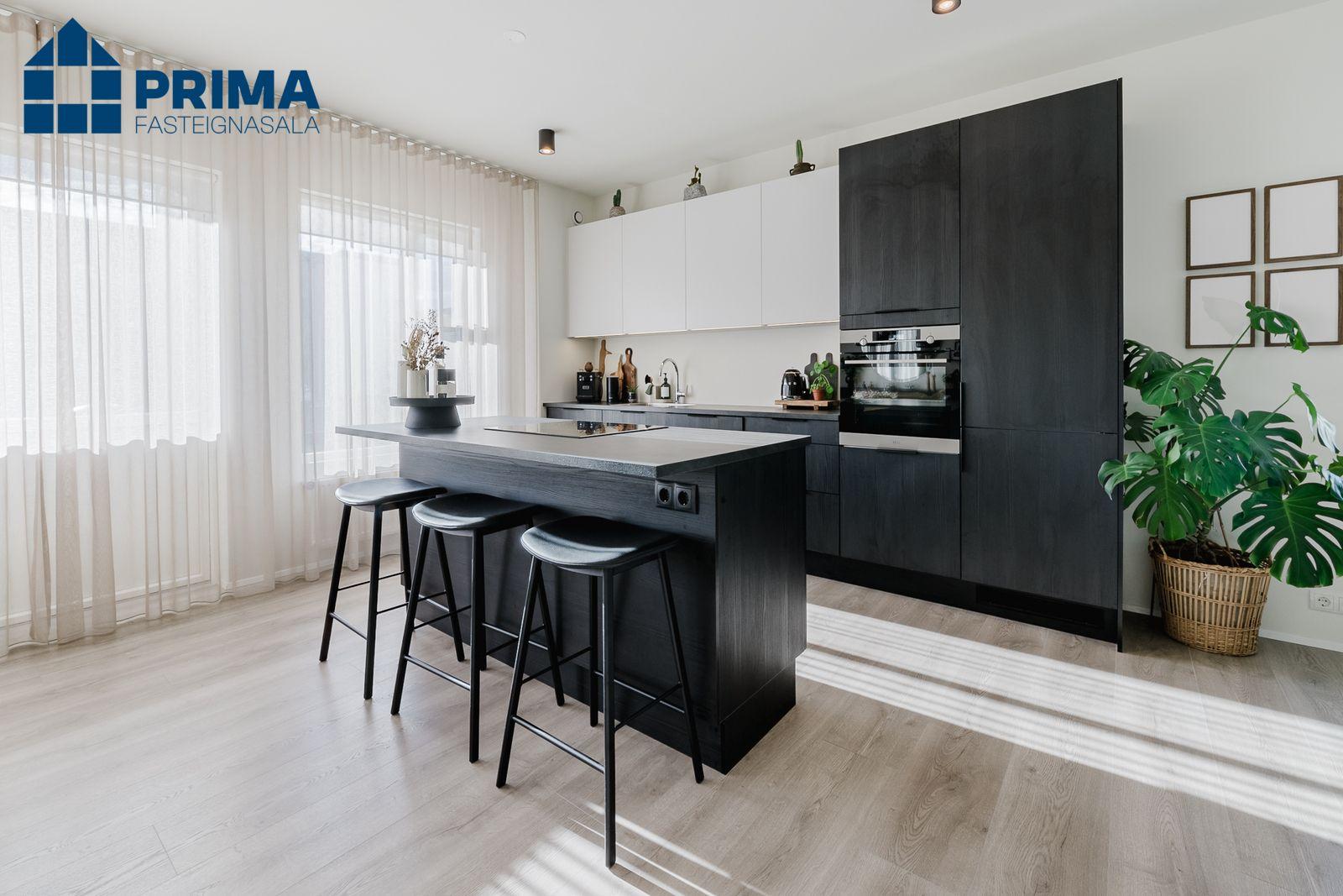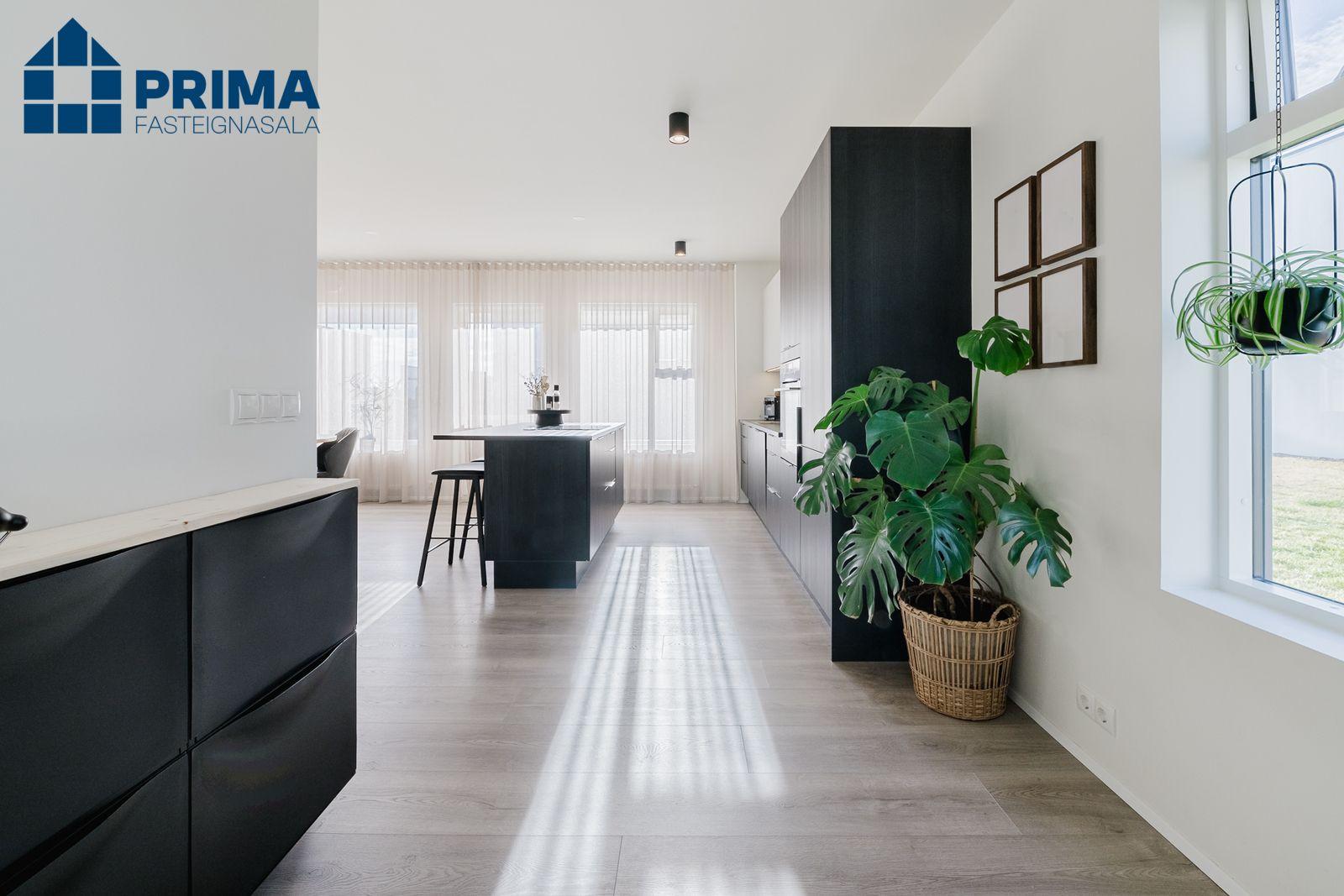 Innréttingar eru frá Ormsson og heimilistæki. Parket á gólf og innihurðir frá Birgisson, flísar frá Álfaborg, hreinlætistæki frá BYKO.
