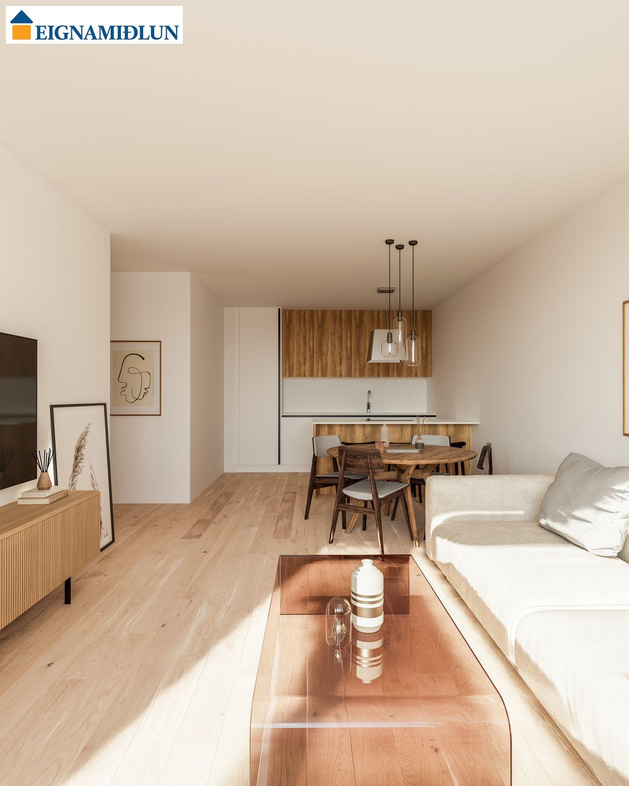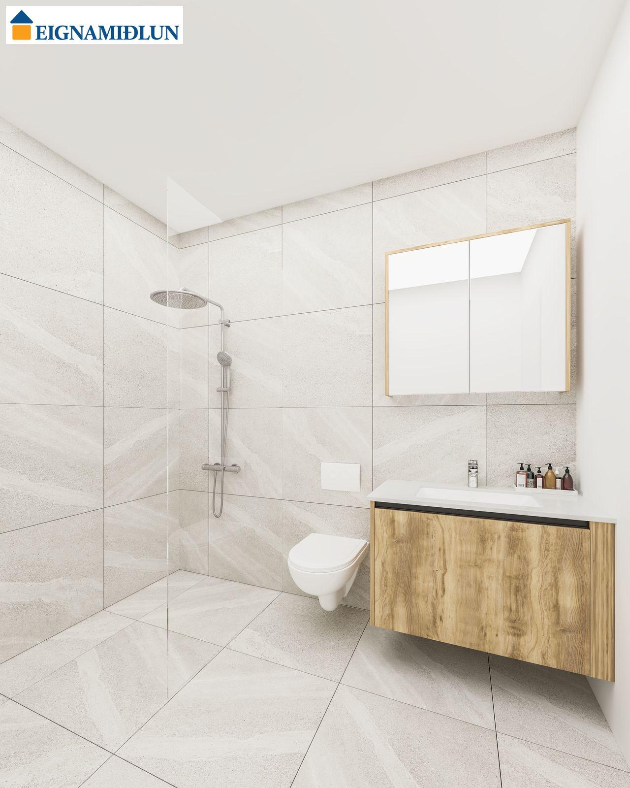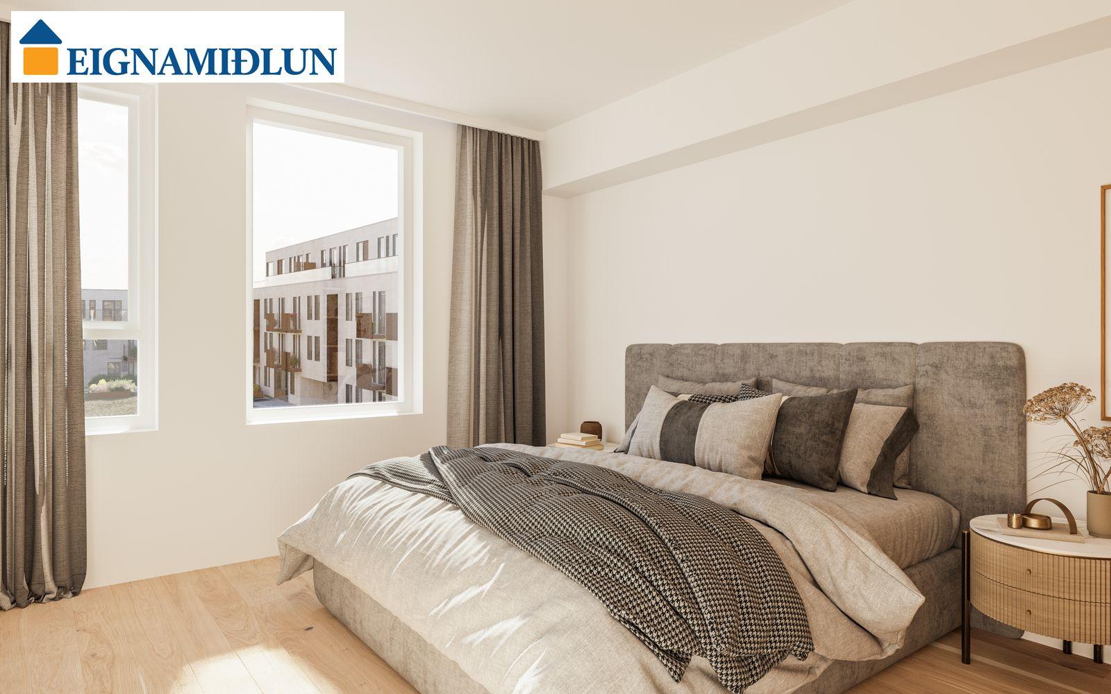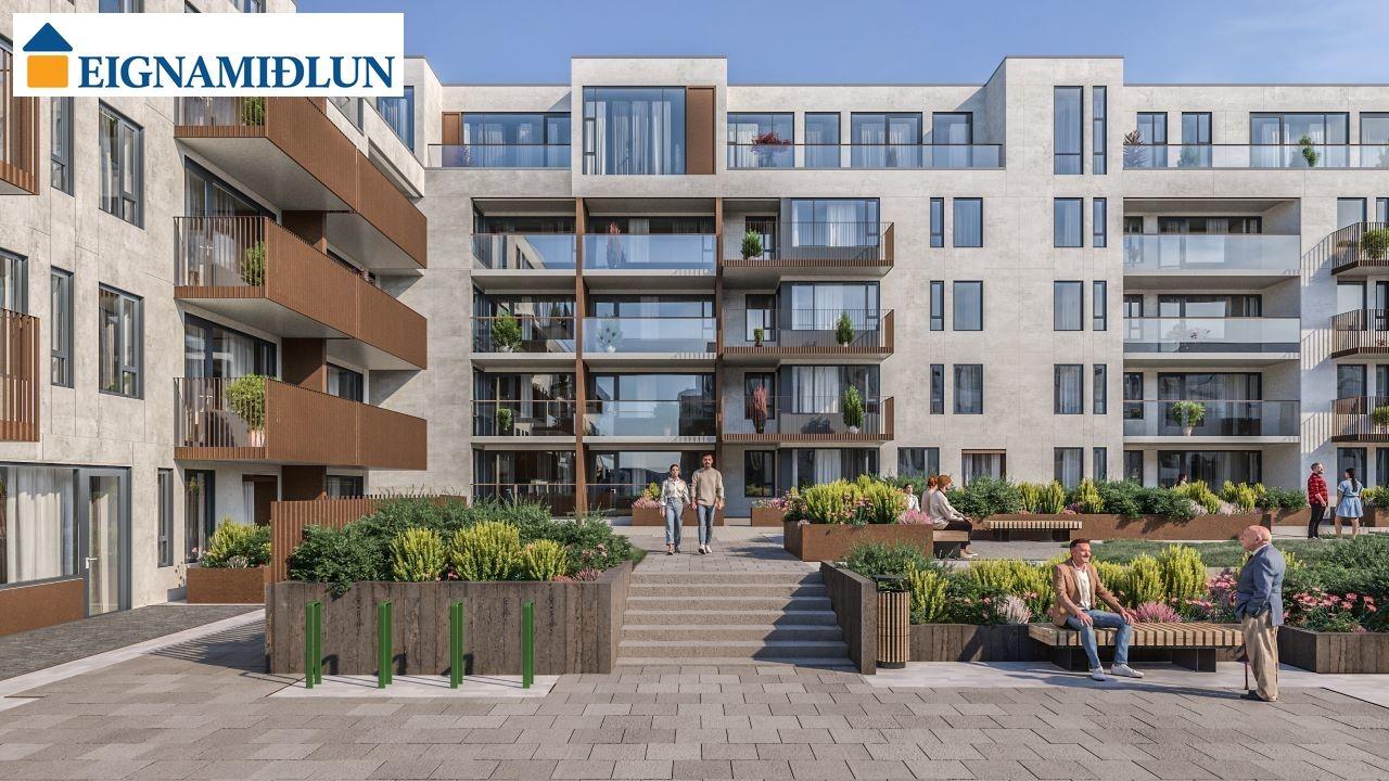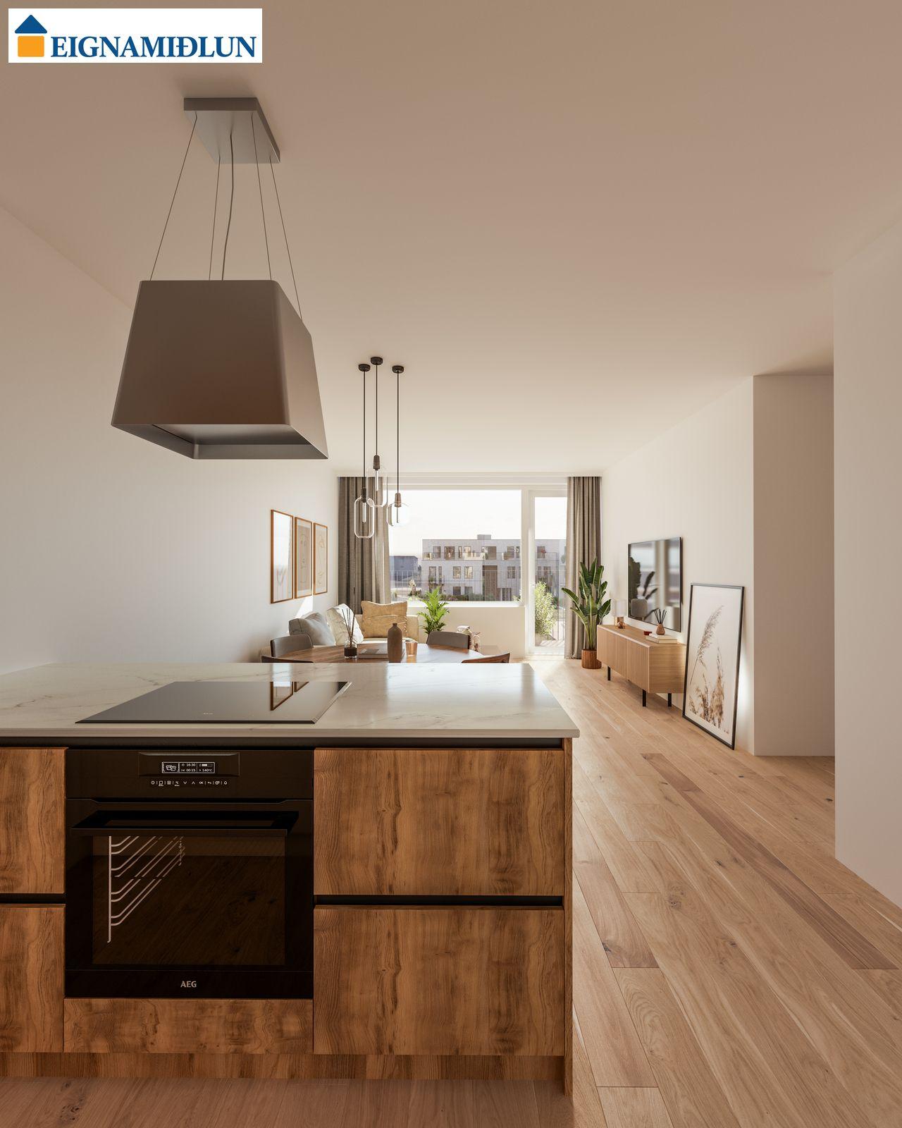 INNRÉTTINGAR: Eldhúsinnréttingar eru sérsmíðaðar frá Selós. Skápar eru úr vönduðu stitsterku melamin efni. Vönduð heimilistæki eru í íbúðum sem eru frá AEG. Kæli-/frystiskápur og uppþvottavél eru innbyggð í innréttinguna og spanhelluborð. Dekton – Rem steinborðplötur eru í öllum eldhúsum og Silestone – Nolita steinborðplötur eru á böðum. Gólfhiti er í gólfi baðherbergis auk handklæðaofns. Bílastæði í kjallara fylgja öllum íbúðum og möguleiki er á að kaupa viðbótarstæði.