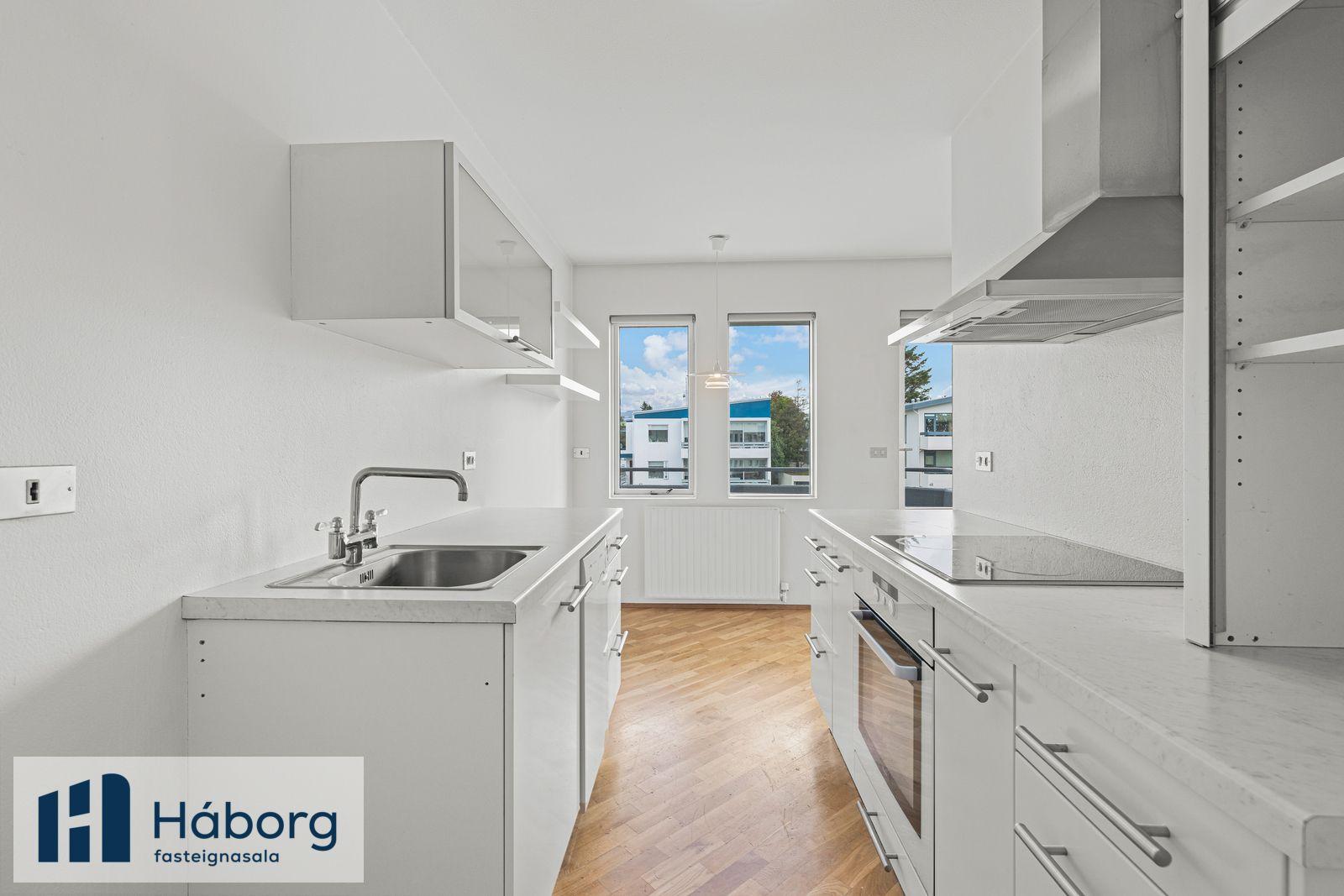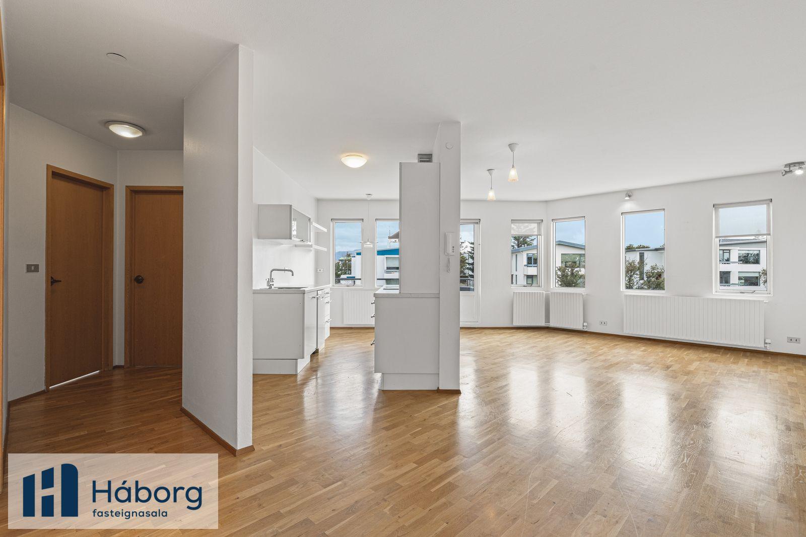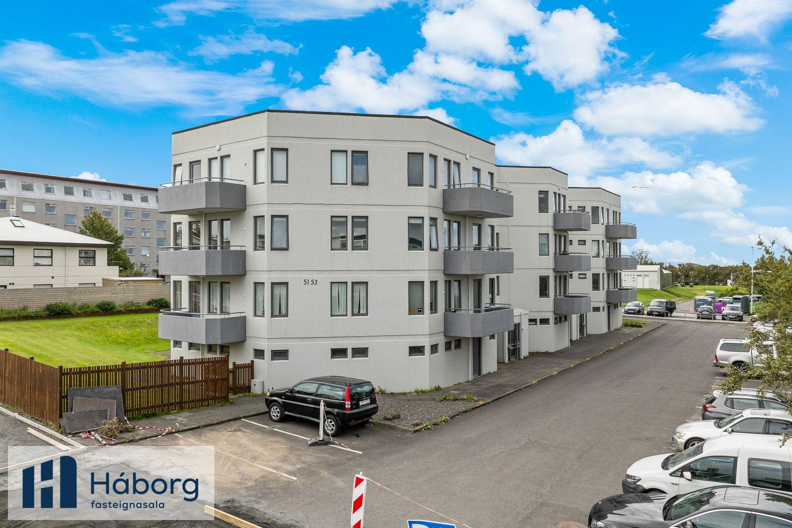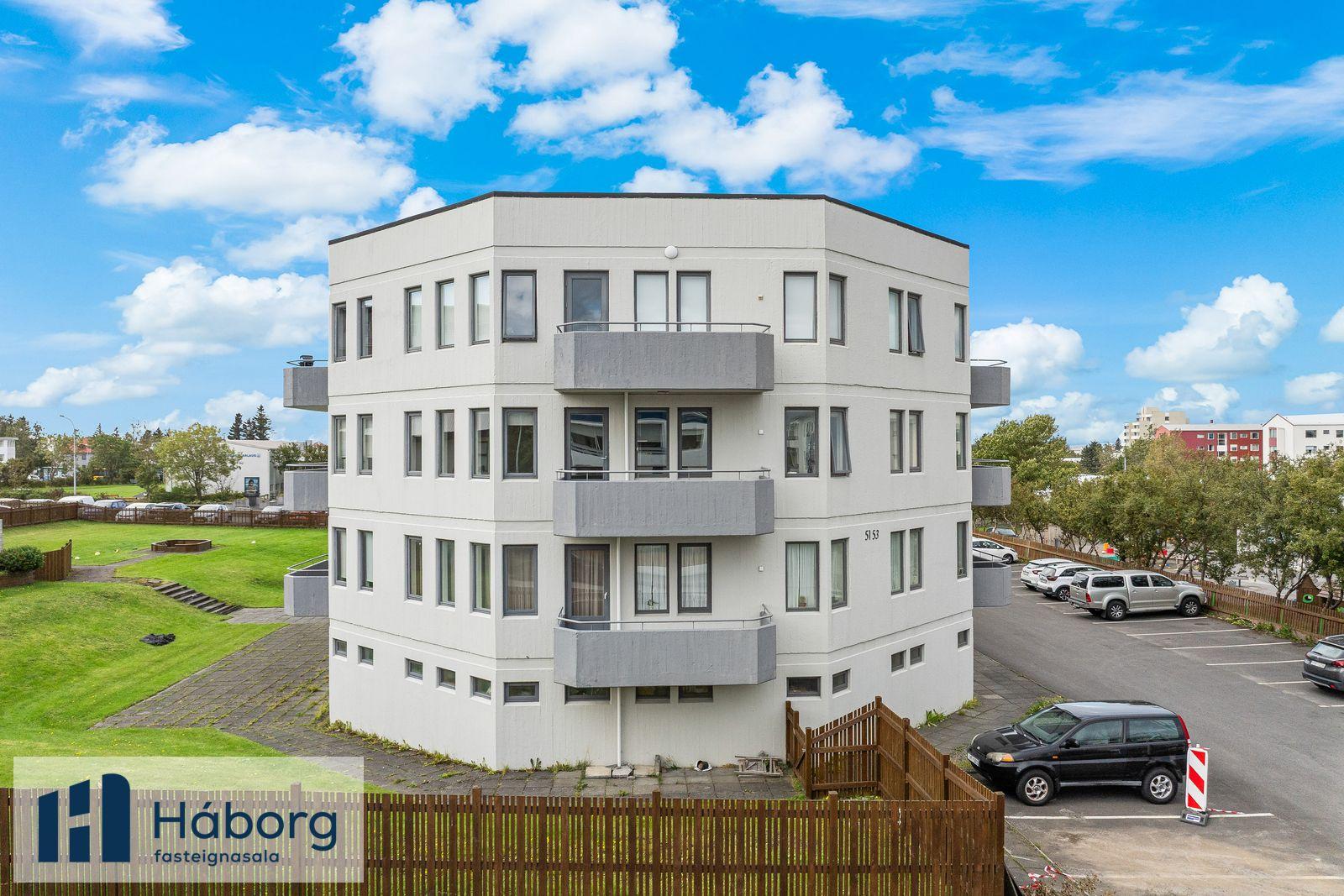 Byggingin er einstaklega heillandi mynduð úr þremur sextrendingum sem gefur mjög gott birtuflæði. Íbúðin er á 2. hæð merkt 51 B 2 H skv.eignaskiptayfirlýsingu og 302 skv. fasteignaskrá. Teikningin er opin og skemmtileg með stórum gluggaflötum. Komið er í opna fostofu með góðum skápum og þaðan beint í bjart og skemmtilegt alrými með hálfopnu eldhúsi með góðum eldhúskrók. Þaðan er gengið út á svalir til austurs og norðurs. Á vinstri hönd úr forstofu er baðherbergi með aðstöðu fyrir þvottavél og baðkeri. Næst er hjónaherbergi með góðum skápum og þar við hliðina barnaherbergi. Innréttingar og gólfefni íbúðarinnar eru upprunaleg. Sameignin er snyrtileg.