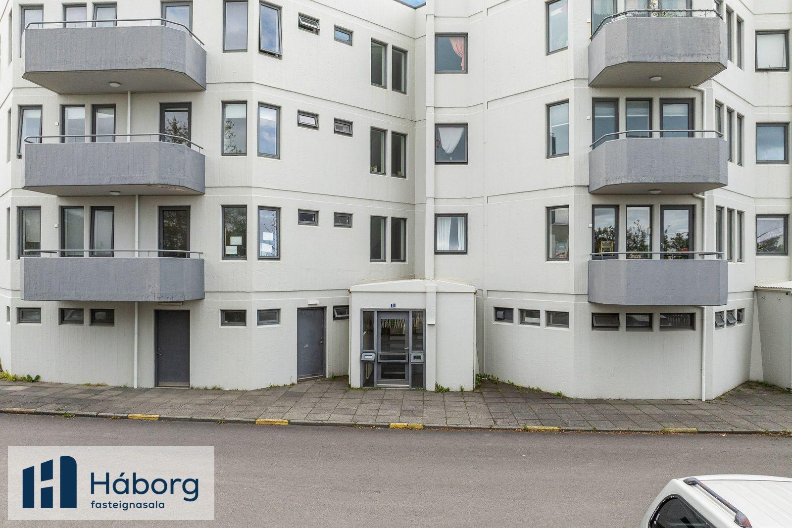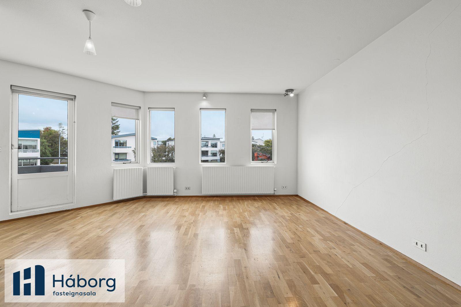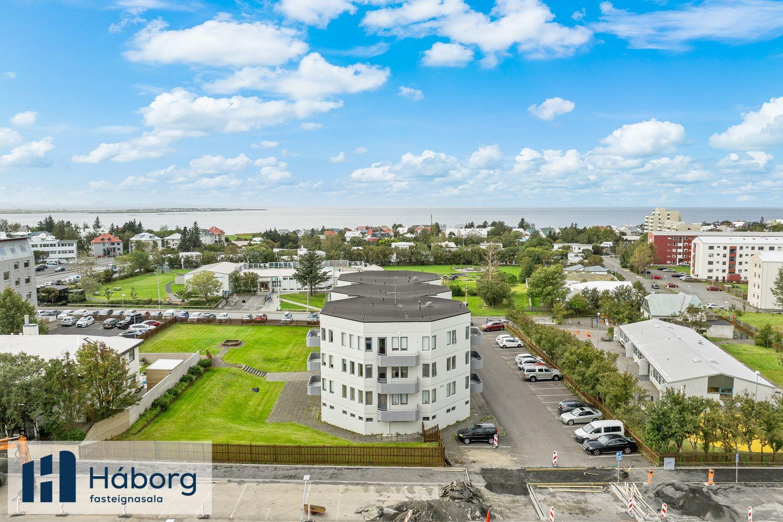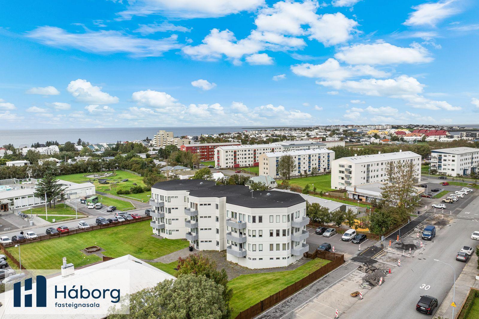 Byggingin er einstaklega heillandi mynduð úr þremur sextrendingum sem gefur mjög gott birtuflæði. Íbúðin er á 2. hæð merkt 51 B 2 H skv.eignaskiptayfirlýsingu og 302 skv. fasteignaskrá. Teikningin er opin og skemmtileg með stórum gluggaflötum. Komið er í opna fostofu með góðum skápum og þaðan beint í bjart og skemmtilegt alrými með hálfopnu eldhúsi með góðum eldhúskrók. Þaðan er gengið út á svalir til austurs og norðurs. Á vinstri hönd úr forstofu er baðherbergi með aðstöðu fyrir þvottavél og baðkeri. Næst er hjónaherbergi með góðum skápum og þar við hliðina barnaherbergi. Innréttingar og gólfefni íbúðarinnar eru upprunaleg. Sameignin er snyrtileg.