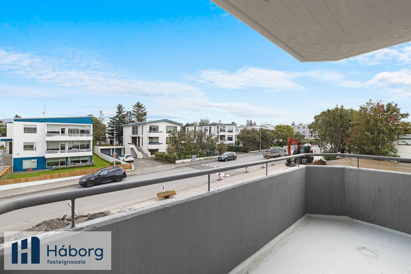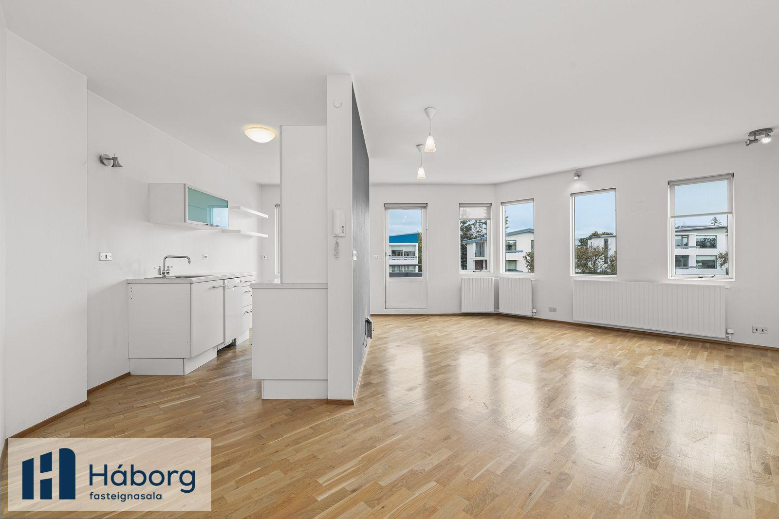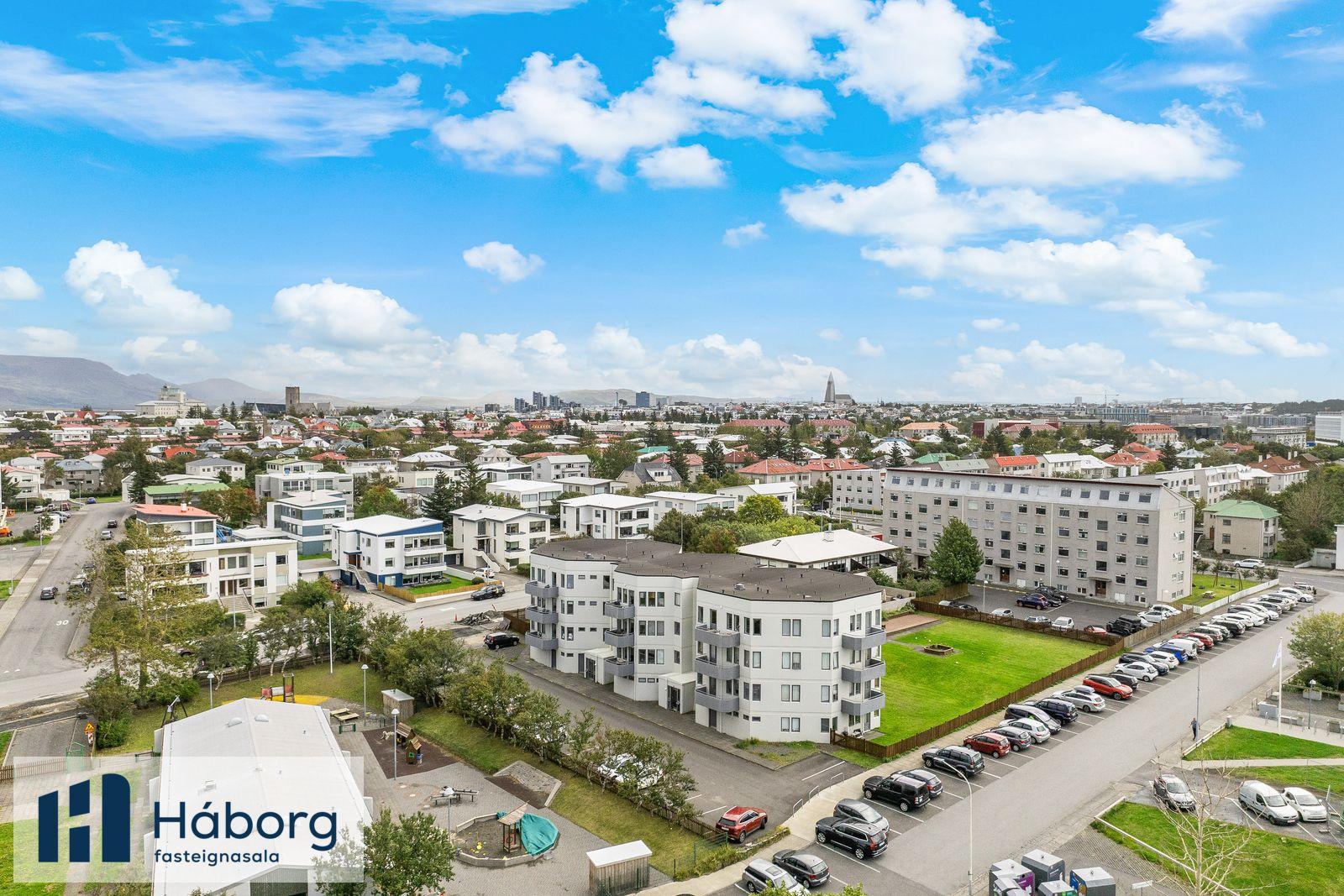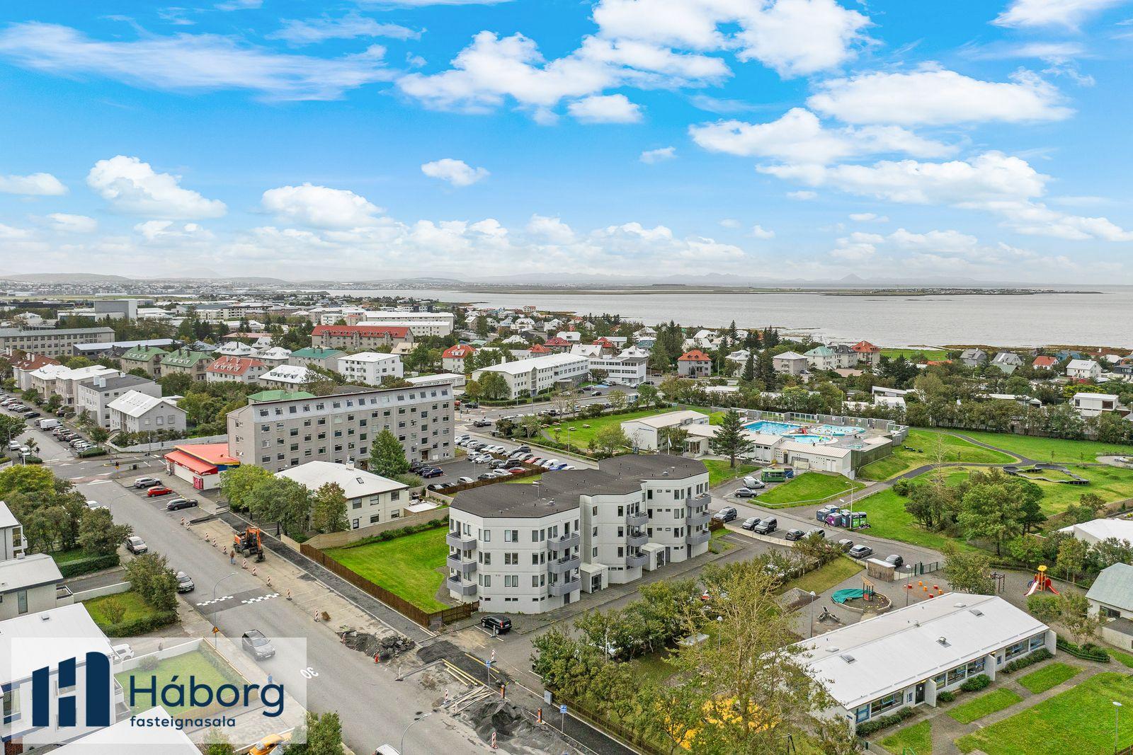Byggingin er einstaklega heillandi mynduð úr þremur sextrendingum sem gefur mjög gott birtuflæði. Íbúðin er á 2. hæð merkt 51 B 2 H skv.eignaskiptayfirlýsingu og 302 skv. fasteignaskrá. Teikningin er opin og skemmtileg með stórum gluggaflötum. Komið er í opna fostofu með góðum skápum og þaðan beint í bjart og skemmtilegt alrými með hálfopnu eldhúsi með góðum eldhúskrók. Þaðan er gengið út á svalir til austurs og norðurs. Á vinstri hönd úr forstofu er baðherbergi með aðstöðu fyrir þvottavél og baðkeri. Næst er hjónaherbergi með góðum skápum og þar við hliðina barnaherbergi. Innréttingar og gólfefni íbúðarinnar eru upprunaleg. Sameignin er snyrtileg.