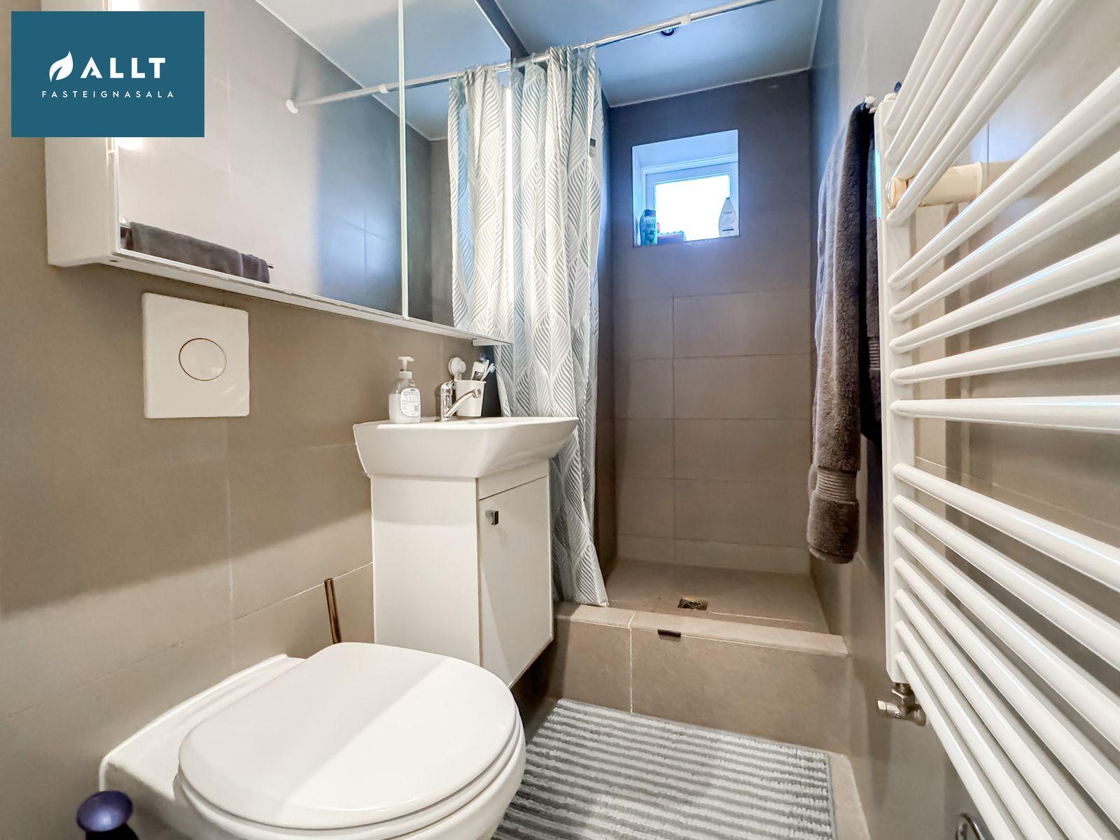 Baðherbergi hefur verið endurnýjað. Upphengt salernig, handklæðaofn, flísalögð sturta og vaskakápur með stórum speglaskáp fyrir ofan.