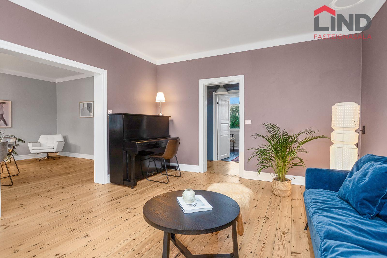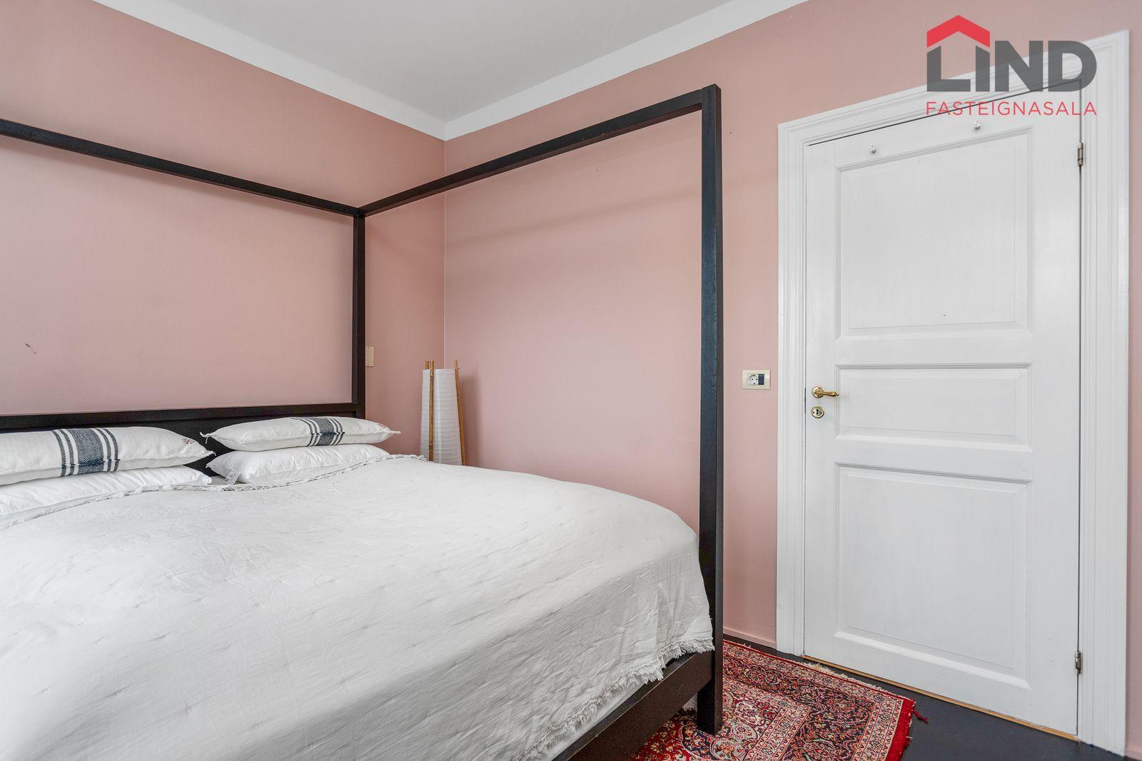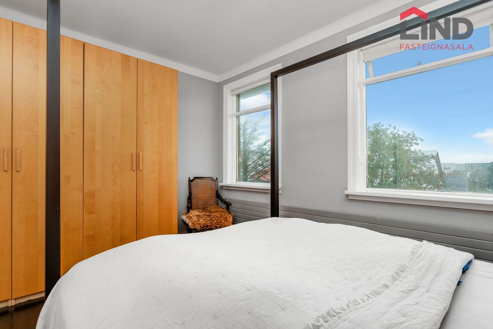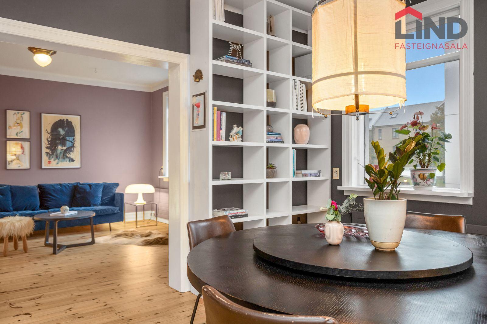Nánari lýsing: · Gangur/forstofa: Með skápum. · Stofa: Parket á gólfi og stórir gluggar. · Borðstofa: Parket á gólfi og stórir gluggar. · Hjónaherbergi: Parket á gólfi, stórir gluggar og fataskápur. · Svefnherbergi II: Teppalagt gólf. · Eldhús: Rúmgott með snyrtilegri, dökkri innréttingu og stórum glugga. · Baðherbergi: Bjart, flísalagt að hluta með terrazzo gólfi, baðkari með sturtuaðstöðu og nýlegum blöndunartækjum. · Á gangi er lítil geymsla / fataherbergi. Í sameign: · Sérgeymsla. · Sameiginlegt þvottahús. · Þurrkherbergi. · Lóð með afgirtum sameiginlegum palli. Helstu endurbætur og viðhald síðustu ára: · 2012: Skipt um neyslulagnir í eldhúsi og baðherbergi. Baðherbergi gert upp (nýtt WC, blöndunartæki og vaskur frá Parka). Eldhús endurnýjað. Nýtt parket lagt á gang, stofur og eldhús. · 2021: Ný blöndunartæki sett í eldhús. · 2022: Nýtt teppi lagt á barnaherbergi. Parket í stofum, eldhúsi og gangi pússað upp. Nýtt kókosteppi í forstofu. Íbúðin öll máluð. · 2023: Ný blöndunartæki sett í baðkar/sturtu. Innréttingar á baðherbergi lakkaðar. Gluggar lakkaðir að innan. Hurðakarmar lakkaðir og blettaðir eftir þörfum. Endurbætur hússins að utan: · 2021: Skipt um járn og pappa á þaki. Húsið sprunguviðgert, endursteinað og málað að utan. · 2022: Útidyrahurð pússuð upp og lökkuð. · Gluggar málaðir reglulega að utan (síðast 2022 fyrir þessa íbúð). Samkvæmt HMS er eignin skráð 108,7 fm, þar af 101,1 fm íbúð og 7,6 fm sérgeymsla í sameign. Glæsileg og björt íbúð með mikilli lofthæð á eftirsóttum stað í hjarta Reykjavíkur.