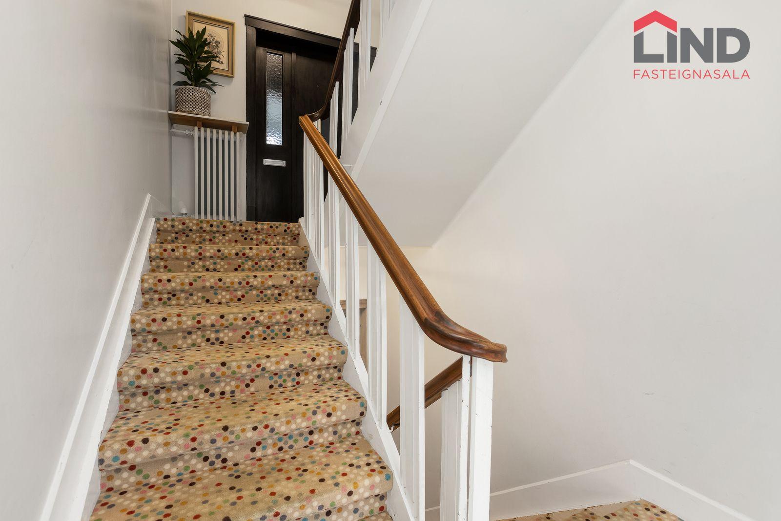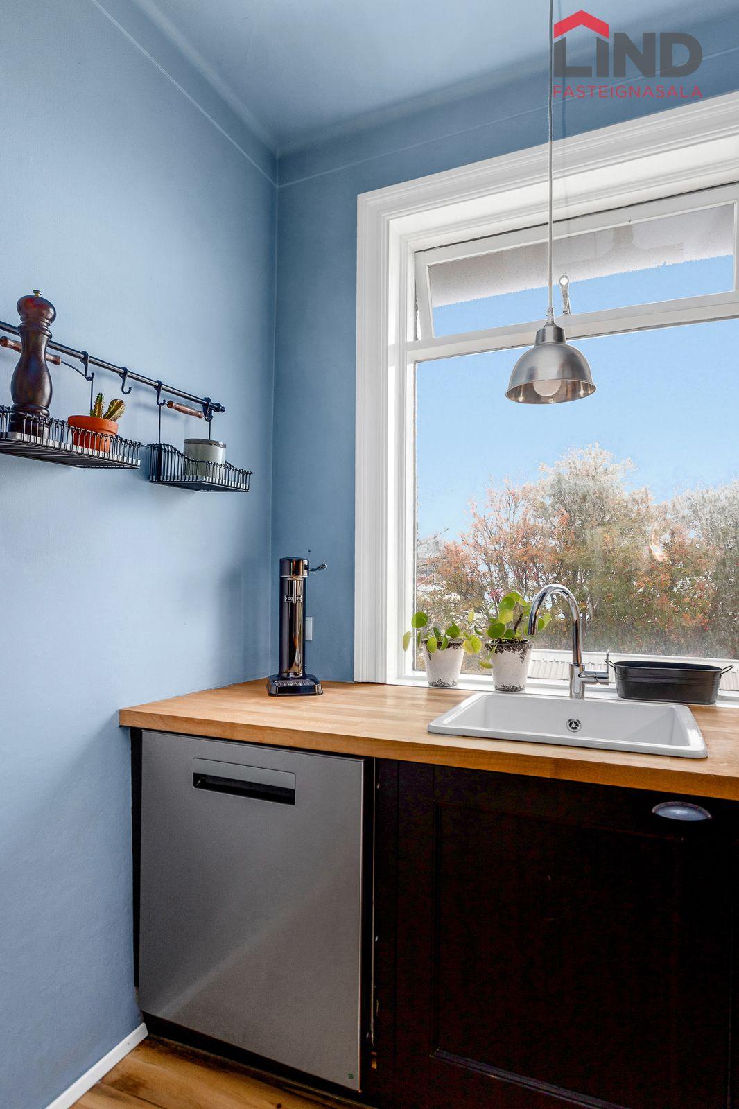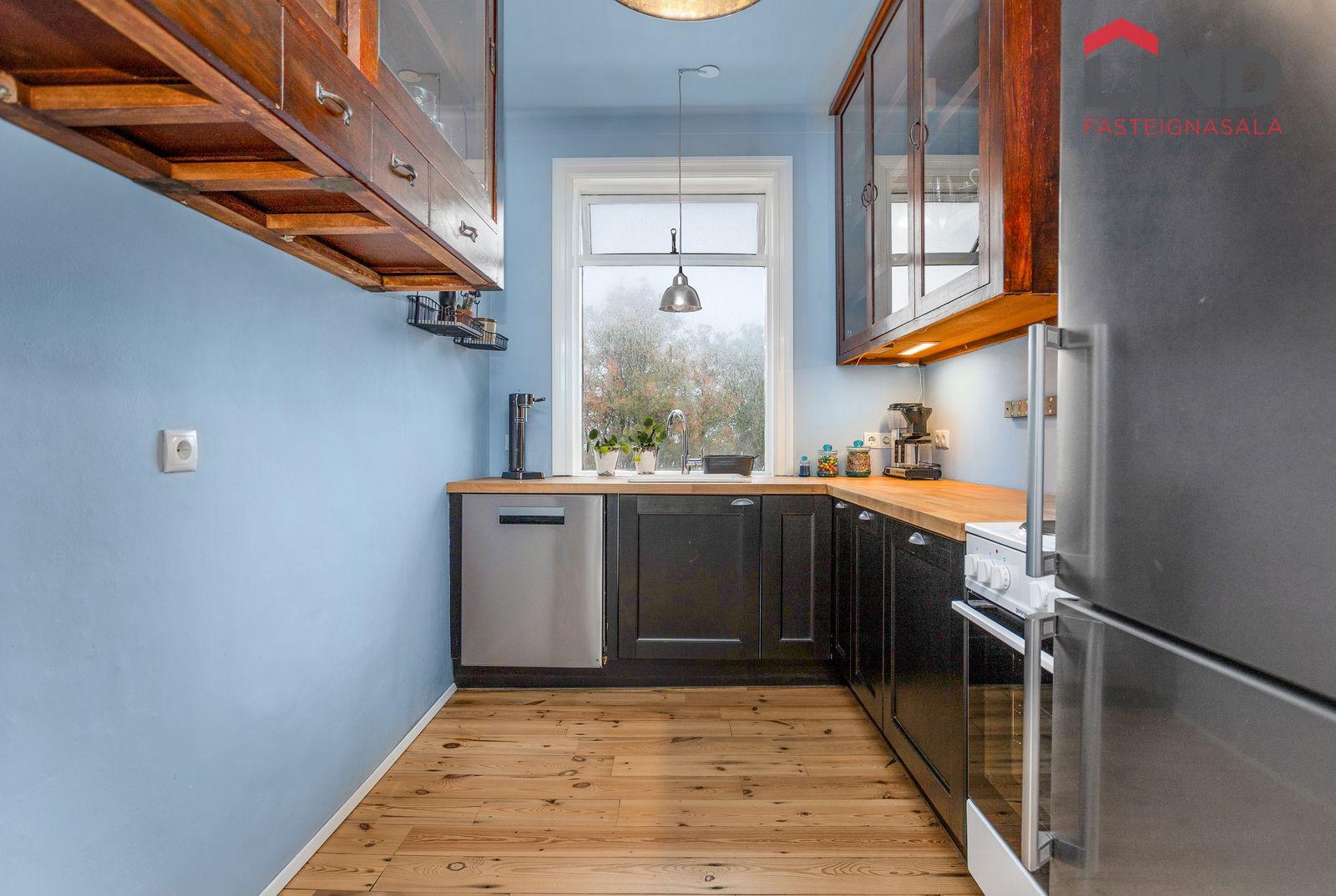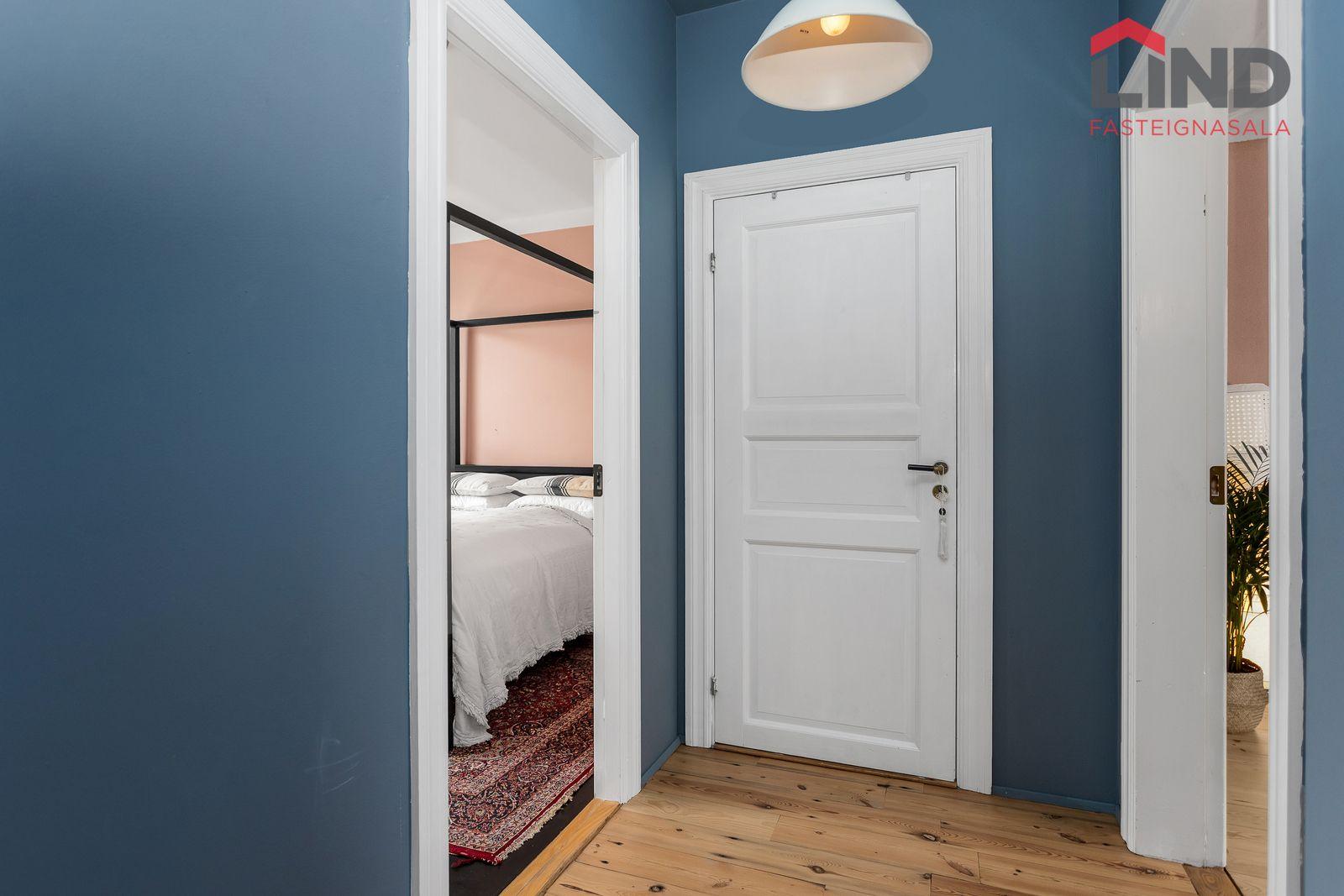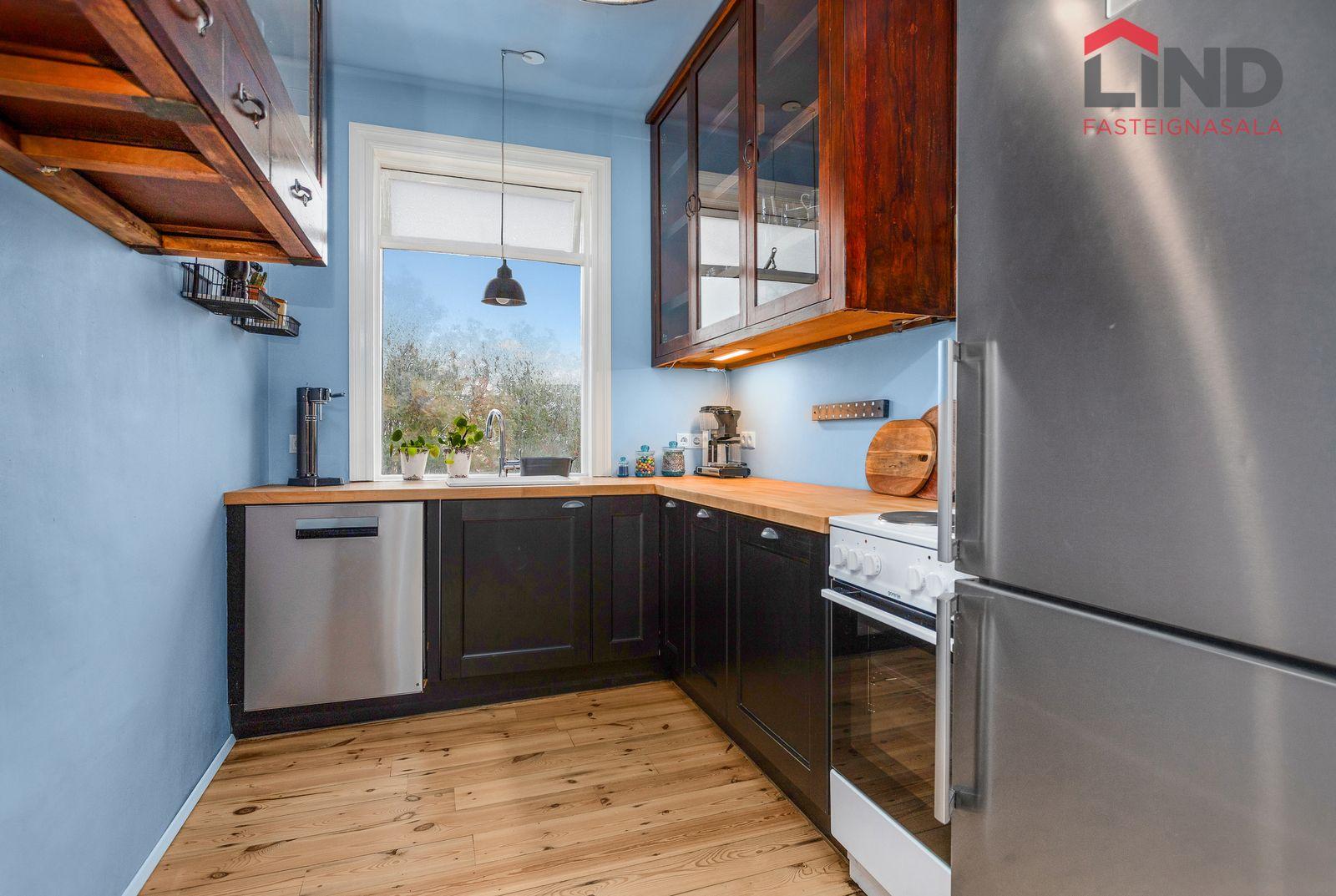 Nánari lýsing: · Gangur/forstofa: Með skápum. · Stofa: Parket á gólfi og stórir gluggar. · Borðstofa: Parket á gólfi og stórir gluggar. · Hjónaherbergi: Parket á gólfi, stórir gluggar og fataskápur. · Svefnherbergi II: Teppalagt gólf. · Eldhús: Rúmgott með snyrtilegri, dökkri innréttingu og stórum glugga. · Baðherbergi: Bjart, flísalagt að hluta með terrazzo gólfi, baðkari með sturtuaðstöðu og nýlegum blöndunartækjum. · Á gangi er lítil geymsla / fataherbergi. Í sameign: · Sérgeymsla. · Sameiginlegt þvottahús. · Þurrkherbergi. · Lóð með afgirtum sameiginlegum palli. Helstu endurbætur og viðhald síðustu ára: · 2012: Skipt um neyslulagnir í eldhúsi og baðherbergi. Baðherbergi gert upp (nýtt WC, blöndunartæki og vaskur frá Parka). Eldhús endurnýjað. Nýtt parket lagt á gang, stofur og eldhús. · 2021: Ný blöndunartæki sett í eldhús. · 2022: Nýtt teppi lagt á barnaherbergi. Parket í stofum, eldhúsi og gangi pússað upp. Nýtt kókosteppi í forstofu. Íbúðin öll máluð. · 2023: Ný blöndunartæki sett í baðkar/sturtu. Innréttingar á baðherbergi lakkaðar. Gluggar lakkaðir að innan. Hurðakarmar lakkaðir og blettaðir eftir þörfum. Endurbætur hússins að utan: · 2021: Skipt um járn og pappa á þaki. Húsið sprunguviðgert, endursteinað og málað að utan. · 2022: Útidyrahurð pússuð upp og lökkuð. · Gluggar málaðir reglulega að utan (síðast 2022 fyrir þessa íbúð). Samkvæmt HMS er eignin skráð 108,7 fm, þar af 101,1 fm íbúð og 7,6 fm sérgeymsla í sameign. Glæsileg og björt íbúð með mikilli lofthæð á eftirsóttum stað í hjarta Reykjavíkur.